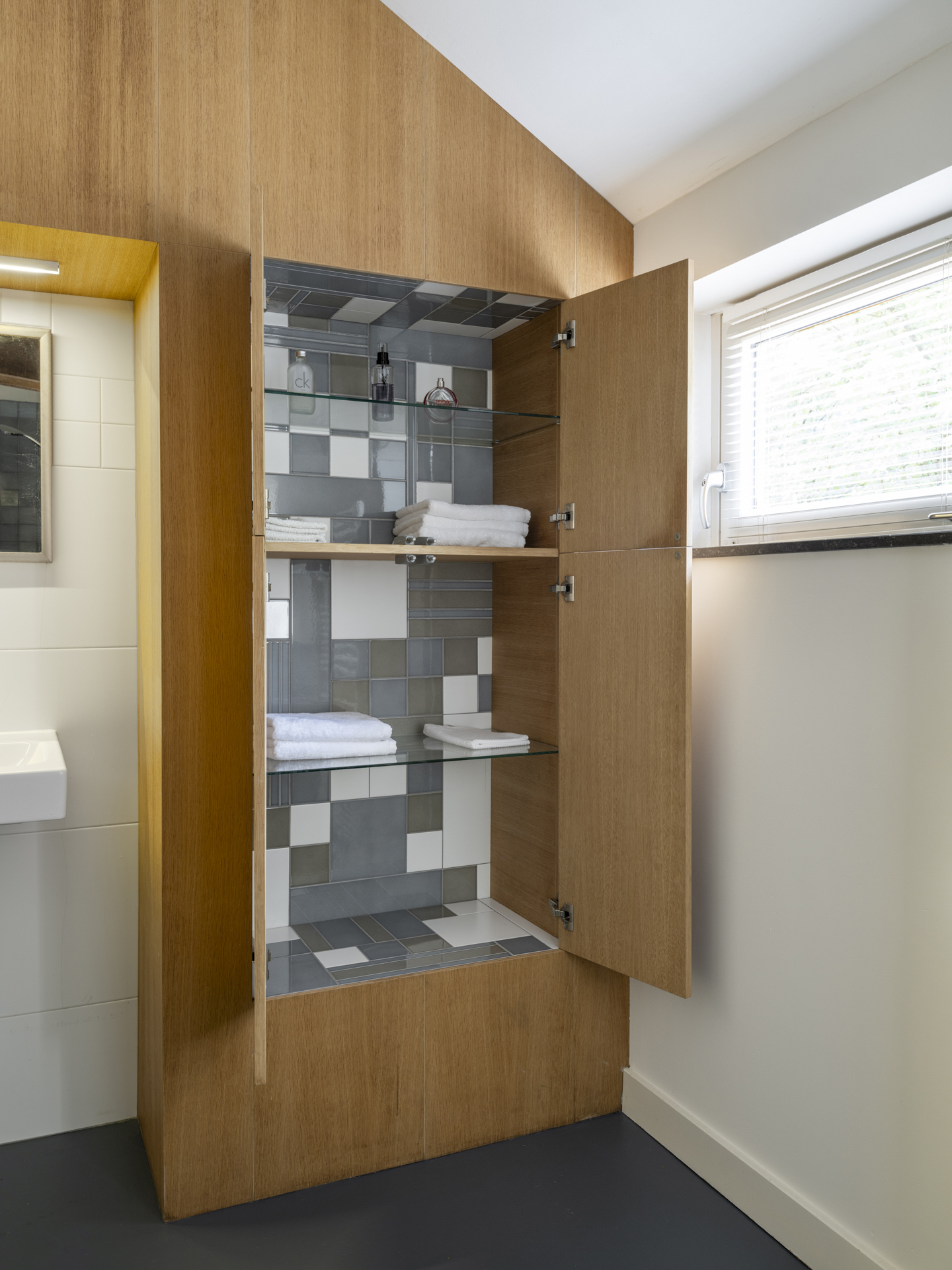 In de wandkast is o.a. de groepenkast (8 groepen, meerdere krachtgroepen + aardlekschakelaar) geplaatst.