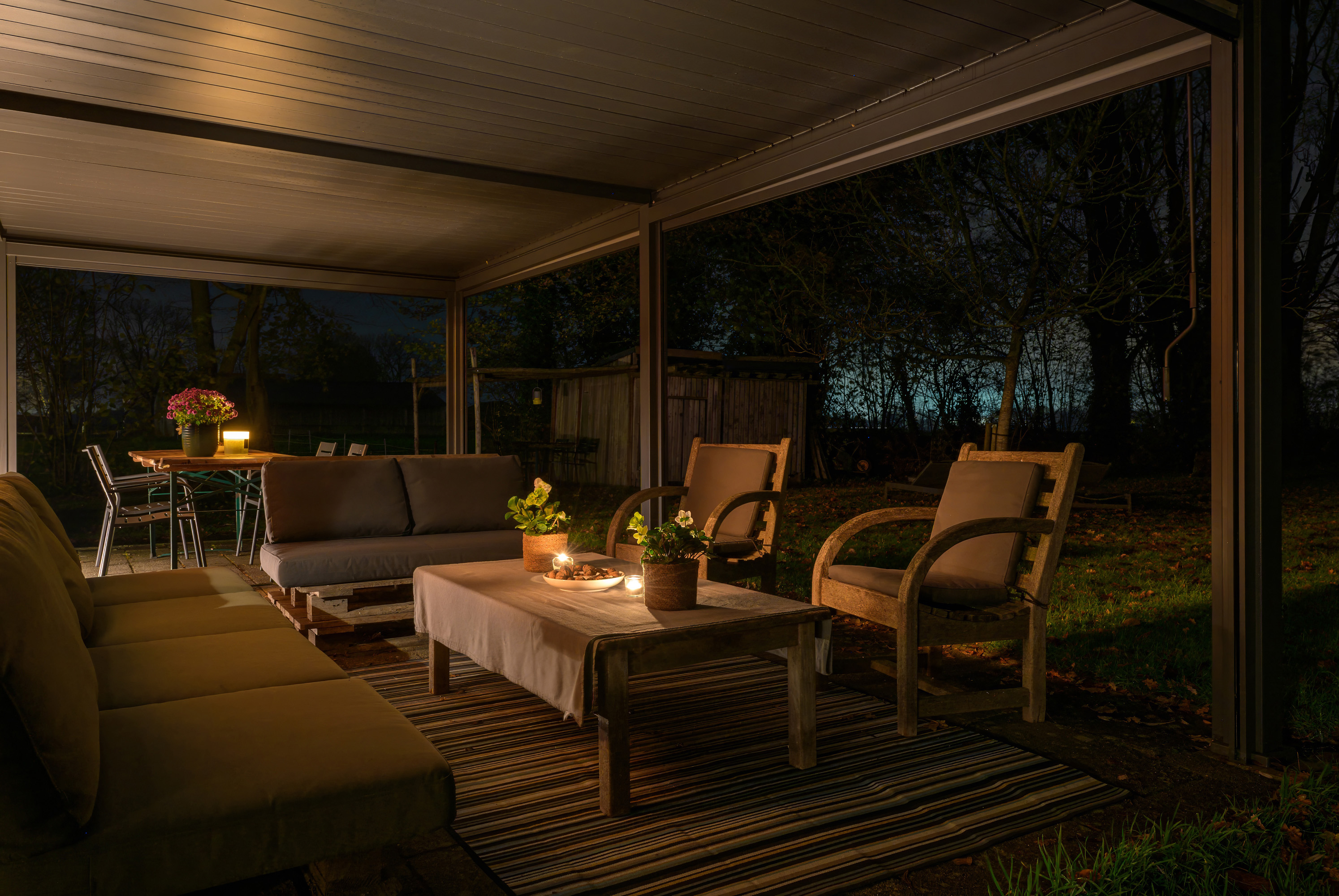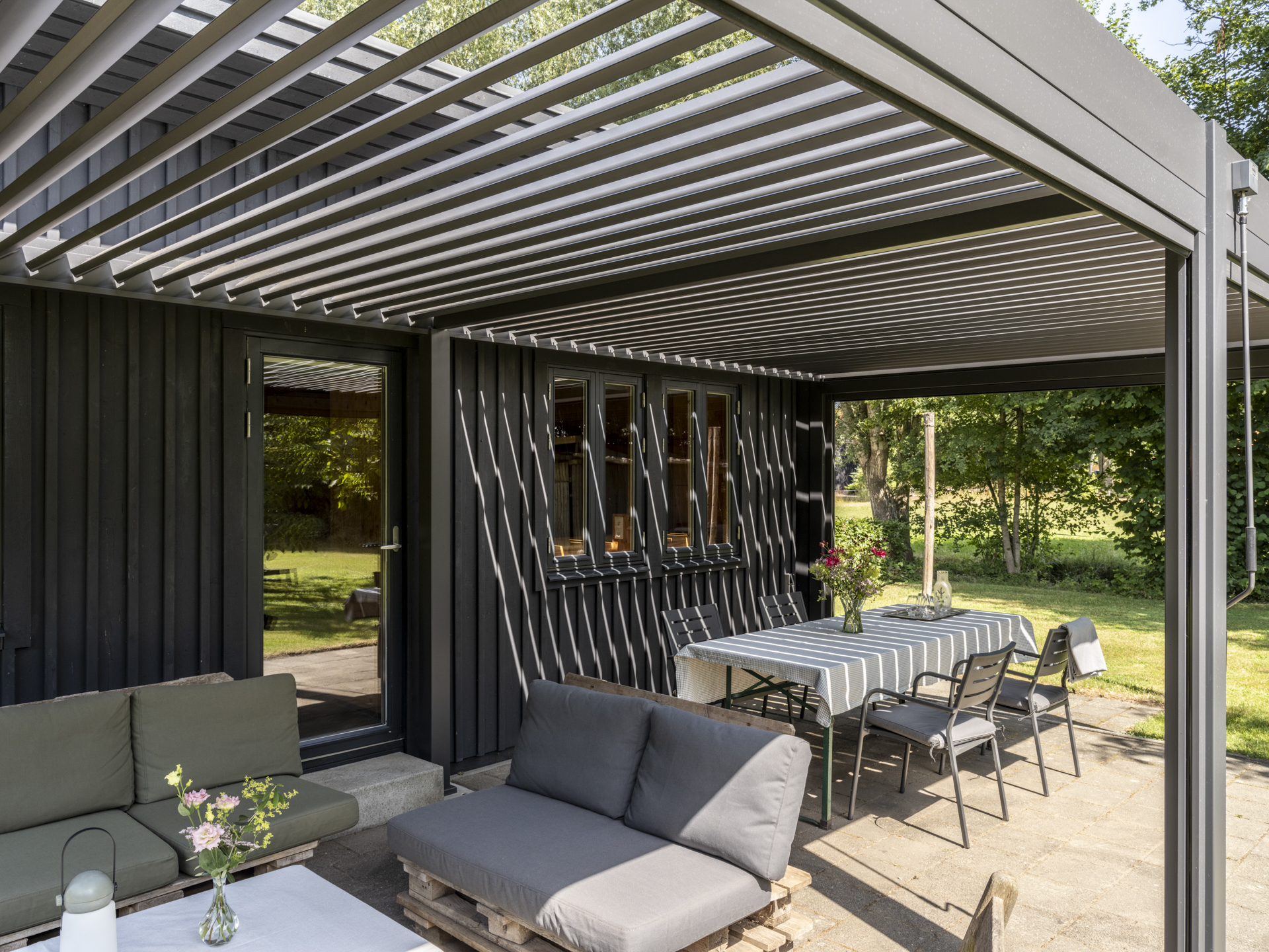 Aan dit bijgebouw is in 2025 een zeer degelijke overkapping geplaatst, een heerlijk verlengstuk van de leefruimte in de tuin. Het dak is te openen en sluiten (een lamellen-systeem), zowel voor lichttoetreding als bescherming tegen regen. Tevens is de overkapping voorzien van uitschuifbare windschermen.