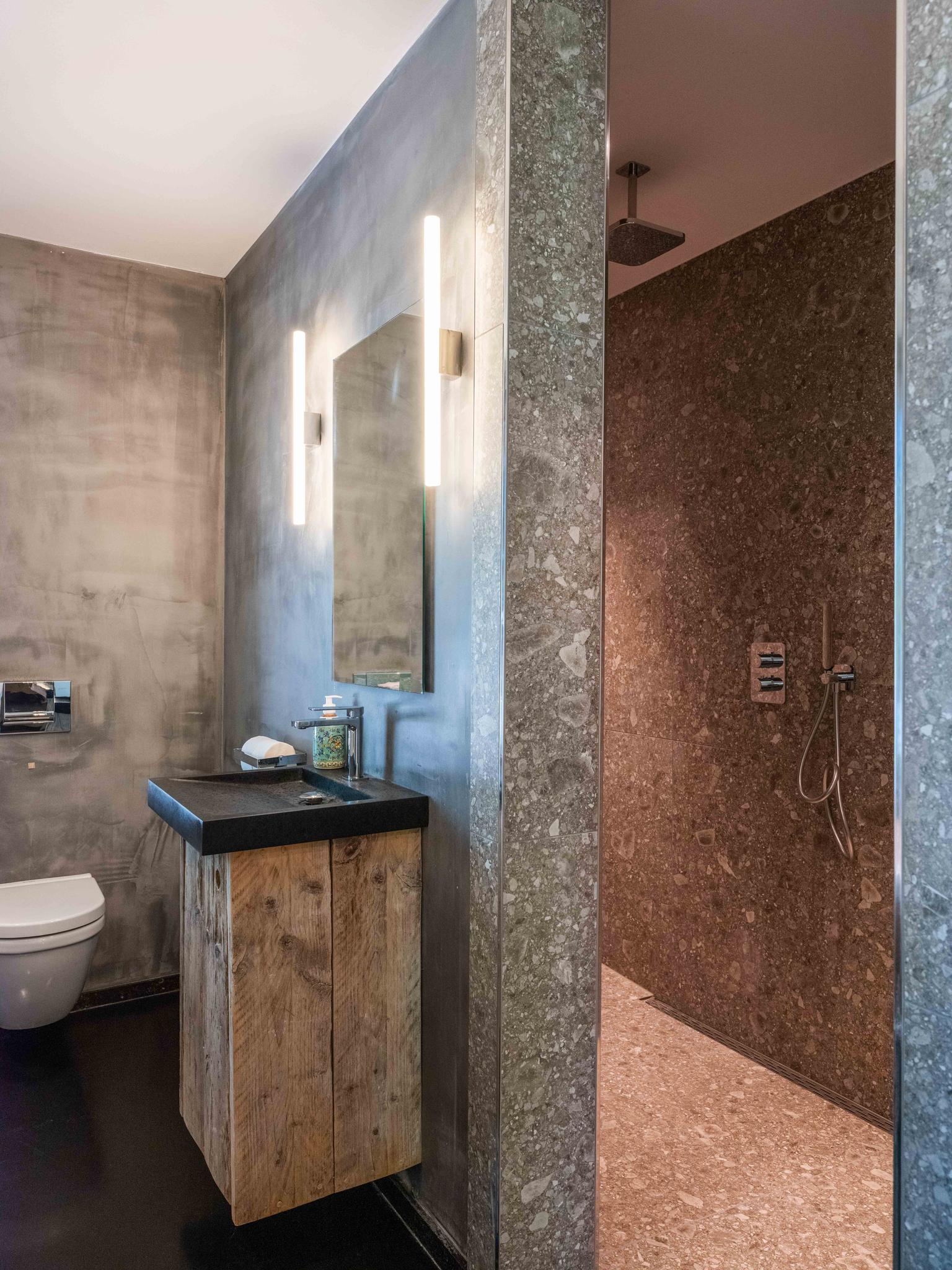 Bij het betreden van deze woonboerderij komt u aan de voorzijde in een ruime hal die toegang biedt tot de eerste slaapkamer aan de linkerzijde en aan de rechterzijde een tweede slaap- of werkkamer met een naastgelegen badkamer. De kamer naast de badkamer biedt veel flexibiliteit en kan zowel als werkruimte of als slaapkamer worden gebruikt. De badkamer is voorzien van een ligbad, toilet, wastafel en een inloopdouche. In de hal bevindt zich verder de meterkast.