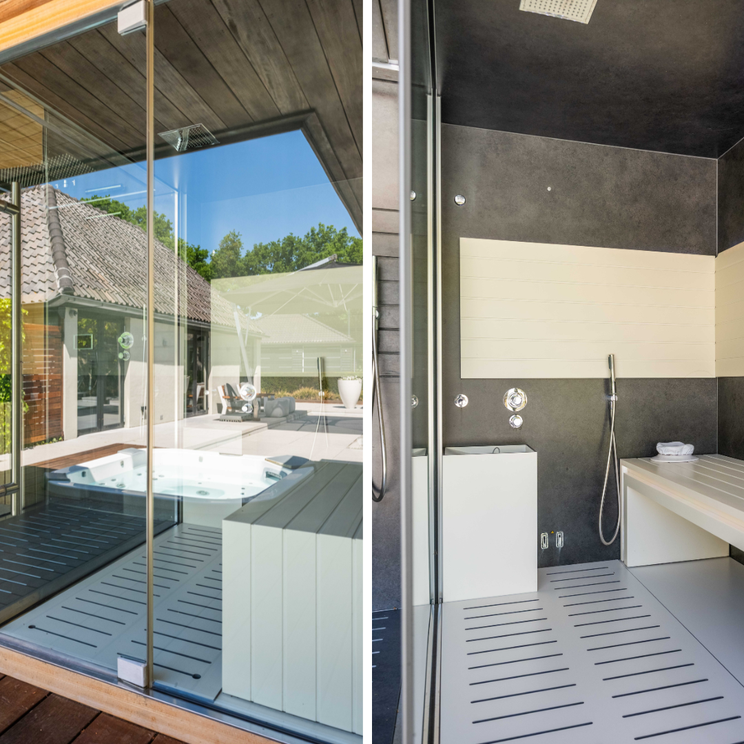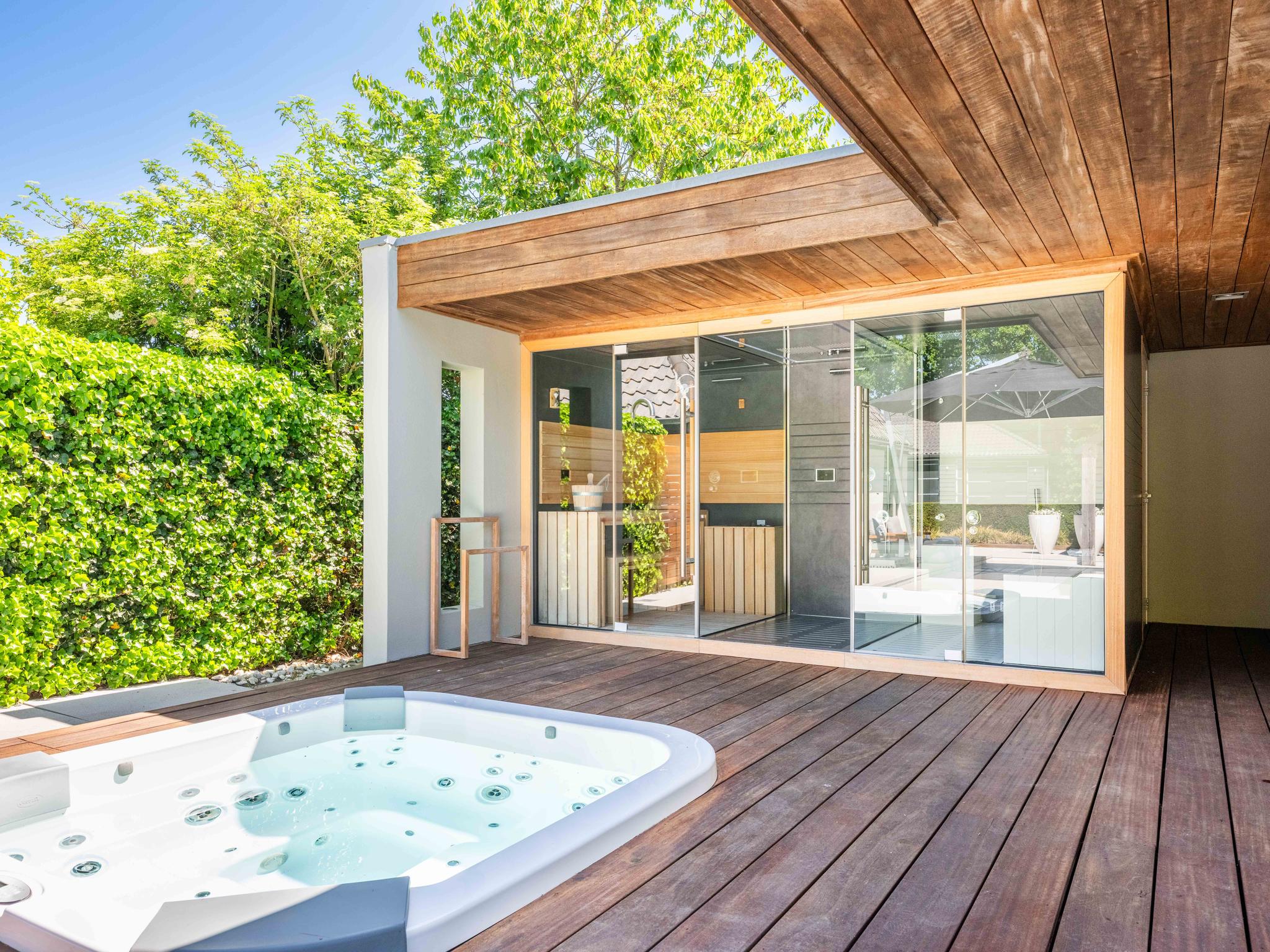 Naast de garage bevindt zich een bijgebouw dat over verschillende faciliteiten beschikt en voor diverse doeleinden gebruikt kan worden. Dit huisje biedt tevens een prachtig uitzicht over de kavel en het zwembad.