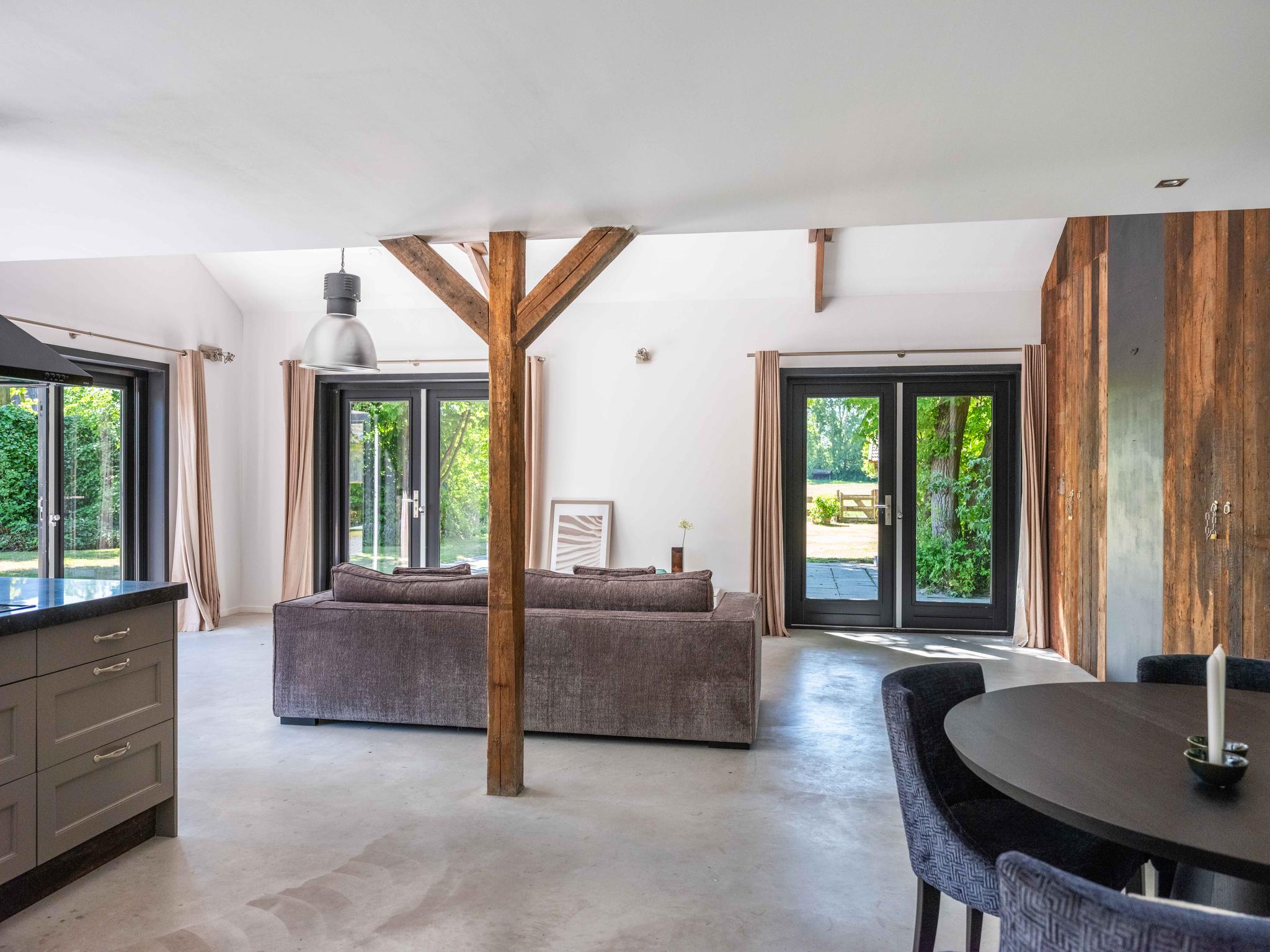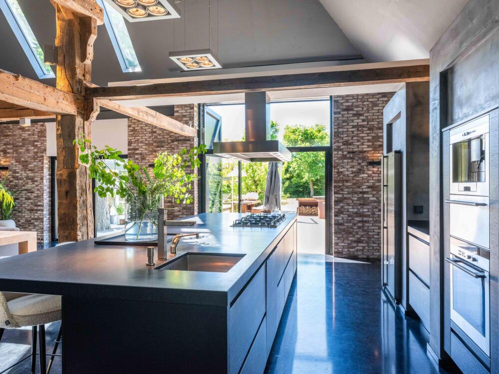 In de woonkamer valt de ruimte gelijk op. Het contrast van de kleuren in de woning versterken het stoere karakter van de woning. Deze zeer ruime living heeft een open haard en openslaande deuren naar de tuin. De moderne open keuken is uitgerust met diverse inbouwapparatuur, waaronder een Boretti 8-pits fornuis, een Amerikaanse koelkast met koffieapparaat en bordenwarmer, oven, en een ingebouwde koel- en vaatwasapparatuur.