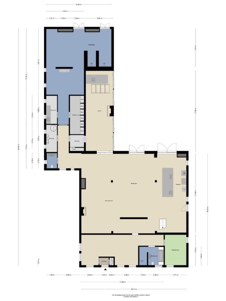 Alle faciliteiten bevinden zich op de begane grond, wat de woning extra toegankelijk maakt. De grote raampartijen zorgen voor veel lichtinval, waardoor de ruimtes ruimtelijk en uitnodigend aanvoelen. In de woonkamer is bovendien een trap naar de vide boven de kamers aan de voorzijde. De vide biedt mogelijkheden tot het realiseren van extra kamers-werkruimte.