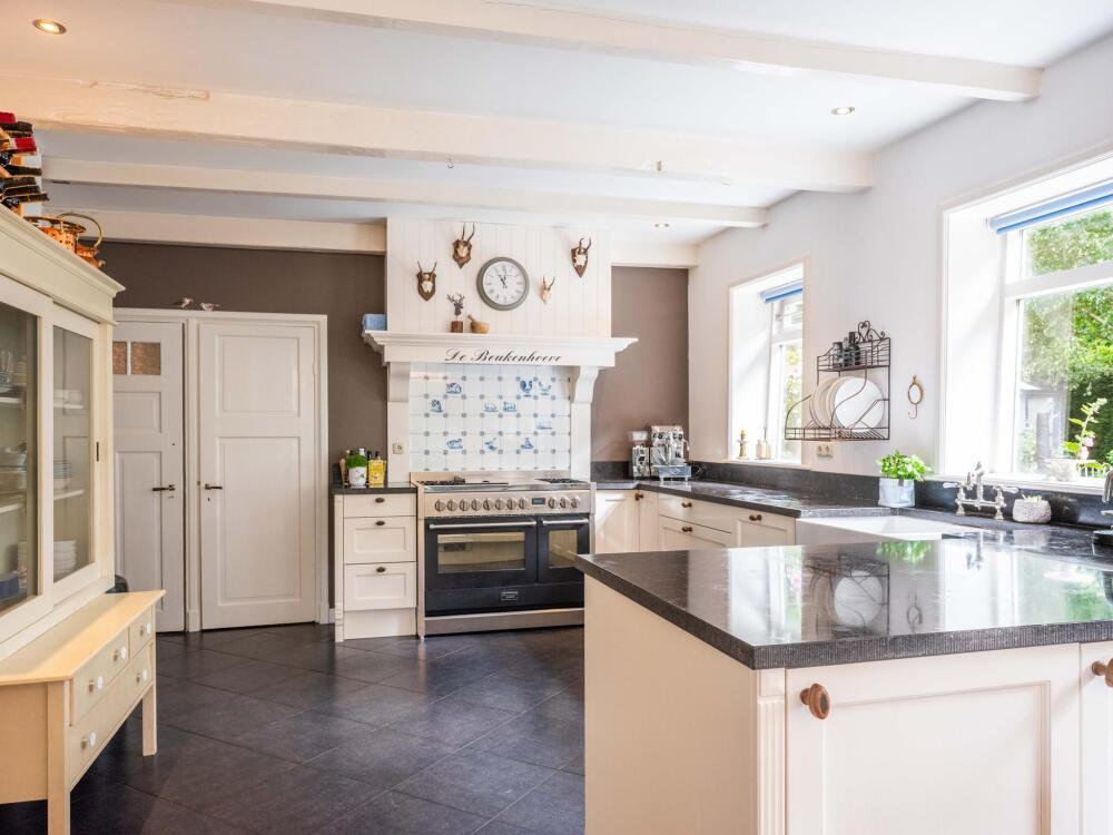 De ruime living van 18 meter lang is licht door de vele raampartijen. Kamer-en-suite deuren delen nu de ruimte in tweeën, waarvan een deel kantoor is. In de woonkamer vinden we een gezellige houtkachel en een deur naar het terras. De ruime landelijke open keuken heeft een opvallende schouw met groot fornuis. Aansluitend aan de keuken vinden we een waskamer met aansluiting voor wasmachine en droger en opbergruimte. Aangrenzend bevind zich een linnenkamer. Er is een bijkeuken met inbouwkasten over de gehele lengte en een keukenblok. De deur gaat naar het tweede terras grenzend aan de woning.