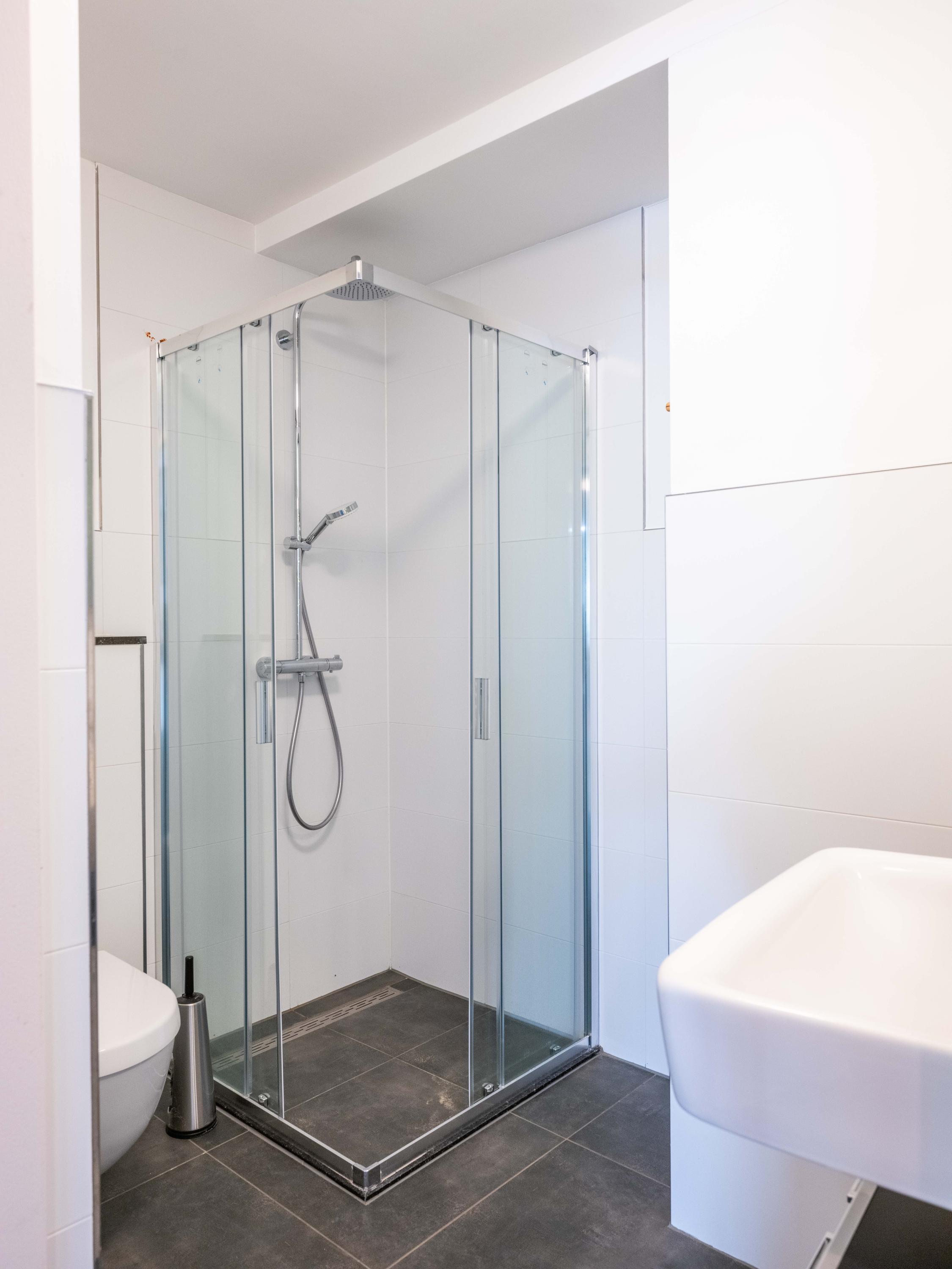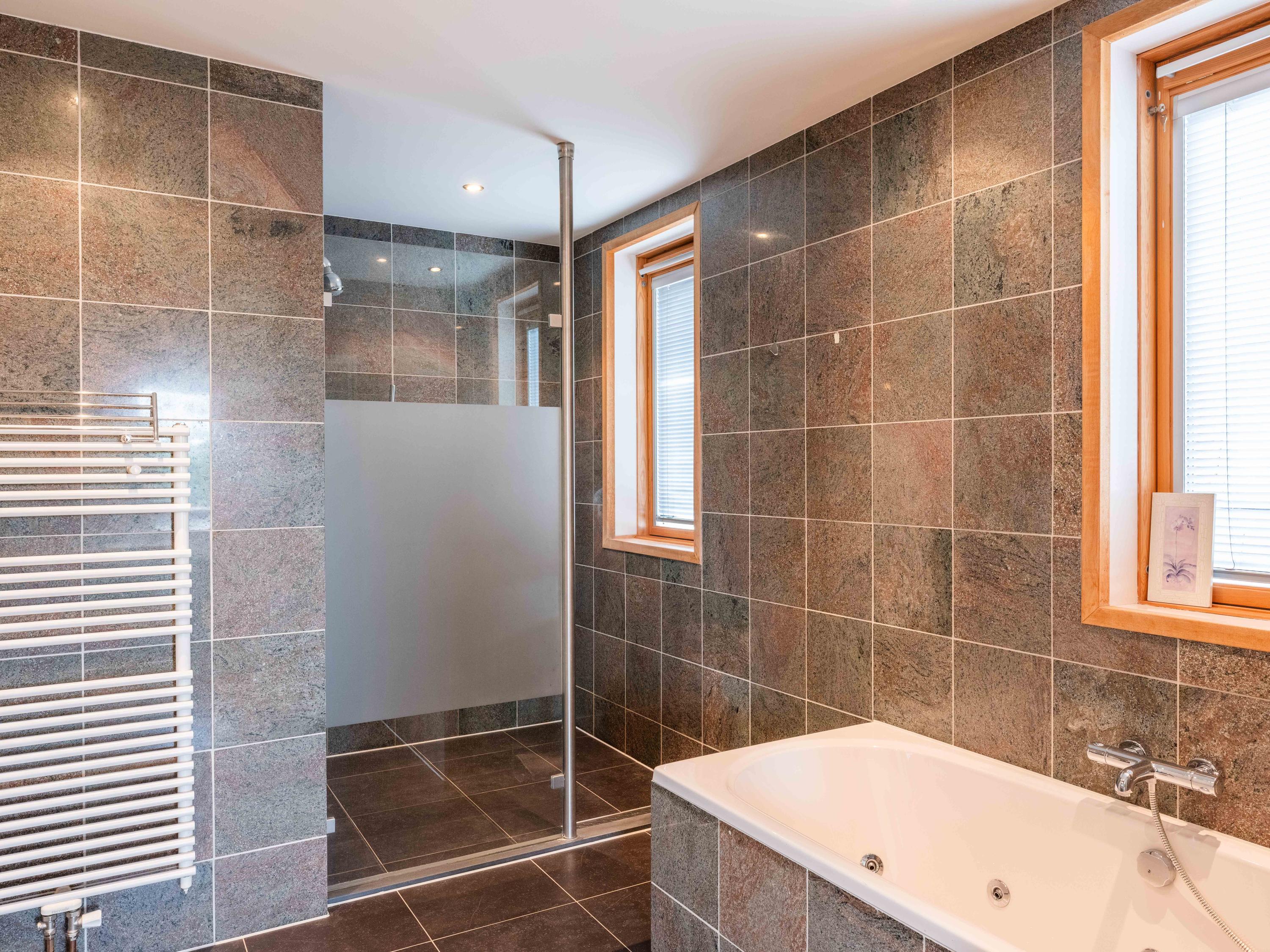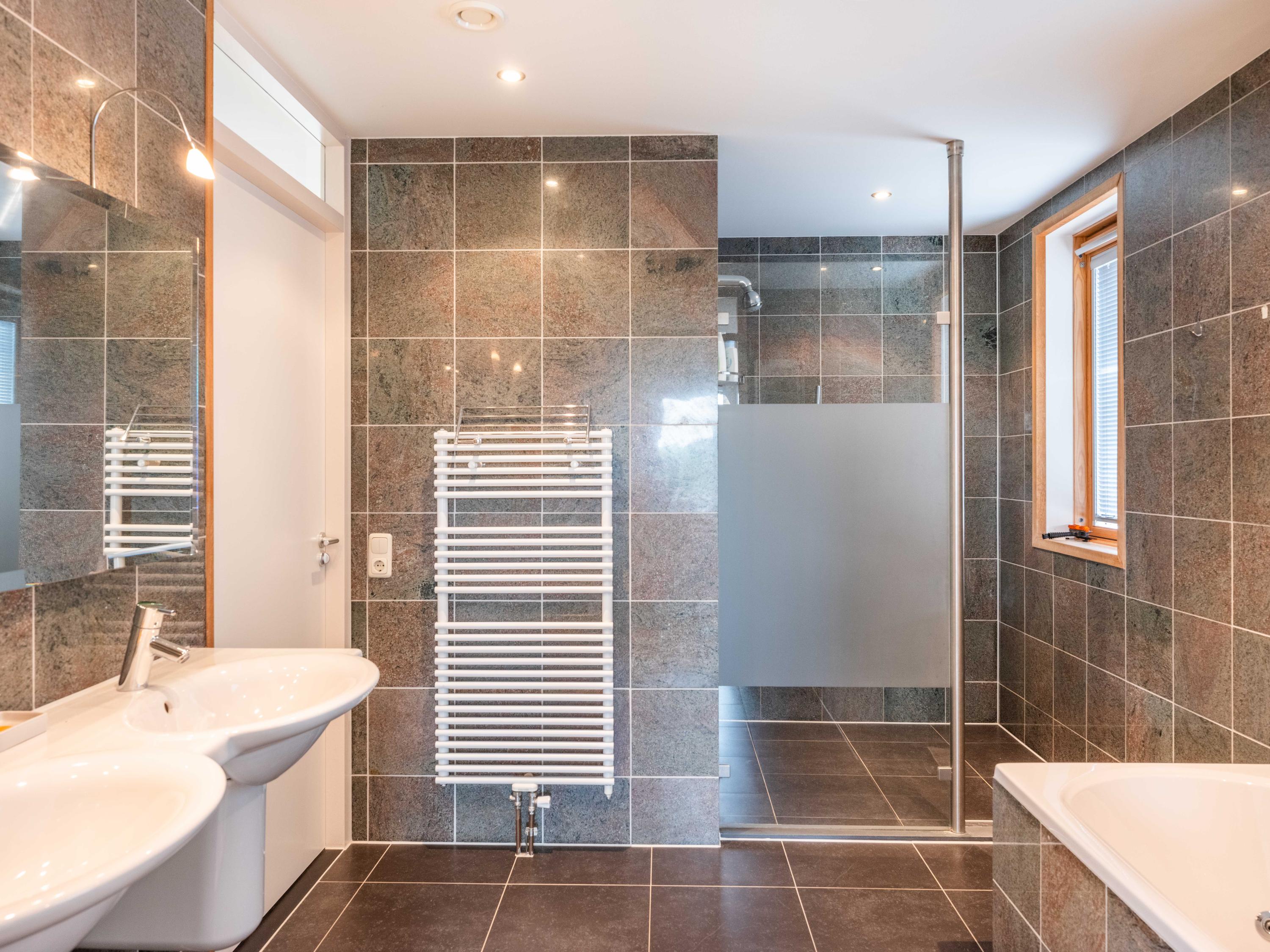 Via de trap komen we op de eerste verdieping, hier bevinden zich twee ruime slaapkamers, beide met vaste kastruimte, en de tweede badkamer. Deze luxe badkamer is uitgerust met een ligbad, dubbele wastafel en een inloopdouche. Vanuit de achterste slaapkamer toegang tot een besloten balkon/terras op het zuiden.