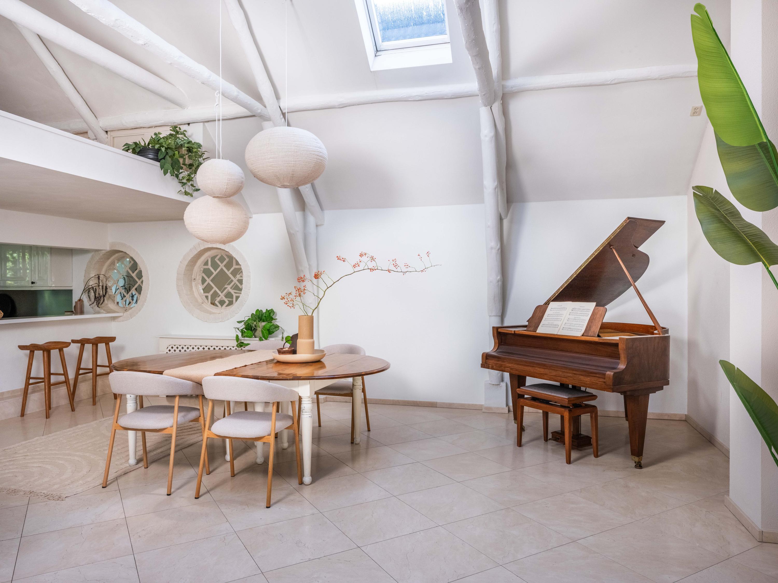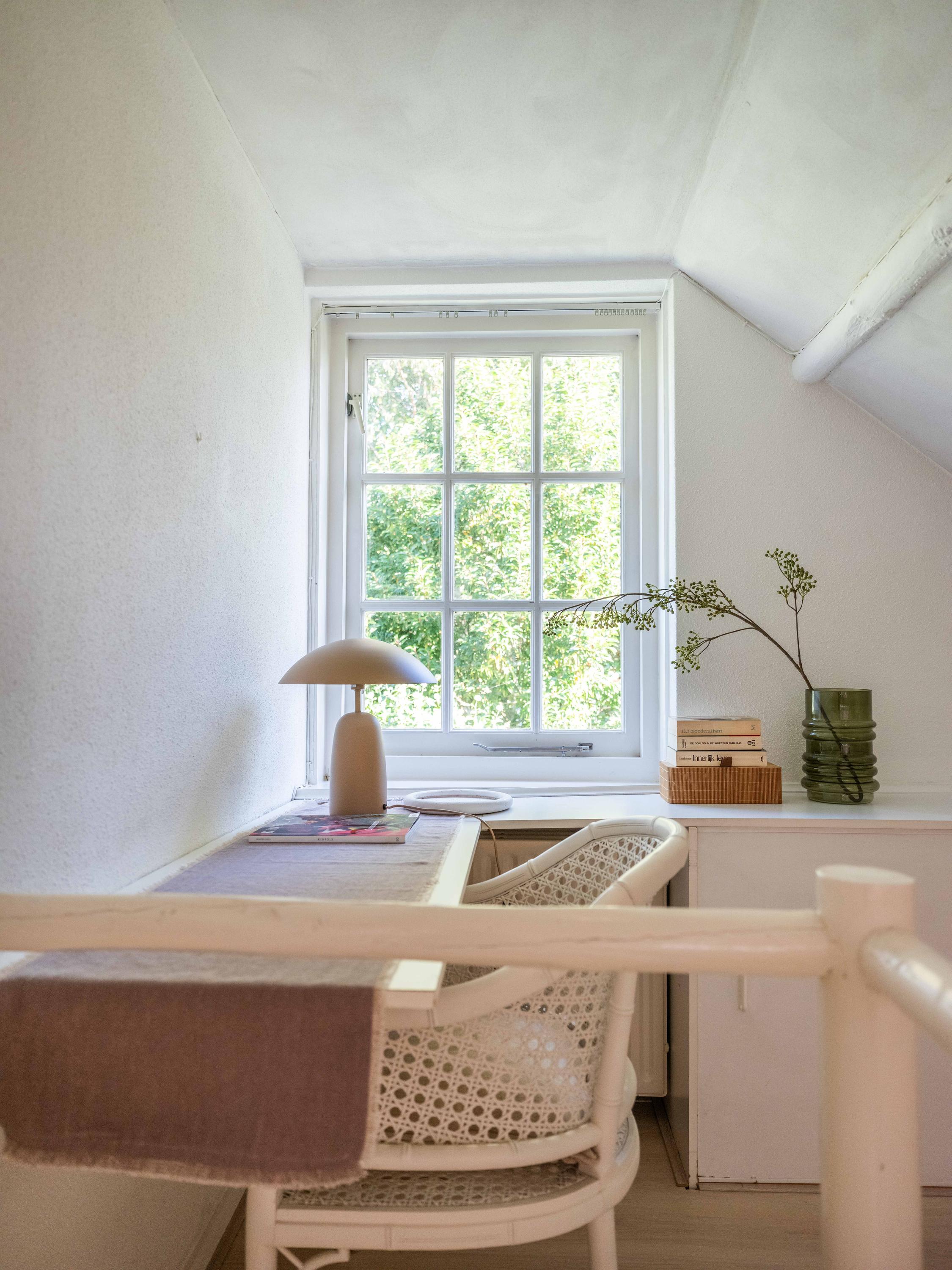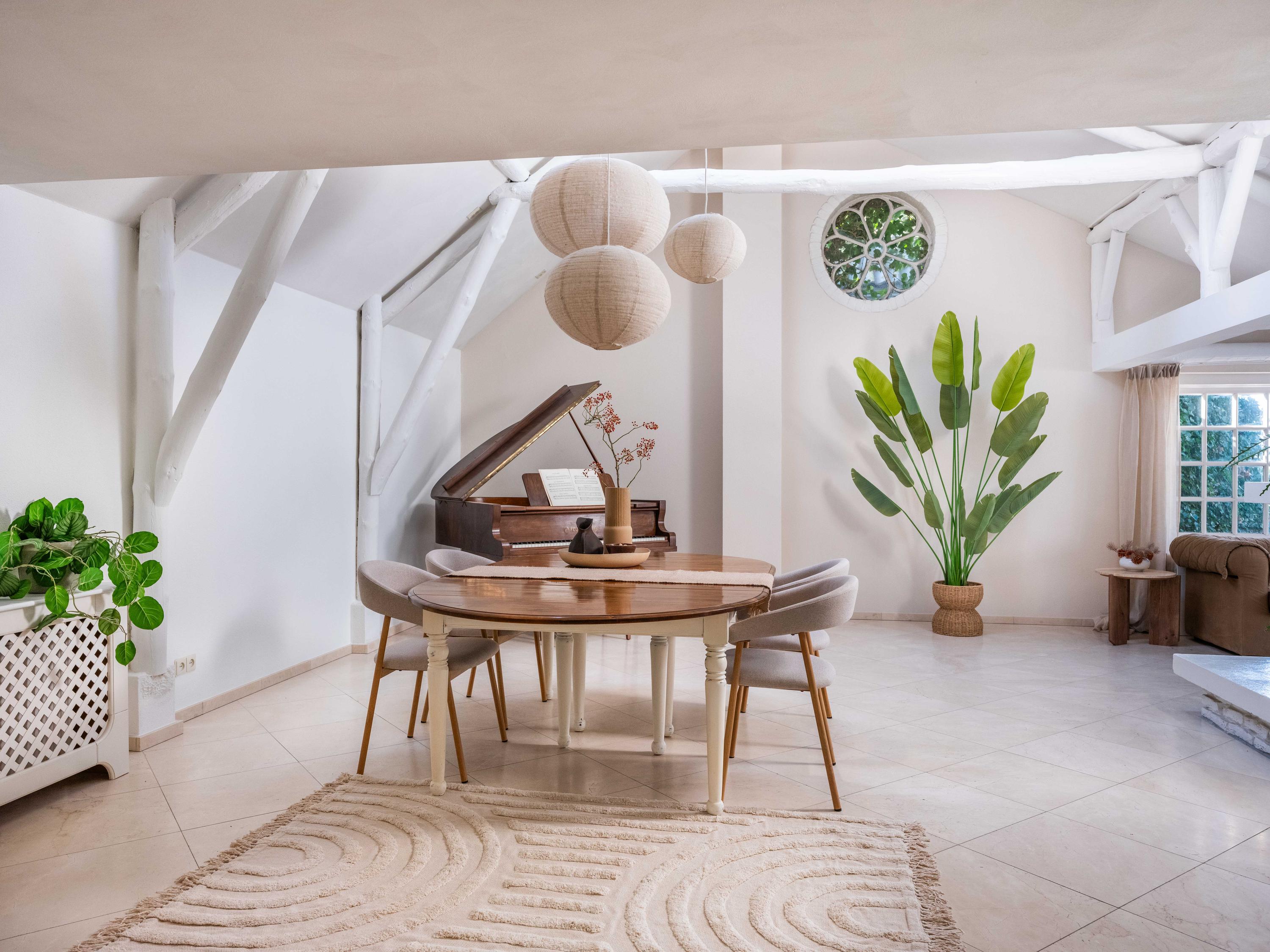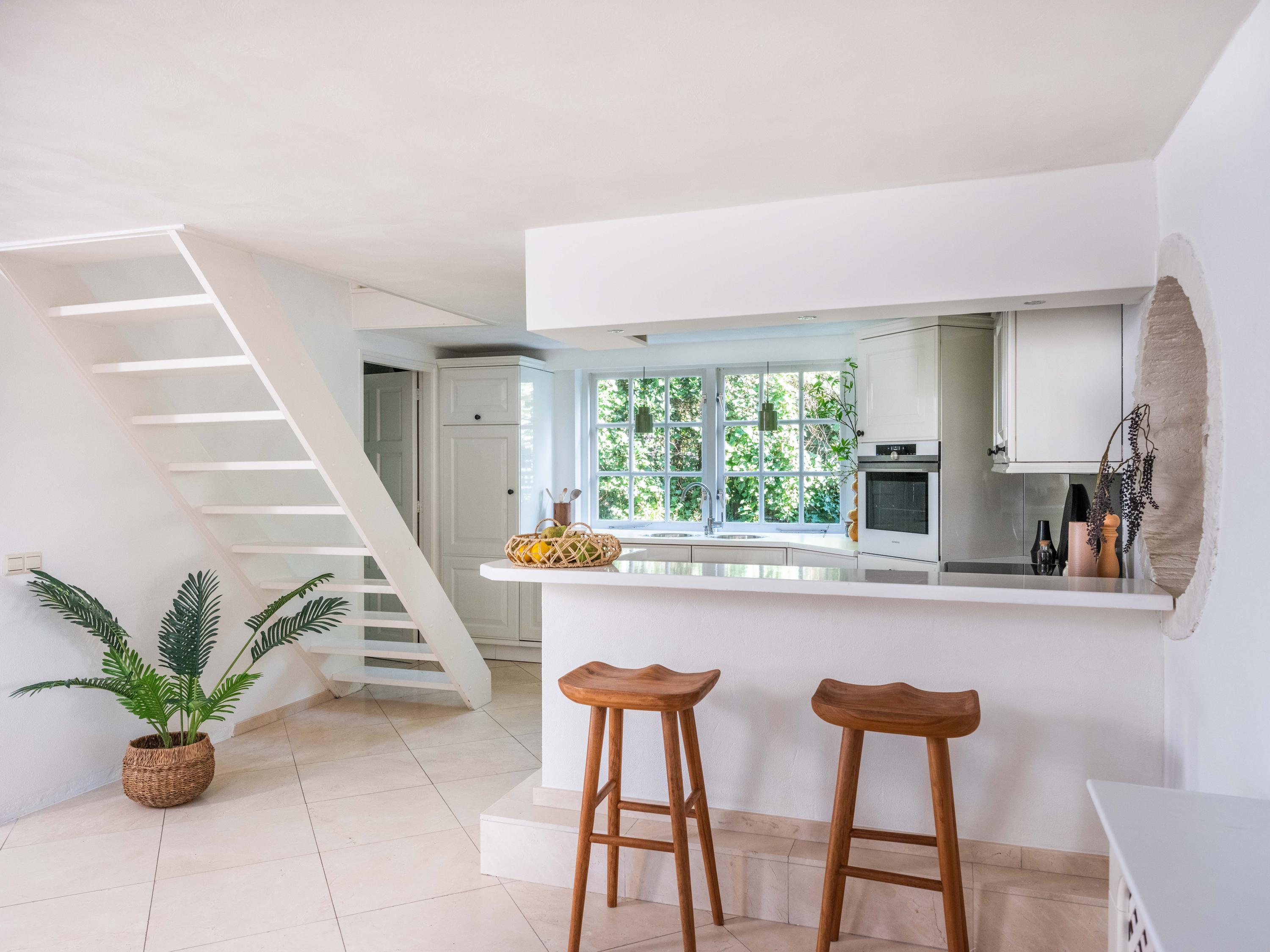 De royale living heeft centraal in de ruimte een gezellige gashaard (voorheen open haard). De ruimte is sfeervol met veel authentieke details: de houten balken in het zicht, een hoog plafond tot aan de nok en ronde glas-in-lood ramen. Links achterin vinden we de open keuken met inbouwapparatuur. Vanuit de keuken komen we in de bijkeuken met de aansluiting voor de wasmachine en wasdroger, de CV-opstelling en een deur naar buiten.