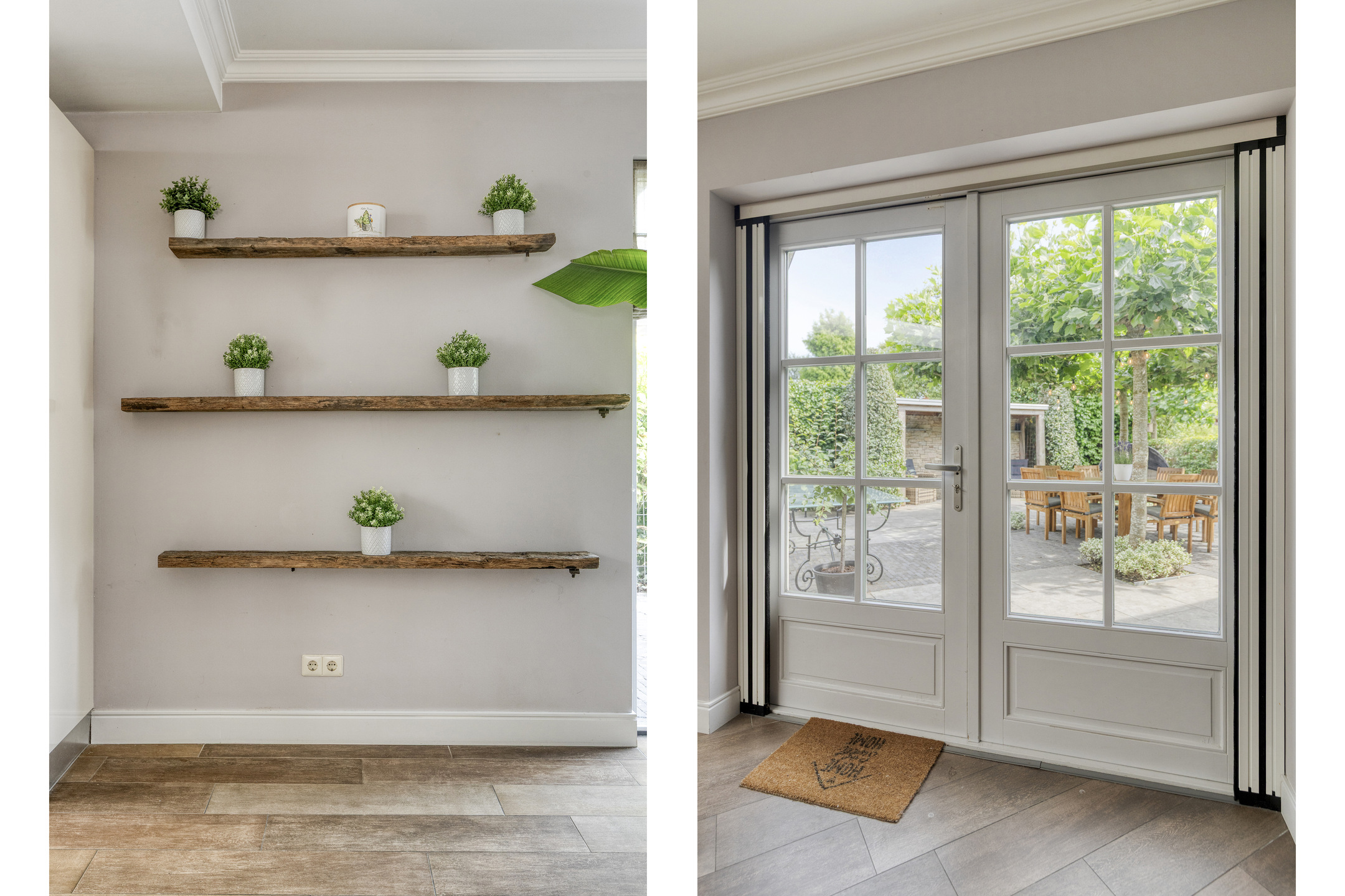 In het verlengde van de keuken bevindt zich de eetkamer met een extra keukenblok met onder andere een extra koelkast en een klimaatkast. Vanuit de eetkamer kom je via openslaande deuren in de veranda met openhaard en is er een deur naar de garage. Ook geven de openslaande deuren toegang geven tot de achtertuin.
