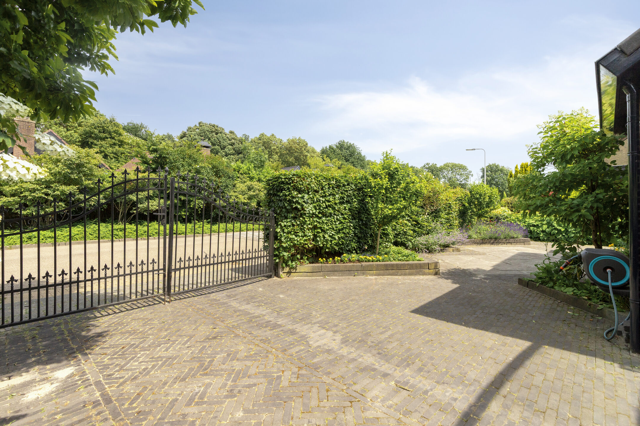 Oprit met plek om twee auto’s te parkeren waarvan 1 onder de glazen carport kan staan. Met een elektrische roldeur toegang tot de verwarmde garage.