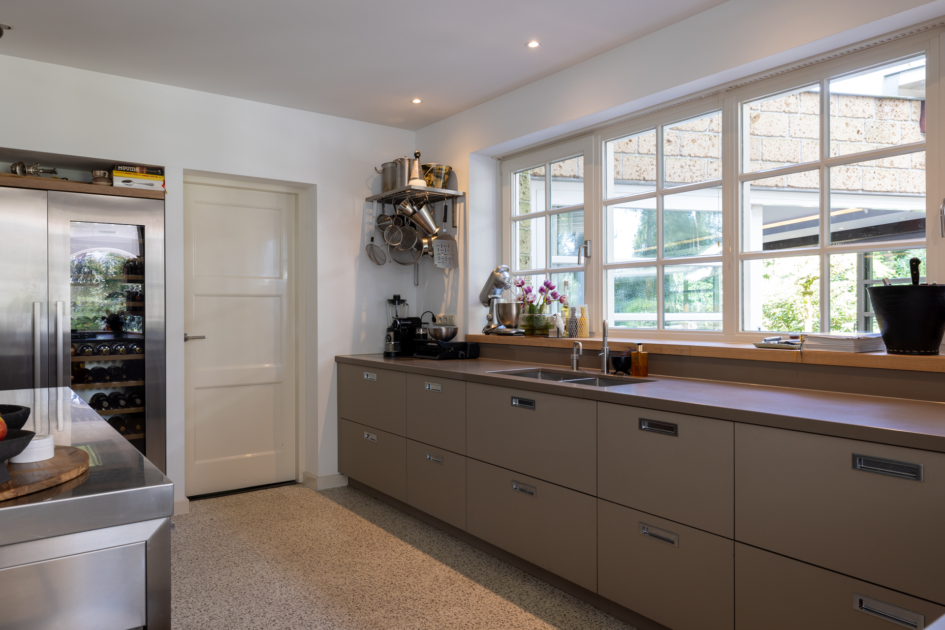 Geweldige woonkeuken (2022), op maat gemaakt door Antonissen interieurbouw en voorzien van alle wenselijke apparatuur zoals o.a. een ingebouwde koffiemachine, combi-oven, heteluchtoven, 6-pits gastoestel (Pitt Cooking), composiet aanrechtblad en een fraai stalen werkblad met stoere achterwand, afzuigkap, dubbele spoelbak, geïntegreerde afvalbak, Quooker en een grote roestvrijstalen koelkast met aparte wijnklimaatkast van Liebherr. De meeste inbouwapparatuur is van hoogstaande kwaliteit van het exclusieve merk Gaggenau.