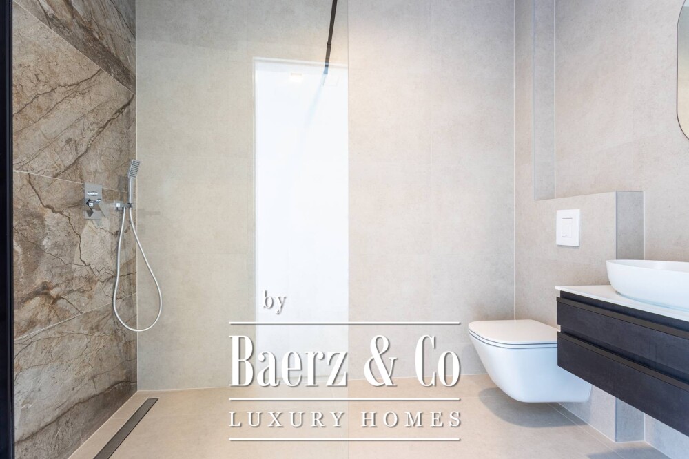 De eerste wooneenheid beslaat twee niveaus en is ingericht voor een rijke woonbeleving, met een fitnessruimte, een open keuken met eetgedeelte en een woonkamer die direct toegang biedt tot een privé tuin. Grote aluminium schuiframen zorgen ervoor dat het licht alle vertrekken overvloedig binnenvalt. Drie slaapkamers met ieder een eigen badkamer en royale terrassen brengen buiten naar binnen op elk moment van de dag. De tweede eenheid, gelegen op de bovenste verdieping, heeft een vrijwel onafhankelijk karakter, met een keuken, eetgedeelte, slaapkamer, badkamer en een deels overdekt terras van 38 m² met uitzicht op de horizon.