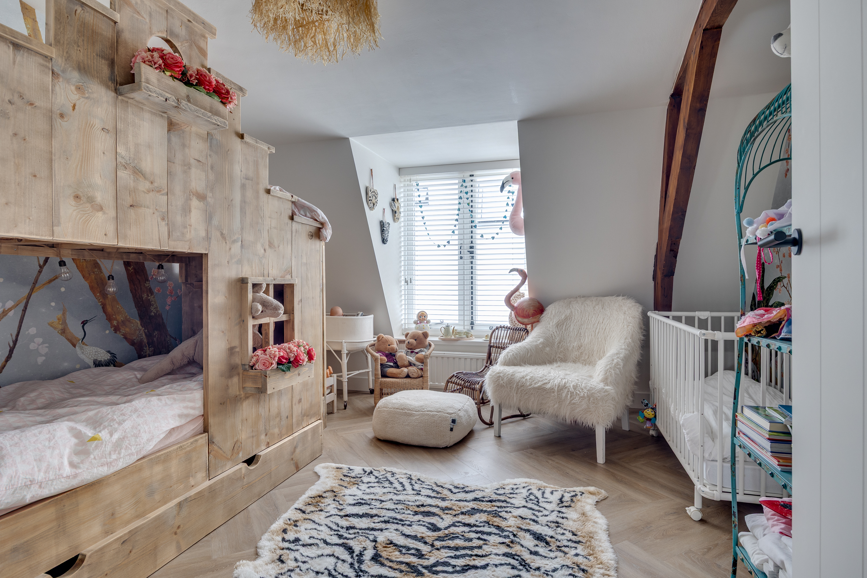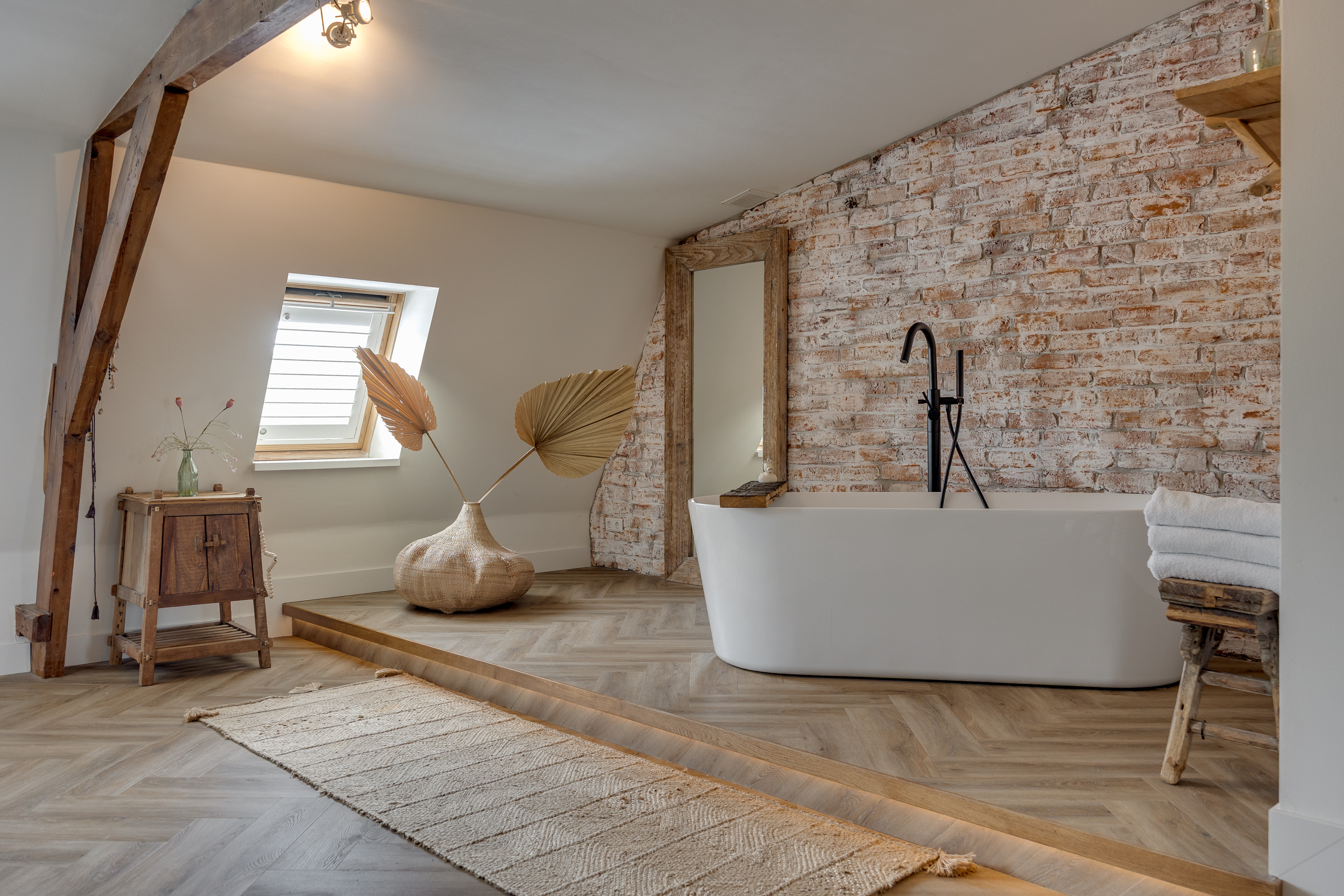 Daarnaast is er een tweede badkamer met inloopdouche, wastafelmeubel, toilet en ruimte voor wasmachine en droger. Een extra separaat toilet bevindt zich op de overloop. Authentieke houten balken zijn in het zicht gebleven en zorgen voor een sfeervol contrast met de moderne afwerking.