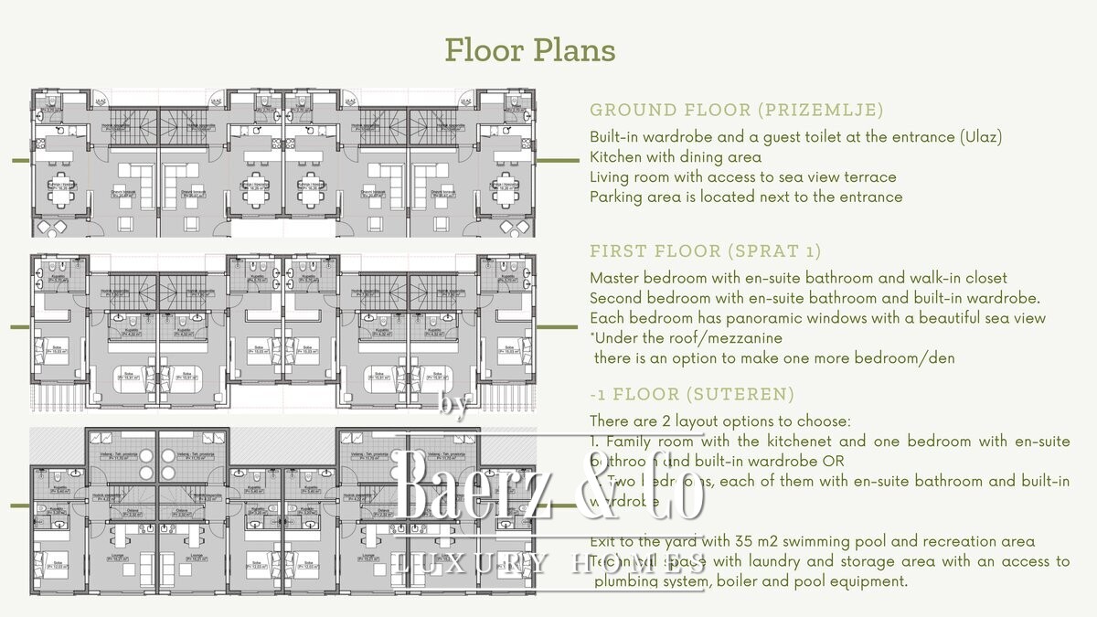 Elke woning met vier slaapkamers is met grote zorg ontworpen en biedt een keuze uit een klassiek of modern interieurpalet. Plafondhoogtes van 3 meter, panoramische ramen van 2,5 meter en vloeiende plattegronden laten het daglicht rijkelijk binnenstromen in de ruime leefruimtes. Iedere slaapkamer beschikt over een en-suite badkamer en ingebouwde kasten; de master suite is bovendien voorzien van een inloopkast. De designkeukens zijn volledig uitgerust met inbouwapparatuur en de woonkamers bieden toegang tot terrassen met uitzicht op zee. Op niveau -1 is een flexibele ruimte beschikbaar, geschikt voor een familiekamer met kitchenette of extra slaapkamers, alle met directe toegang tot een privé tuin en een zwembad van 35 m², afgeschermd door weelderig groen voor optimale privacy.