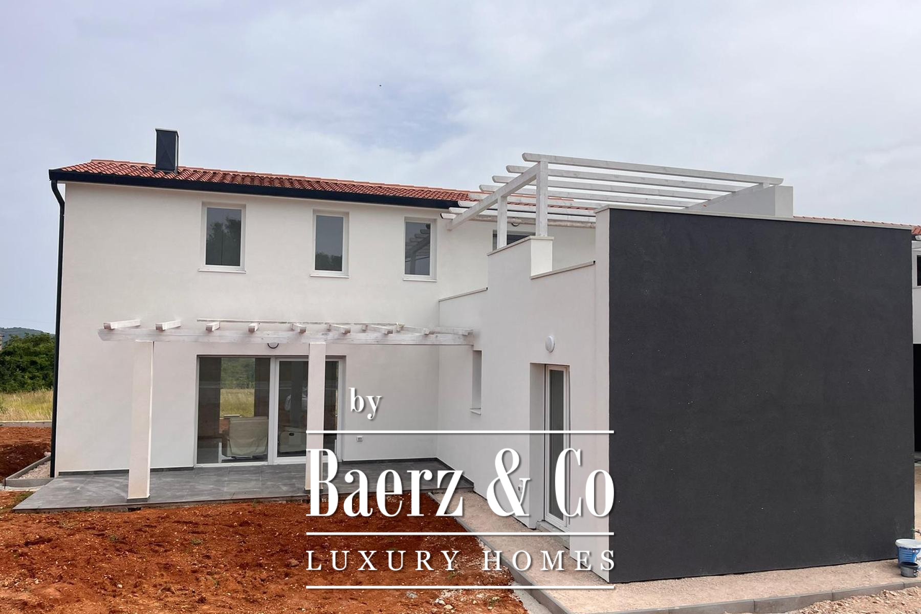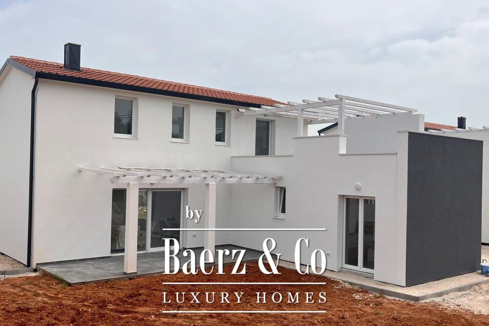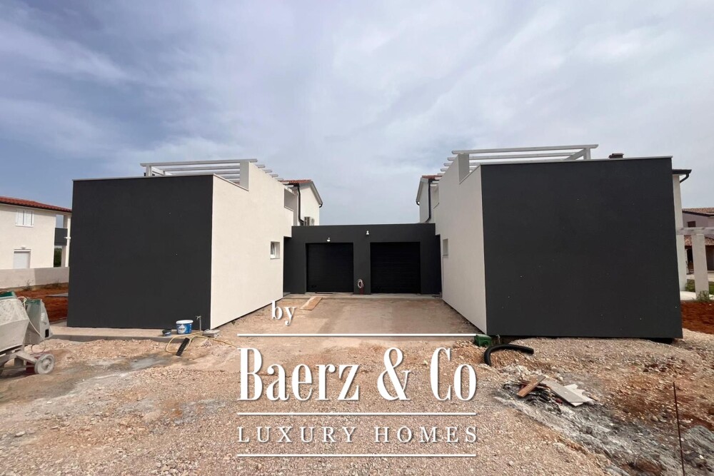 Twee-onder-een-kapwoning Buje biedt een eigentijdse interpretatie van het dorpsleven, rustig gelegen nabij Momjan, op slechts 12 kilometer van de Adriatische kust en vijf kilometer van het centrum van Buja. Deze woning van 460 m² bestaat uit twee identieke helften en beschikt over zes slaapkamers en zes badkamers, wat een samenspel van privacy en comfort creëert, ideaal voor grote gezinnen of twee families.