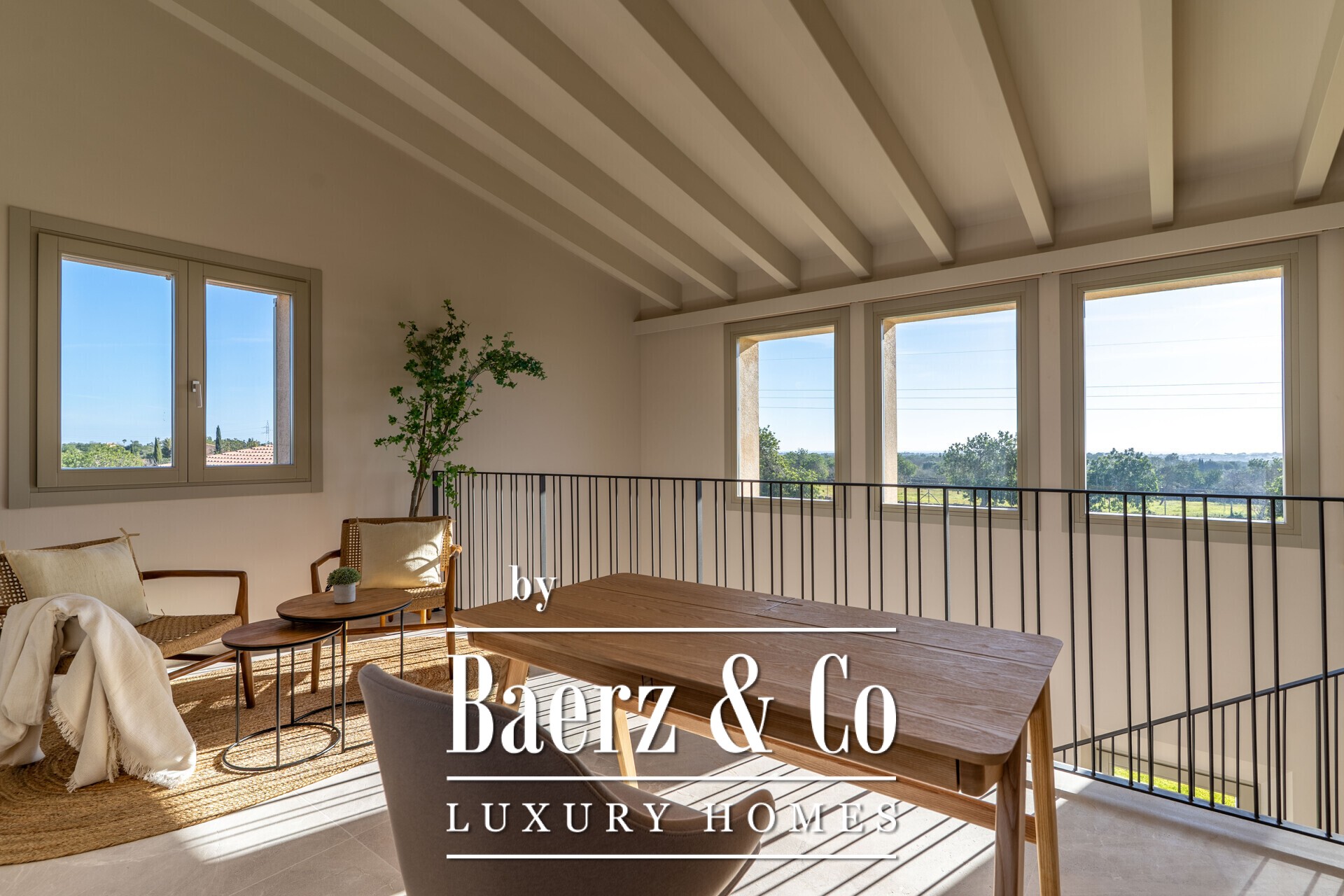 Via een stijlvolle trap bereikt men de bovenverdieping, waar een ruime multifunctionele ruimte ideaal is als lounge, kantoor of ontspanningsruimte. Daarnaast bevindt zich hier de hoofdslaapkamer met en-suite badkamer en toegang tot een privéterras met prachtig uitzicht op zee en het omliggende landschap.