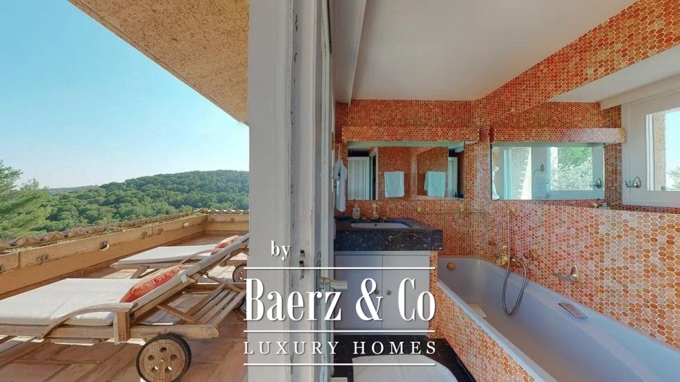 Een apart huis voor de huismeester biedt extra privacy voor zowel bewoners als personeel. Twee garages en buitenterreinen zorgen voor praktische parkeermogelijkheden. Voorzieningen zoals airconditioning, elektrische zonwering, een intercomsysteem, internet en een elektrische poort onderstrepen het veiligheid- en comfortniveau. Deze villa in Cannes vormt, dankzij het uitzicht en de architectuur, een discrete schuilplaats op korte afstand van het culturele hart van de Rivièra.
