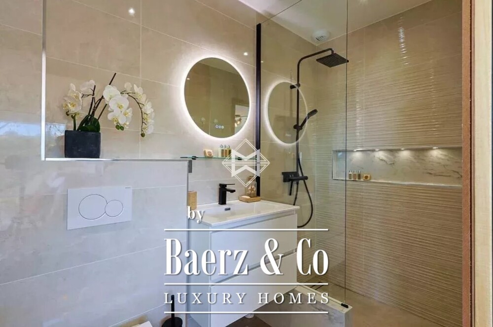 Het ontwerp is gericht op ingetogen luxe; vijf slaapkamers zijn doordacht gepositioneerd, waaronder een hoofdsuite met dressing, inloopdouche en balneobad, terwijl op de begane grond een suite met eigen voorzieningen is gesitueerd. Een flexibele ruimte biedt plek aan een extra logeerkamer of thuisbioscoop. De open leef- en keukenruimte vormt het hart van het huiselijk leven en staat in direct contact met de grote terrassen, ondersteund door centraal geregelde airconditioning.