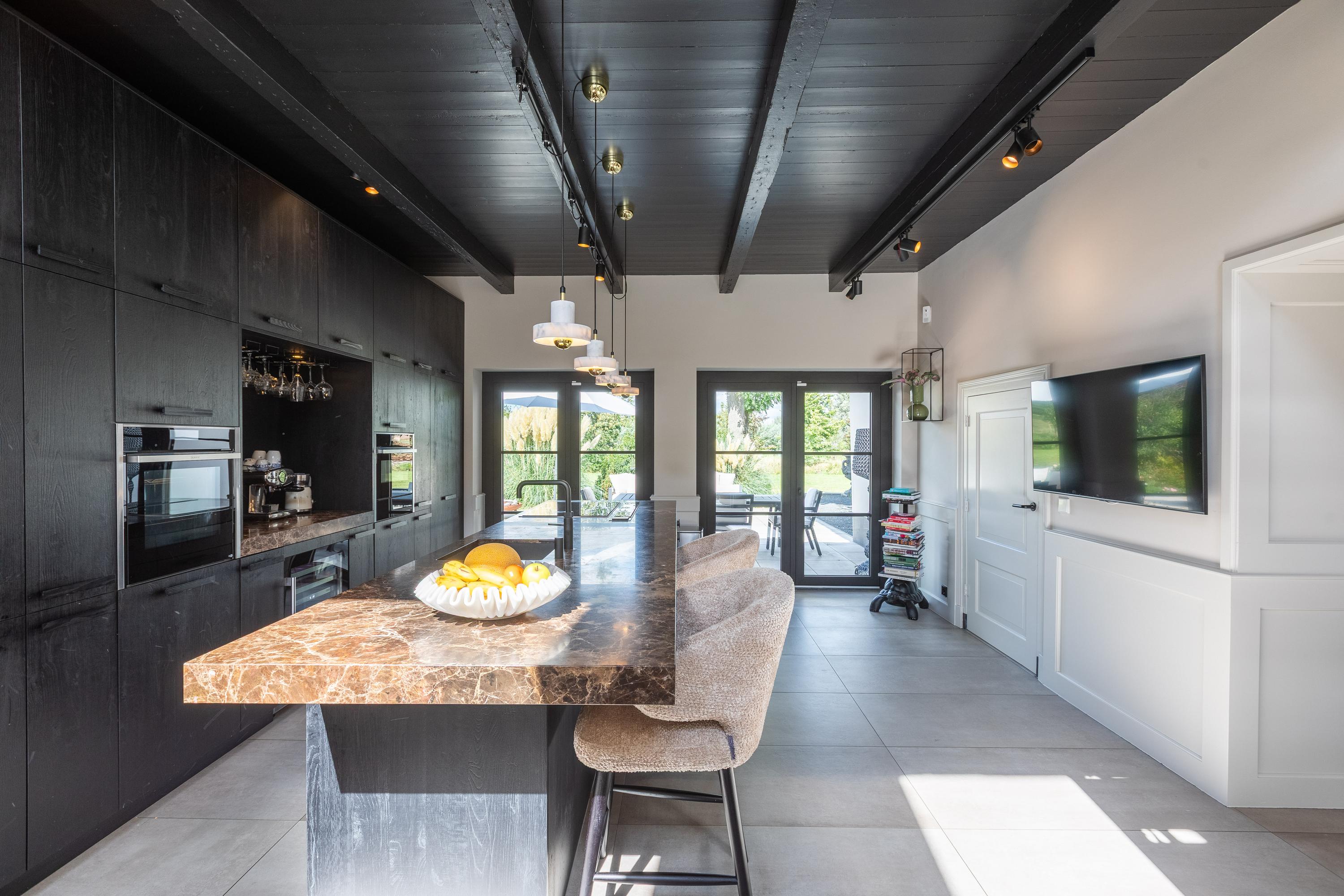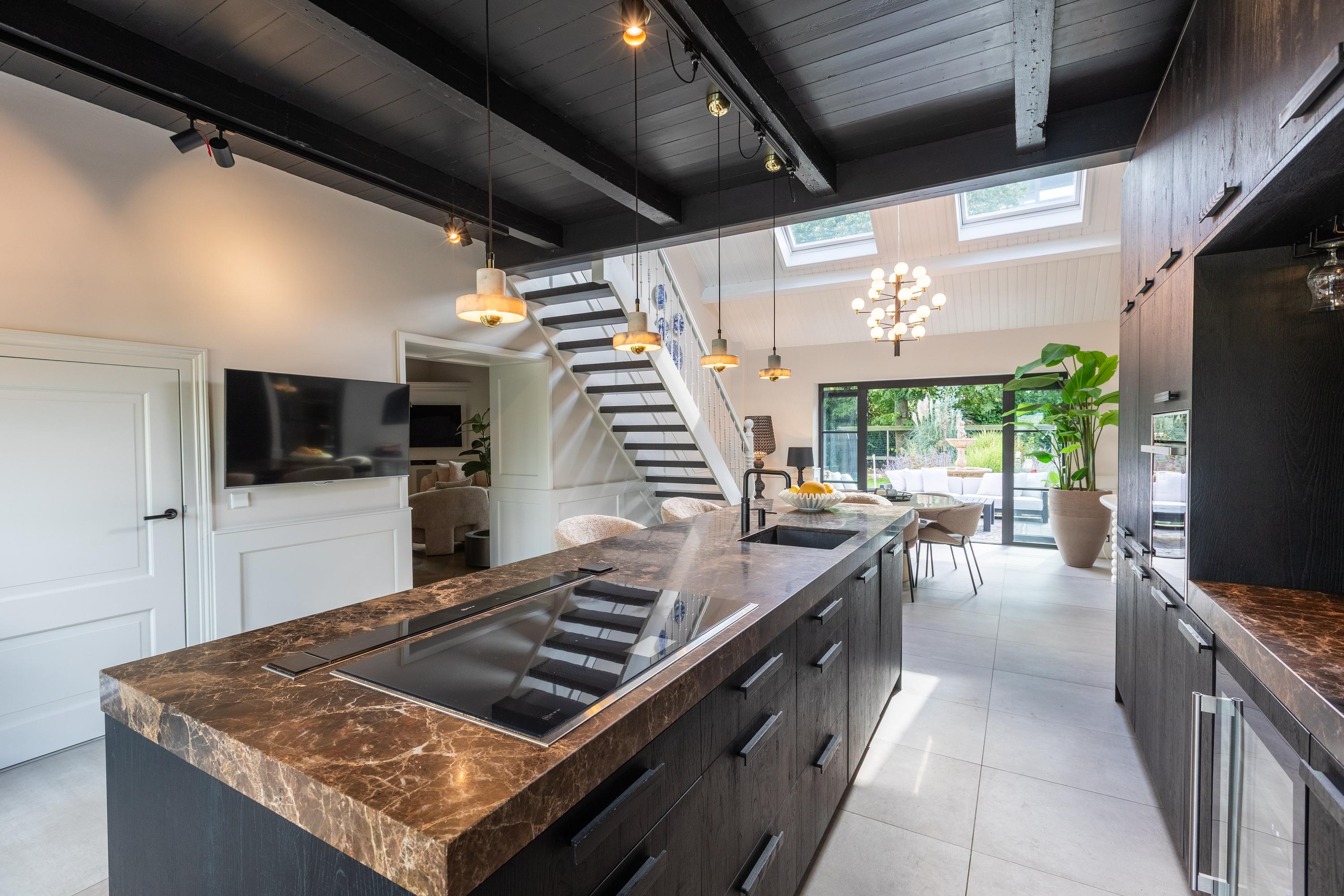 - Woonkeuken met marmeren kookeiland en entresol;