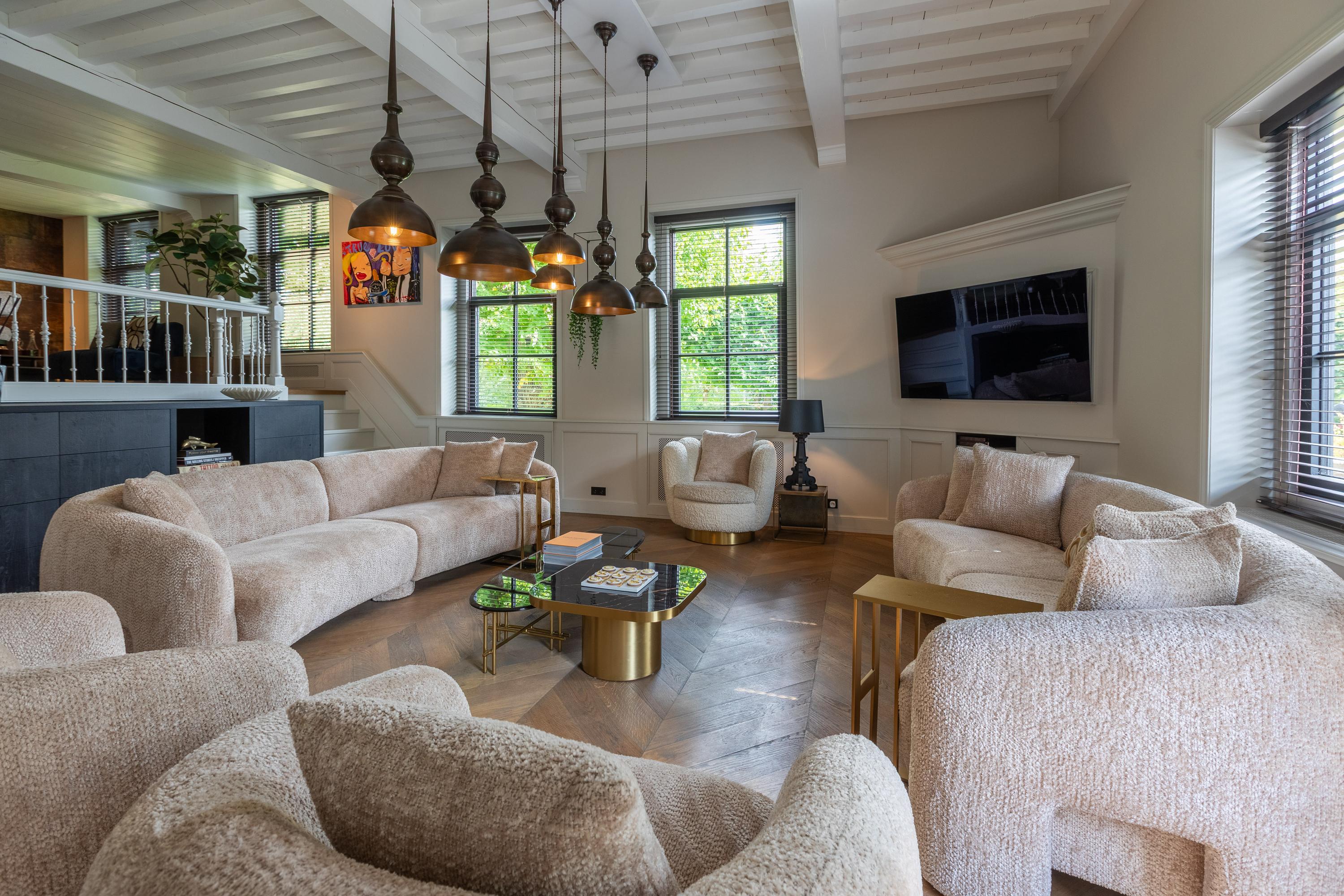 Daarnaast beschikt de begane grond over een tweede moderne keuken bij het terras en een multifunctionele ruimte van ca. 85 m² in de voormalige stal, voorzien van een bar, pantry, toilet en toegang tot de garages en bergruimte. Aan de andere zijde van deze ruimte betreedt u de royale aanbouw met wellness, compleet ingericht met jacuzzi, Finse sauna, infraroodsauna en voldoende plek voor een grote eettafel of een lounge set– een heerlijke plek om te ontspannen en samen te genieten.