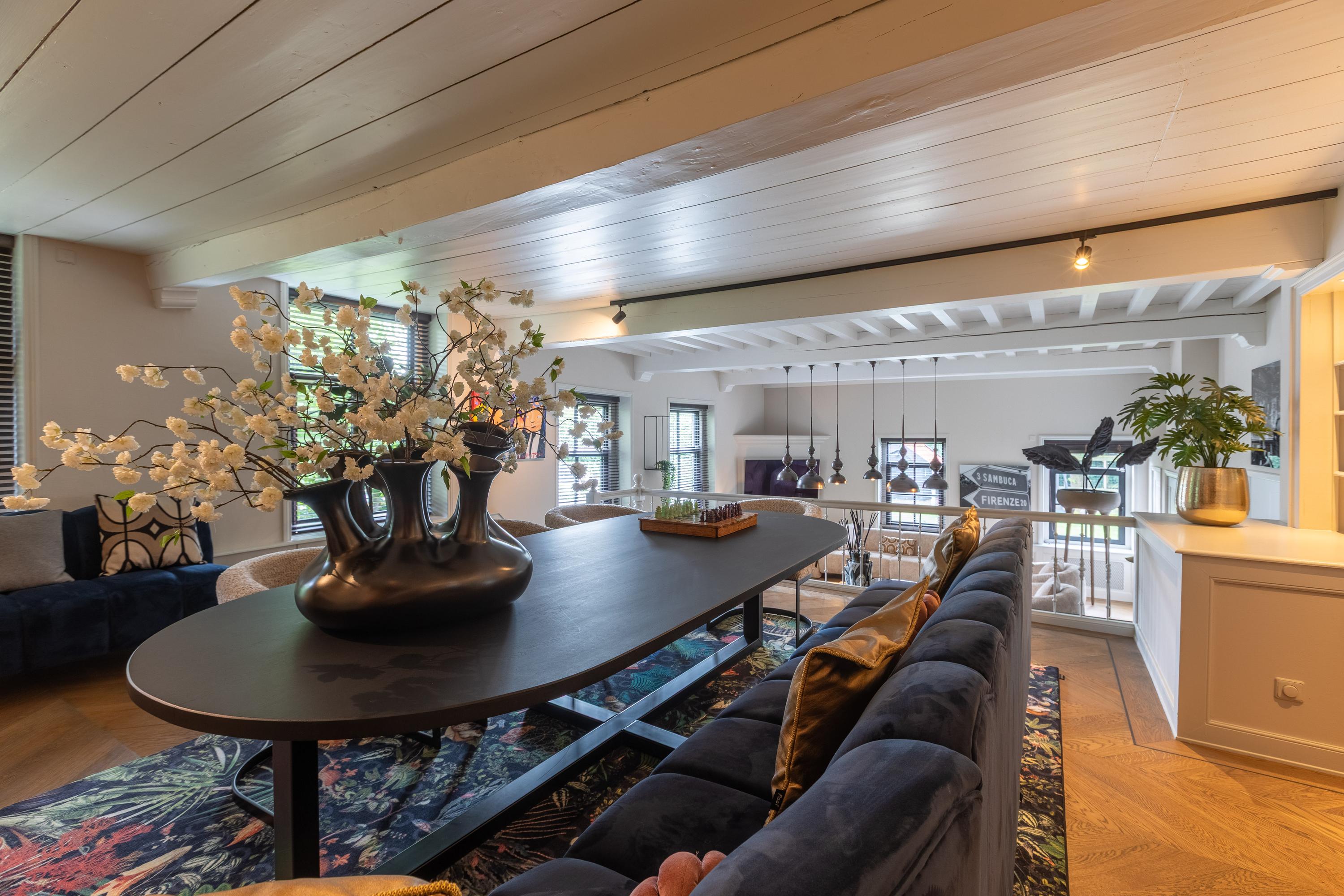 De entree is centraal gesitueerd en biedt toegang tot een royale hal met garderobe en toilet. Vanuit hier betreedt u de indrukwekkende eetkeuken van ca. 45 m², luxe uitgevoerd met kookeiland en hoogwaardige inbouwapparatuur. Dankzij de hoge nok en entresol geniet u hier van een prachtige ruimtelijke beleving.