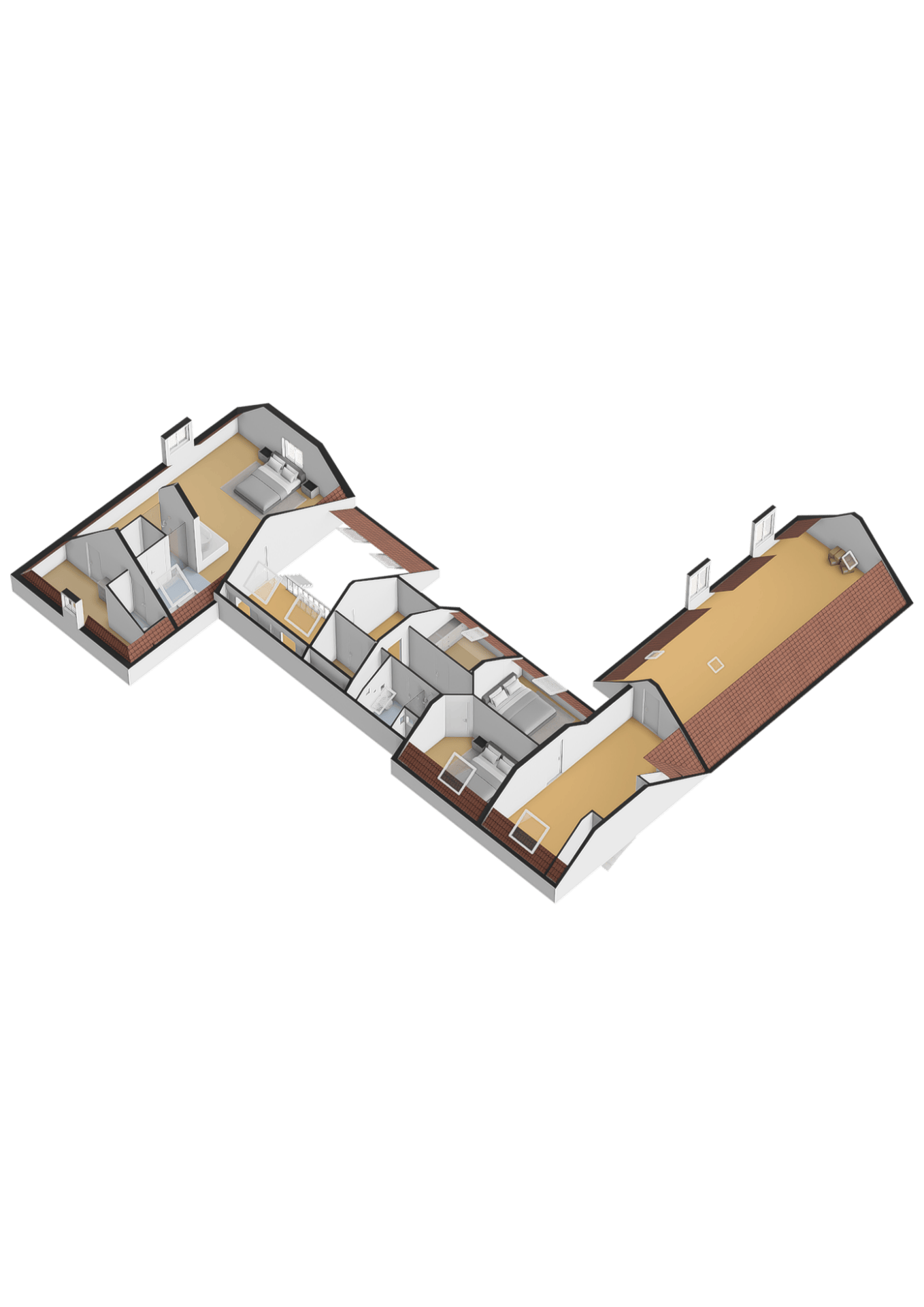 Een ruime overloop boven de keuken geeft toegang tot de master bedroom (ca. 65 m²) v.v. airco met karakteristieke houten kapbalken, een luxe badkamer en suite met vrijstaand bad, inloopdouche, toilet en dubbele wastafel, plus een walk-in closet met dakkapel en uitzicht op het groen van Midden-Delfland.