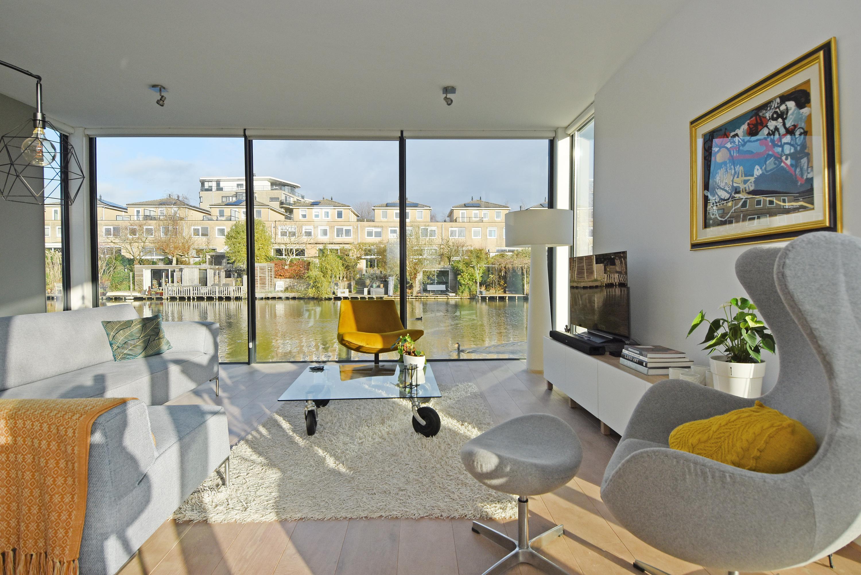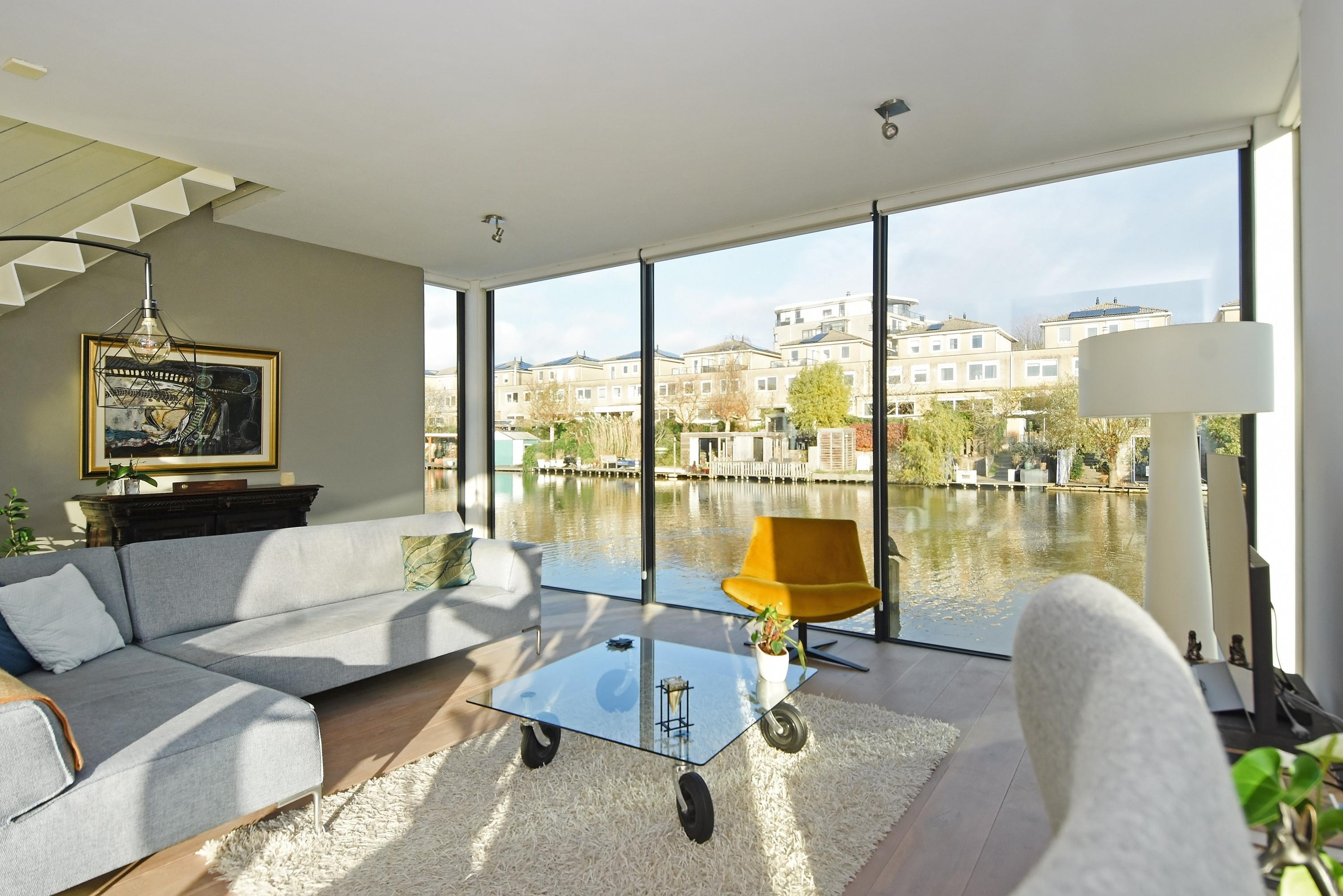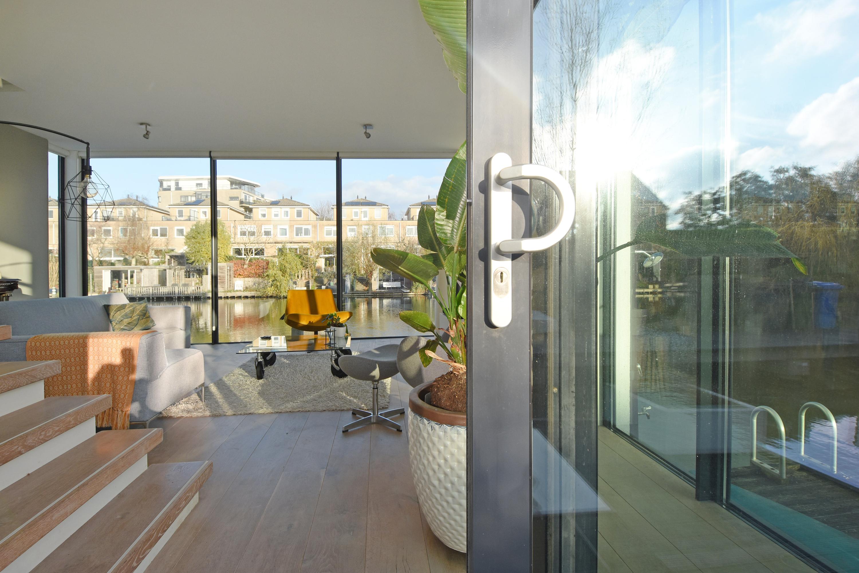 Bij binnenkomst in deze splitlevelwoning word je compleet verrast door de speelse indeling, de ruimte en het vele licht dat binnenvalt door de grote en hoge raampartijen. De comfortabele en fraaie woonkeuken is van alle luxe en gemakken voorzien met een kookeiland, allerlei inbouwapparatuur en een ideale plek voor een ruime eethoek. Vanuit hier bereik je via een trapje naar beneden een lichte, gezellige en royale living met een uniek en vrij uitzicht op het water. Aangrenzend loop je zo door naar een heerlijk zonnig drijvend terras met (buiten) regendouche en zwemtrap, waar je lang kan genieten van alle rust, vrijheid en de zon.