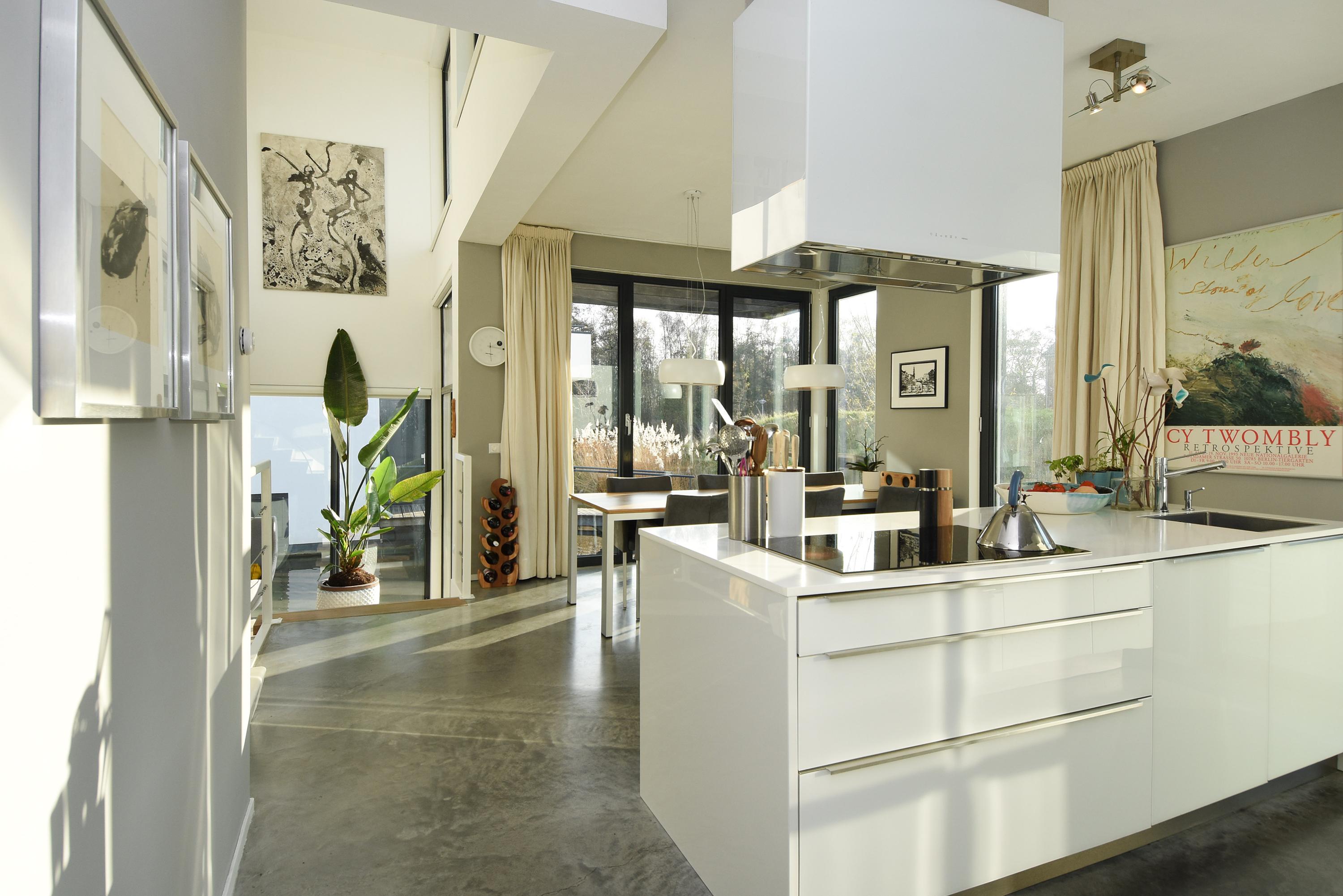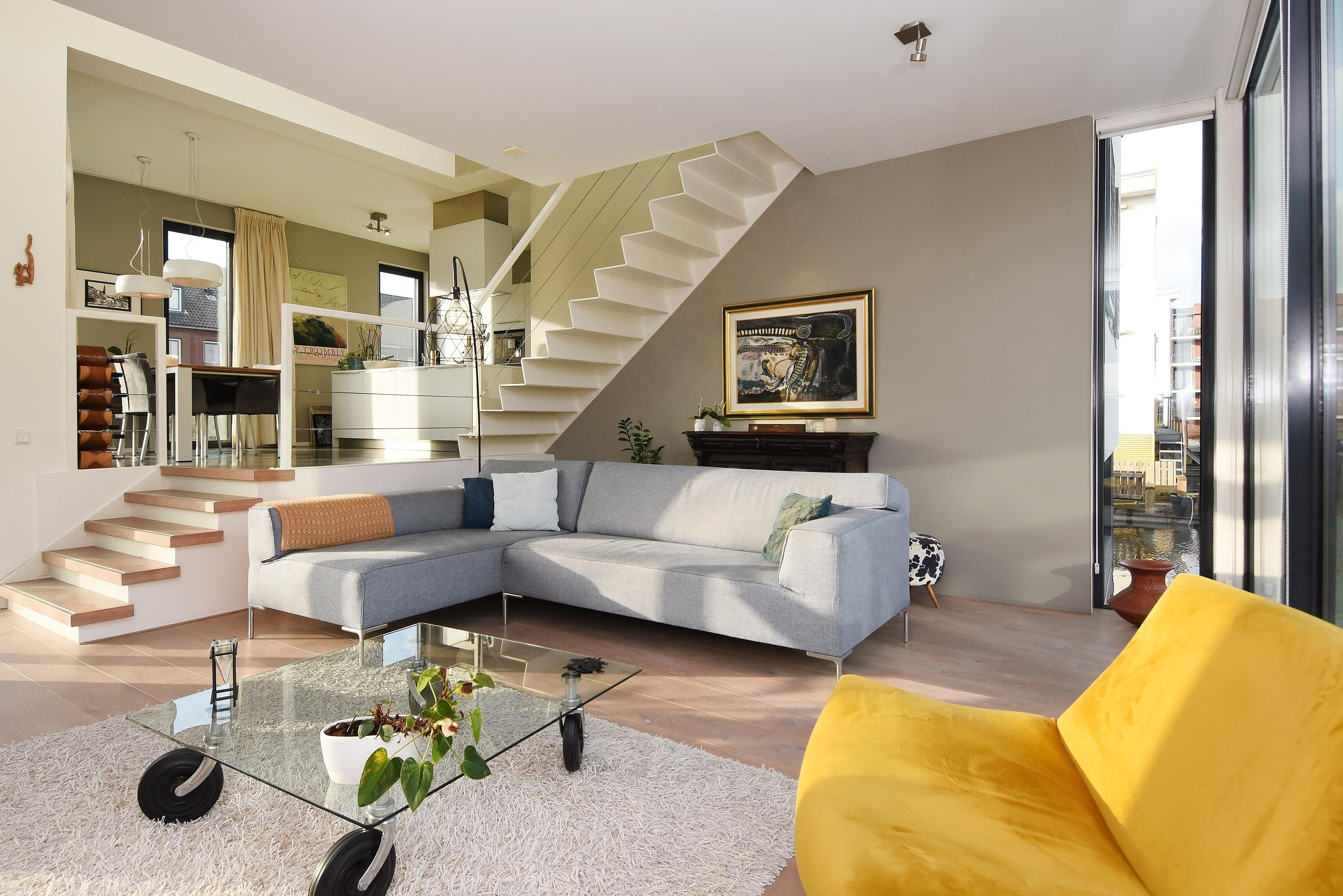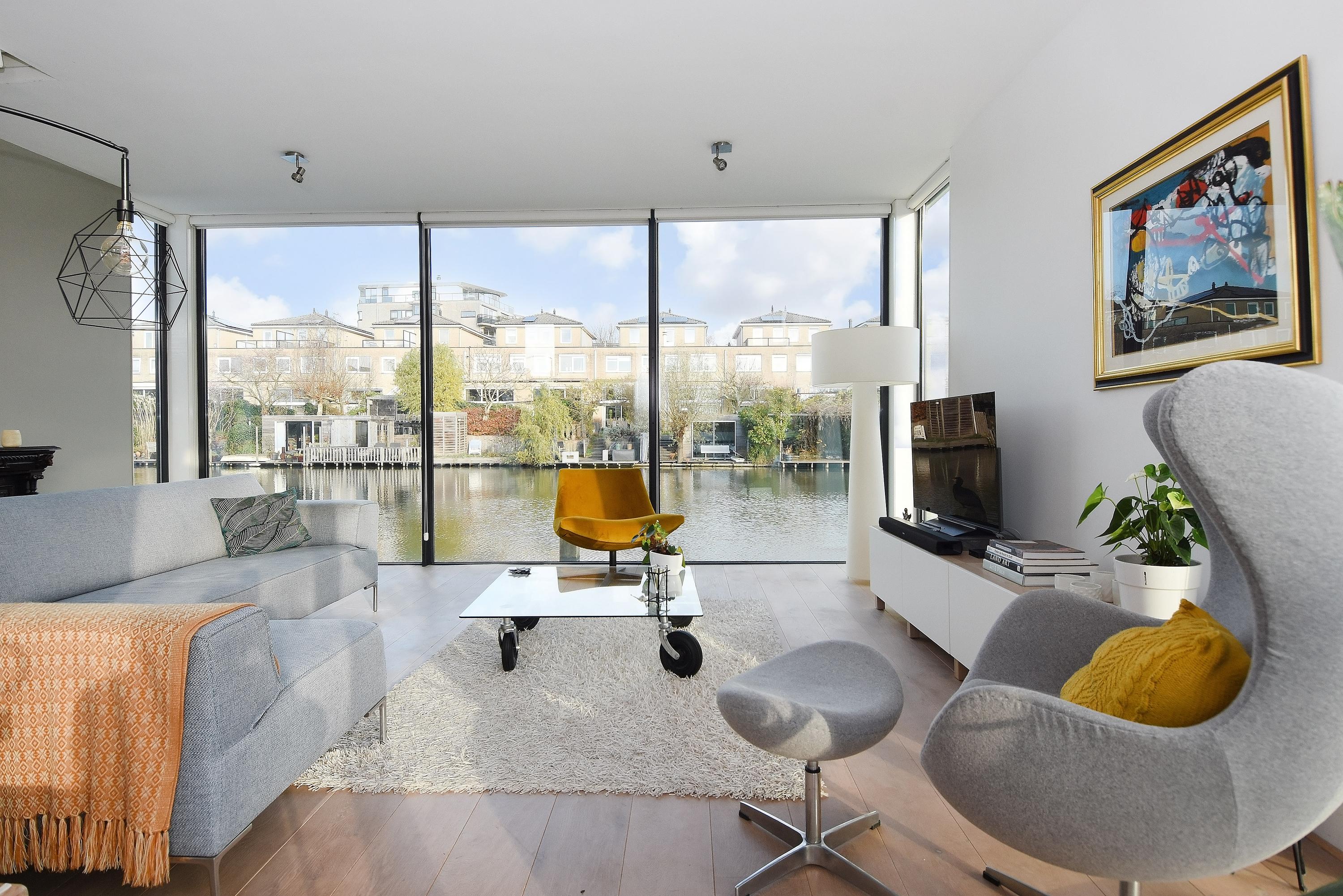 Bij binnenkomst in deze splitlevelwoning word je compleet verrast door de speelse indeling, de ruimte en het vele licht dat binnenvalt door de grote en hoge raampartijen. De comfortabele en fraaie woonkeuken is van alle luxe en gemakken voorzien met een kookeiland, allerlei inbouwapparatuur en een ideale plek voor een ruime eethoek. Vanuit hier bereik je via een trapje naar beneden een lichte, gezellige en royale living met een uniek en vrij uitzicht op het water. Aangrenzend loop je zo door naar een heerlijk zonnig drijvend terras met (buiten) regendouche en zwemtrap, waar je lang kan genieten van alle rust, vrijheid en de zon.