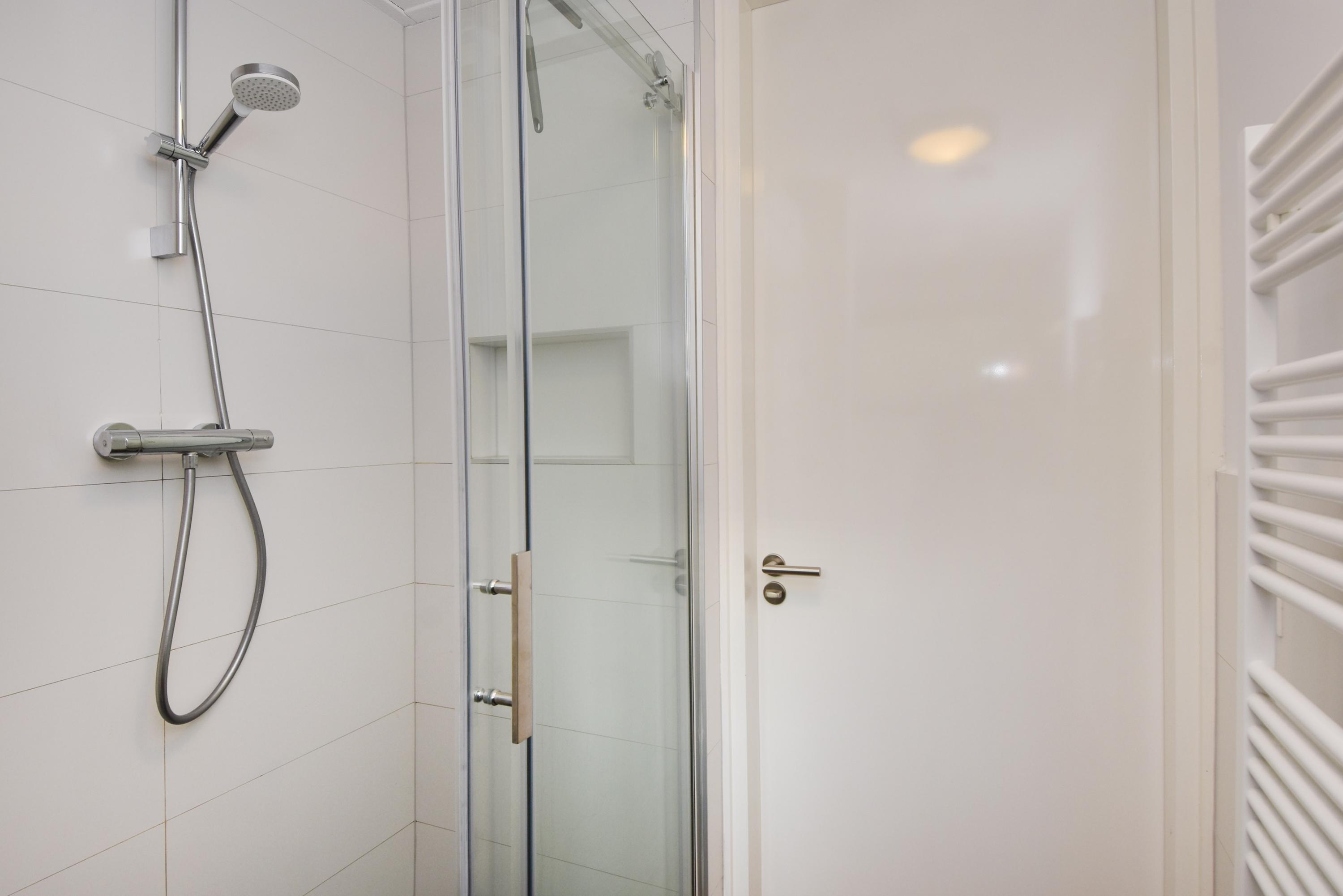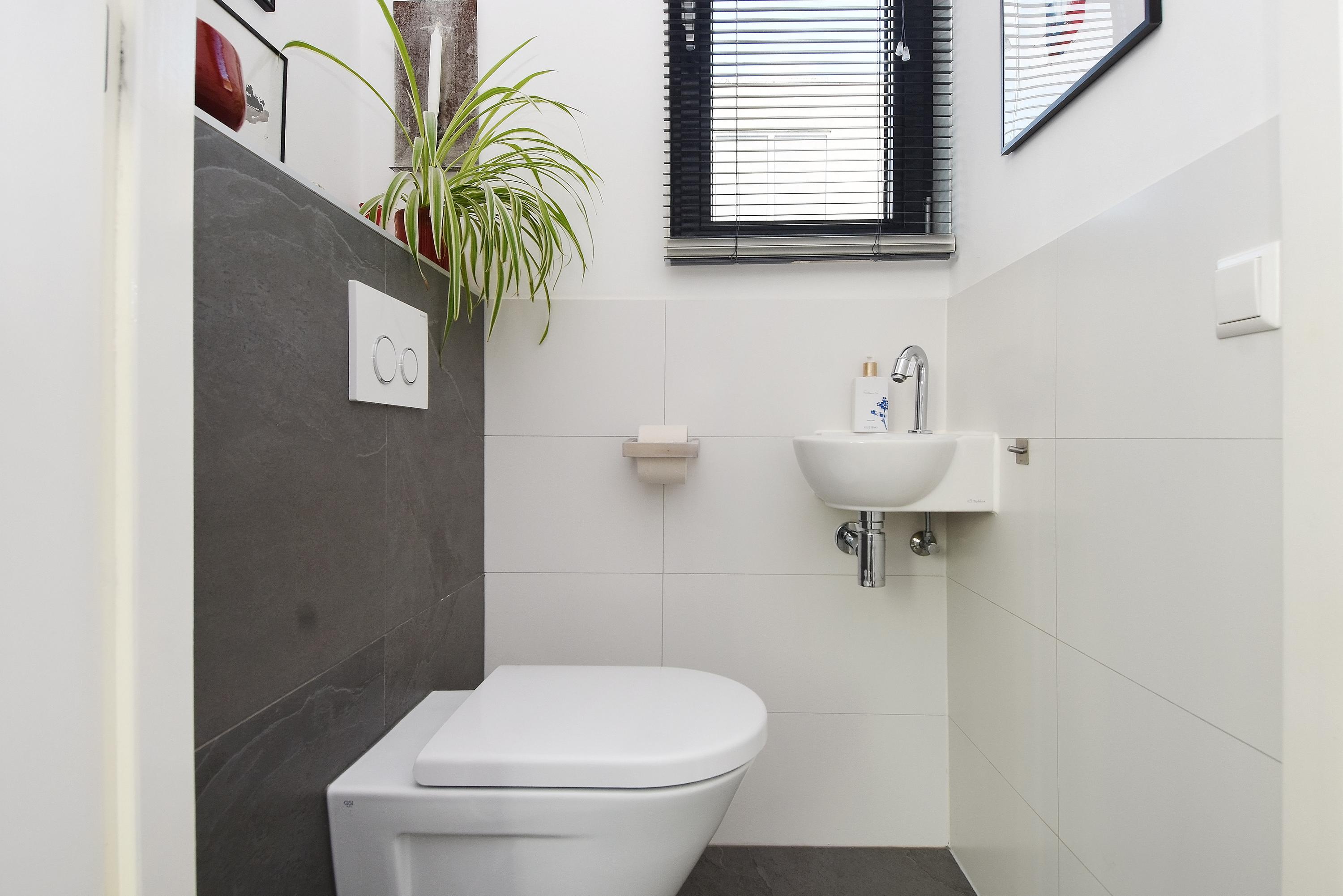 De hal, bij de entree van de woning, biedt toegang tot een bijkeuken met opstelplaats voor een wasmachine/droger/vriezer e.d. en tot een luxe toilet (hangend closet) met fontein. Vanuit hier bereik je ook de master bedroom met een badkamer ensuite, voorzien van een fraaie inloopdouche, ligbad en dubbele vaste wastafel + meubel.