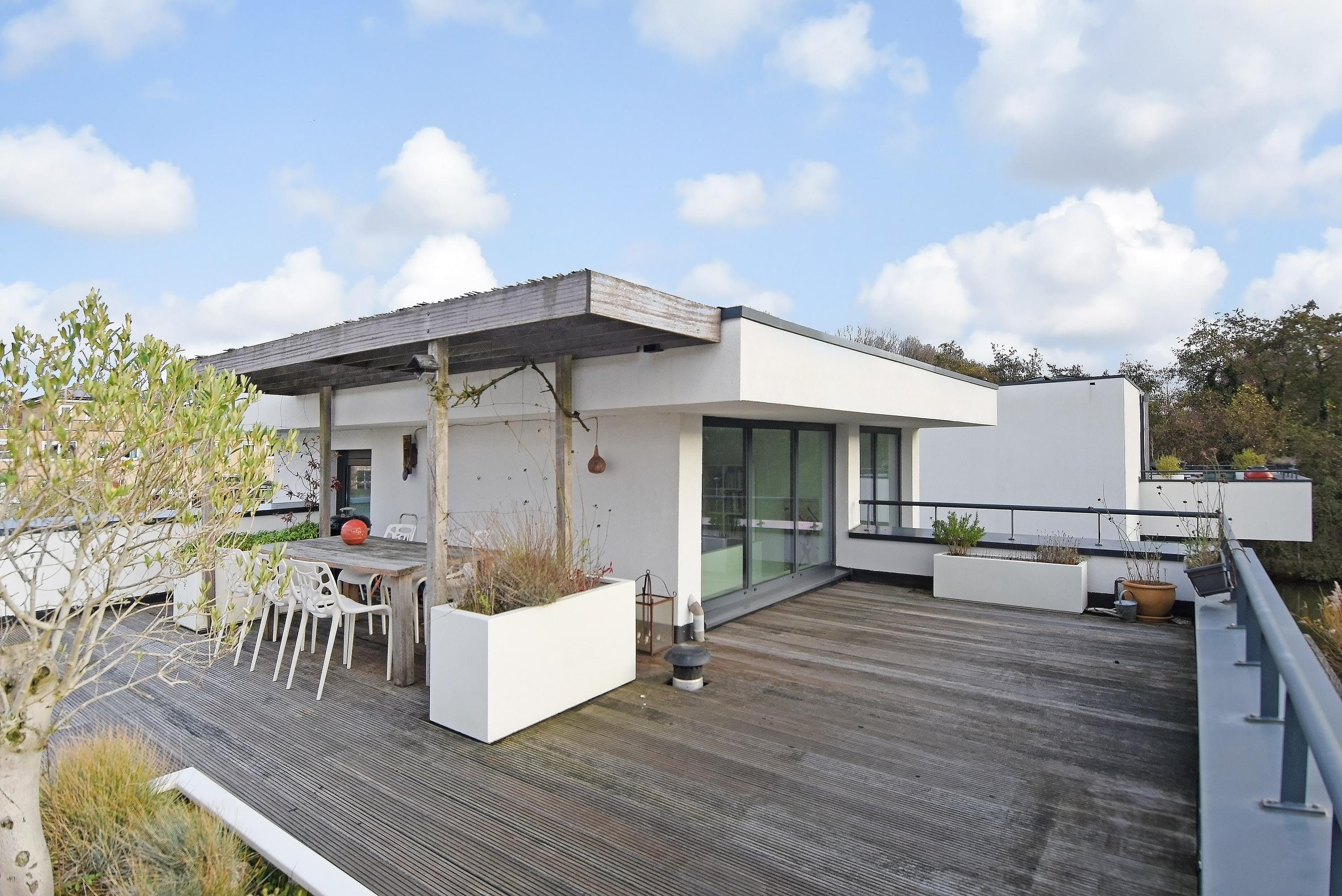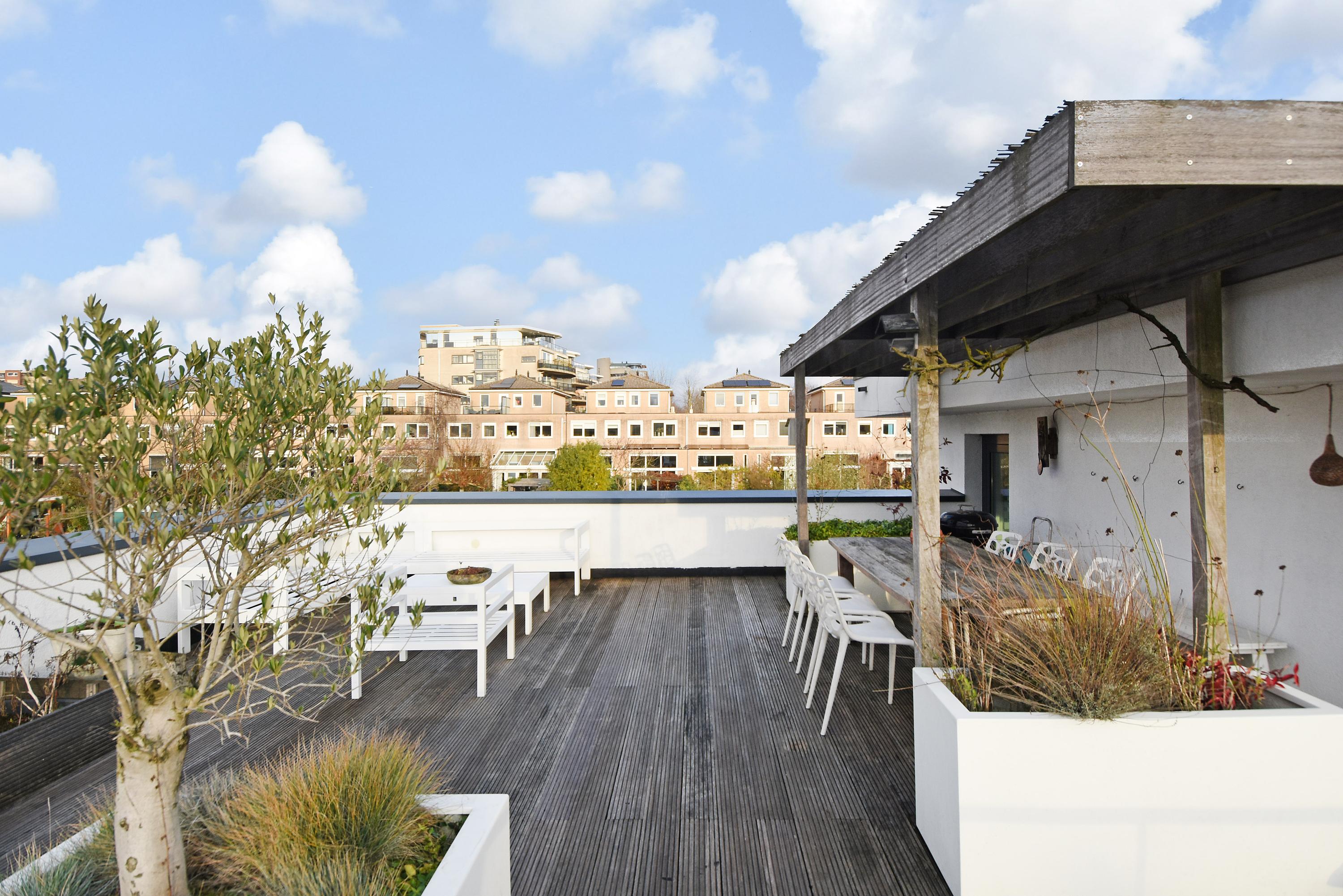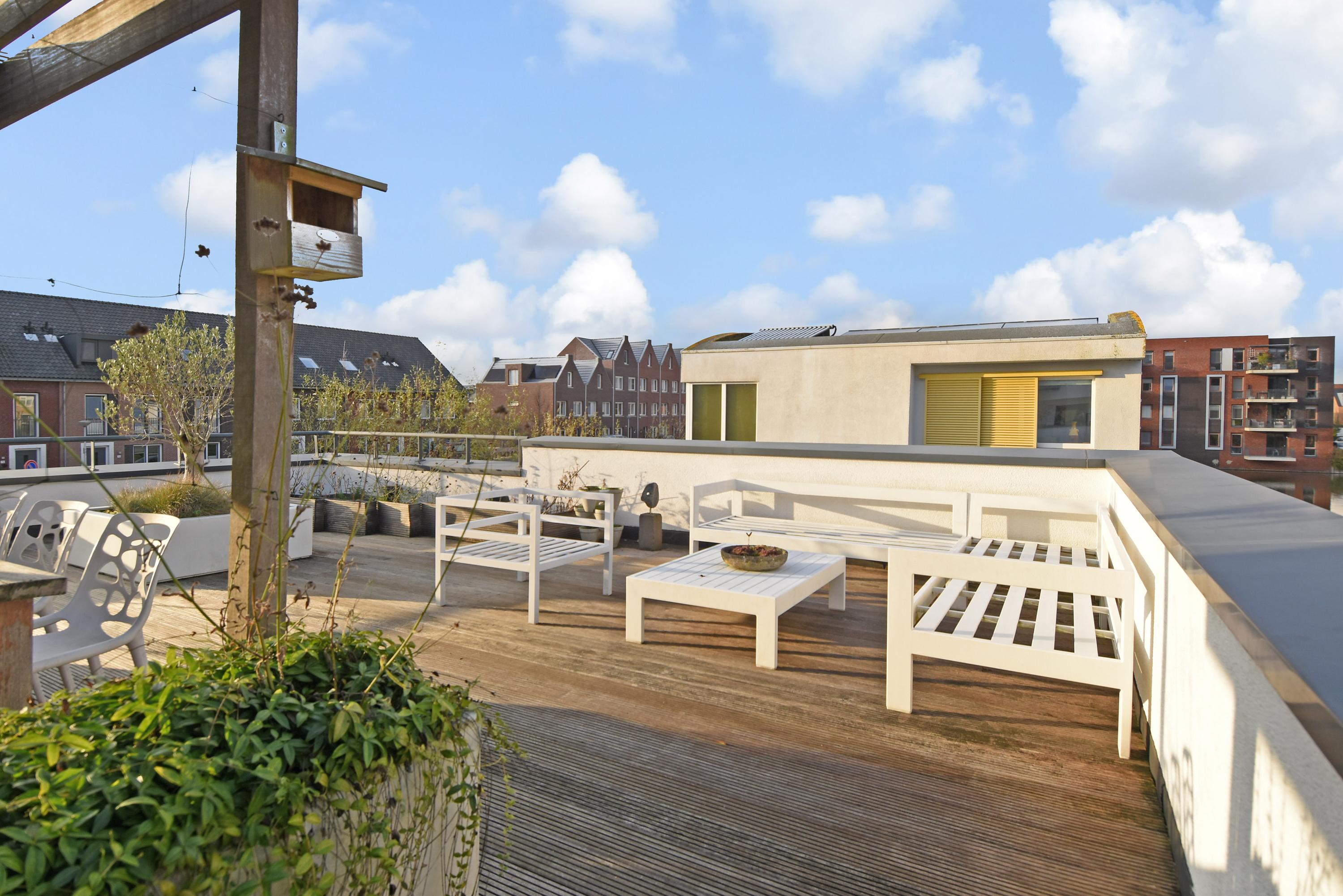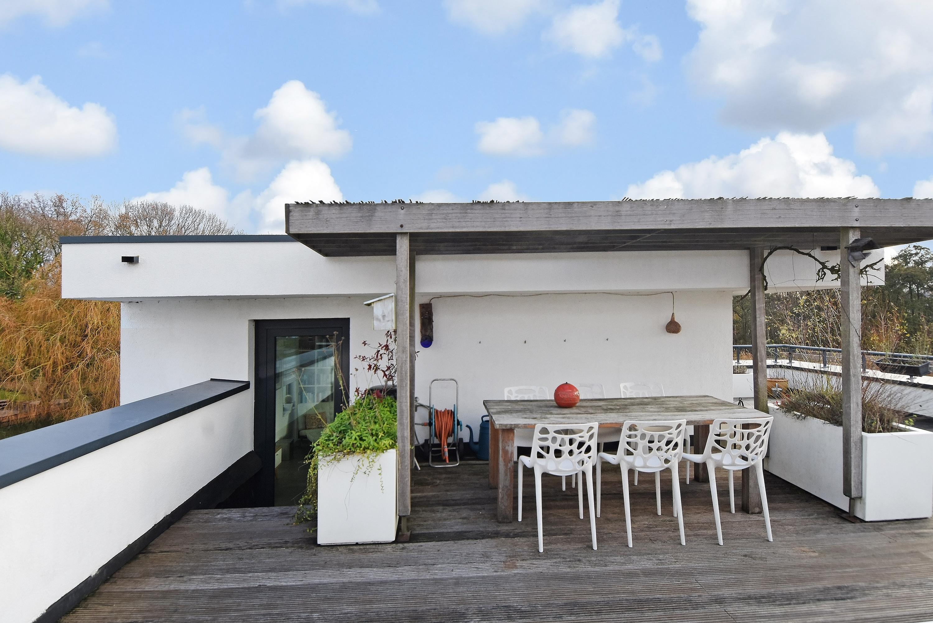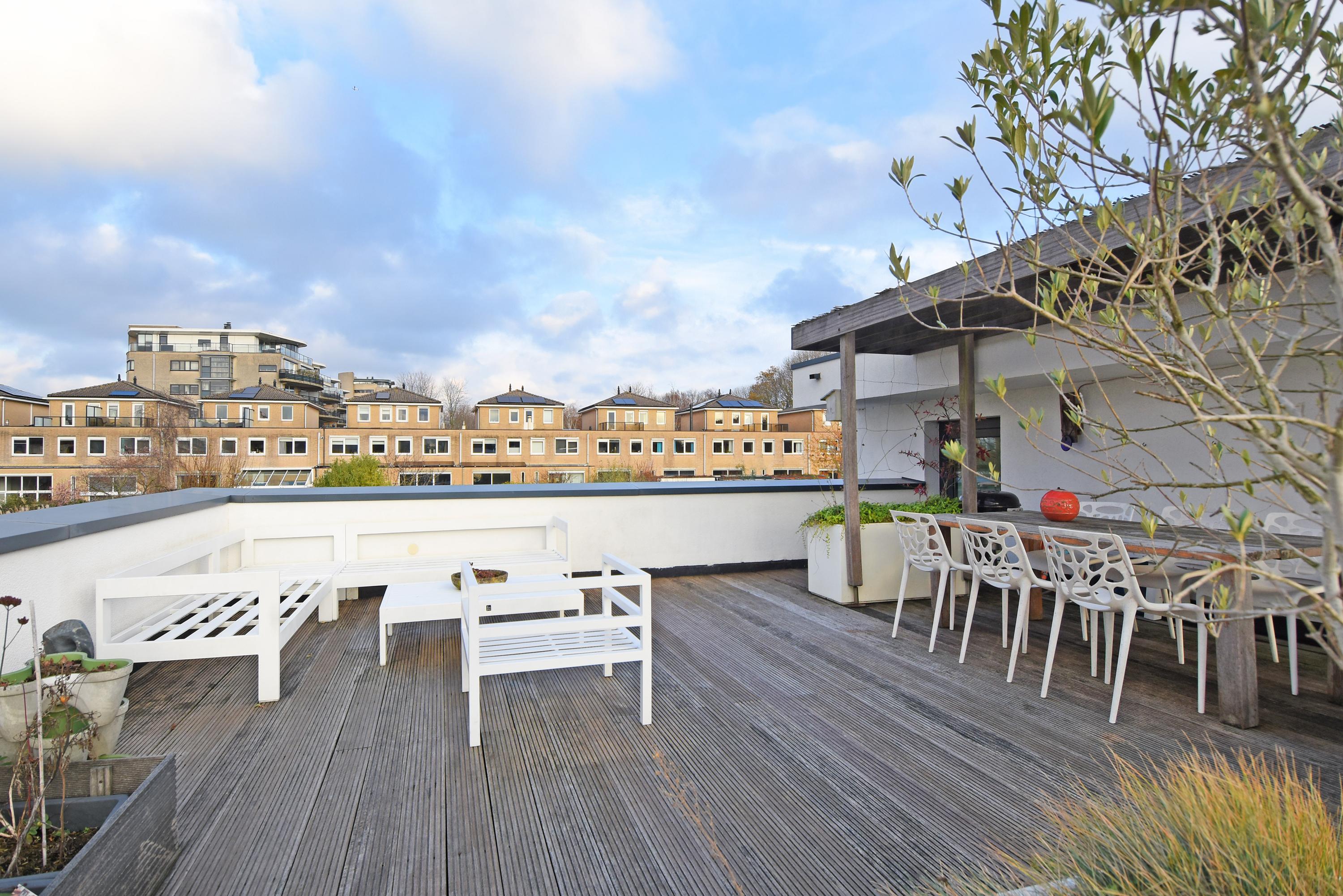 Vanuit de woonkeuken kom je via een vaste trap naar boven op de vide, die je voor meerdere doeleinden (o.a. werkplek, bibliotheek, tv-kamer) kunt gebruiken. De grote verrassing is het aansluitend gelegen, fraai aangelegde en royale dakterras met veel privacy en gezelligheid, waar je werkelijk de gehele dag de zon kunt vinden.