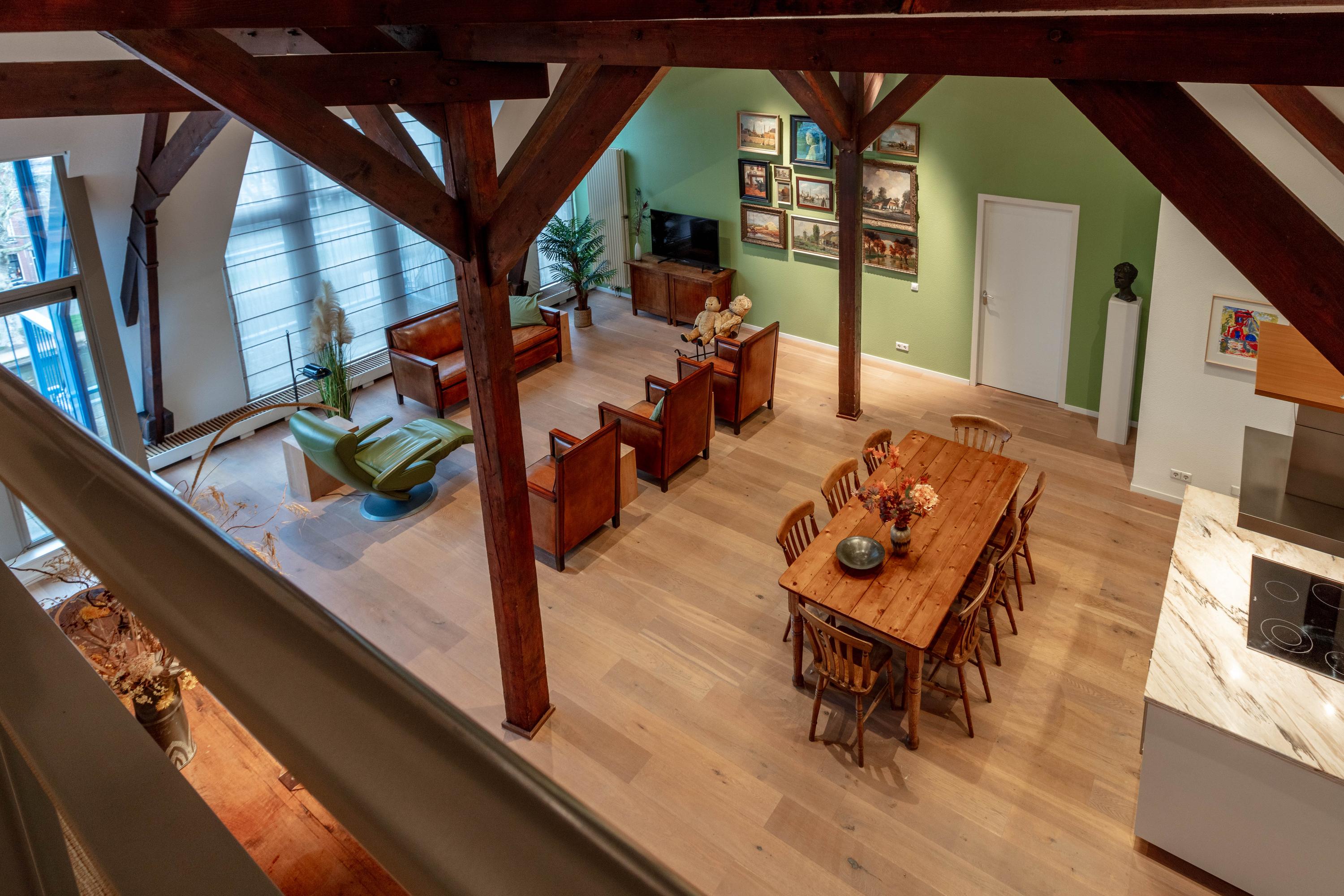 De bijzonder sfeervolle woonkamer is indrukwekkend door de unieke hoogte en fraaie zichtbare kapconstructie. De open keuken bevindt zich aan de achterzijde en beschikt over een kookeiland, volop kastruimte en diverse inbouwapparatuur. Vanuit de keuken is er prettig zicht op de woonkamer met een gezellig zitgedeelte en een apart eetgedeelte.