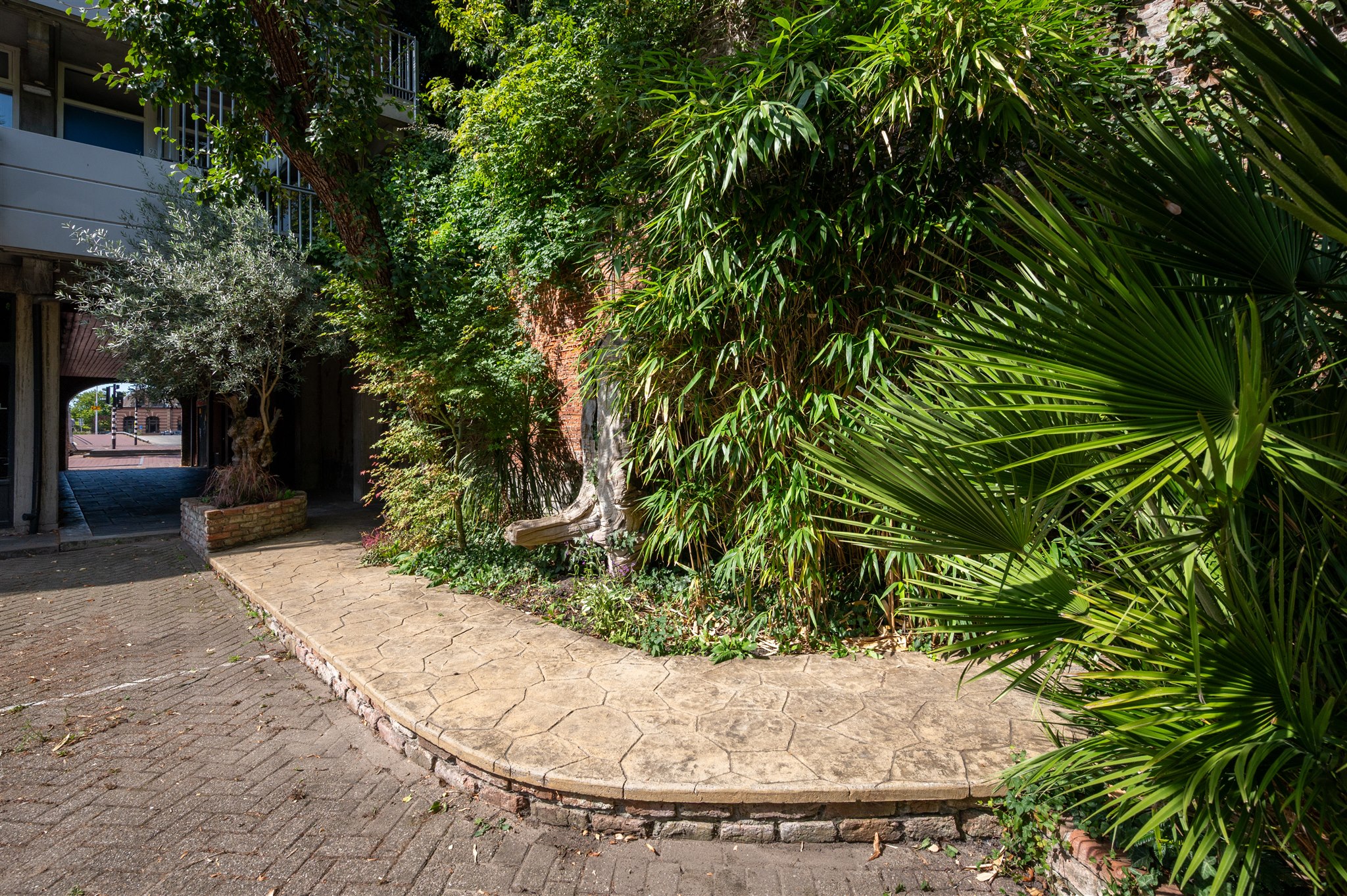 Achter de statige voordeur bevindt zich een indrukwekkende marmeren gang met ornamentenplafond. De hal biedt toegang tot de voor- en achterkamer, momenteel in gebruik als kantoor/werkkamer met een zeldzaam mooie schouw, een plafond in originele staat, en een antieke kroonluchter die de ruimte zacht verlicht. Vanuit de gang is er toegang tot de kelder van 27 m², uitgevoerd met een karakteristiek kruisgewelf. Verderop langs de wijnkelder kom je uit in de tuinkamer die is voorzien van vloerverwarming met een schilderij-achtig behang. Ernaast is een kleine pantry of zomerkeuken voor koffie, hapjes en drankjes, en hier is toegang tot de overdekte patio. Via deze keuken is er toegang tot de tropisch aangelegde achtertuin van circa 100 m², met een stenen schuur en een achterom naar het binnenterrein van het naastgelegen appartementencomplex. Hier is, middels recht van overpad, parkeergelegenheid voor drie auto's.