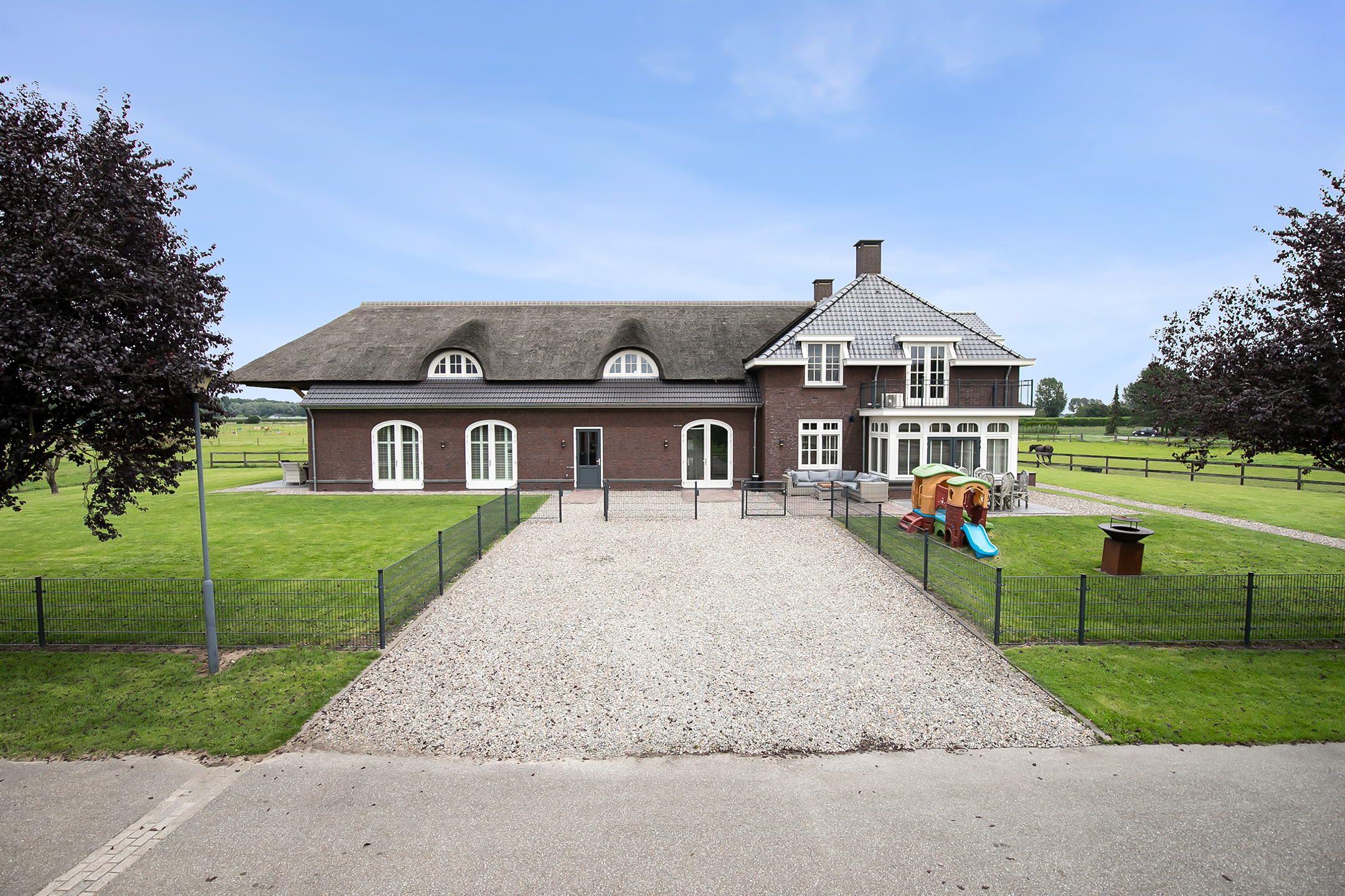De overdekte entree met een dubbele openslaande voordeur, geeft deze villa een fraaie uitstraling. De ruime ontvangsthal met imposante houten trap biedt toegang tot de woonkamer en de 1e verdieping. De hal is voorzien van een natuurstenen tegelvloer, stucwerk wanden en een stucwerk plafond. De royale leefkeuken met eetkamergedeelte is voorzien van een natuurstenen tegelvloer, stucwerk wanden en een stucwerk plafond met inbouwverlichting. De keuken beschikt over een inrichting in een wandopstelling met apparatenwand en een kook- en spoeleiland. De apparatenwand is verder uitgerust met een oven, koffiezetapparaat, een stoomoven en een koelkast. Het eiland beschikt over een 5-pits gaskookplaat met ingebouwde afzuigkap in het plafond, een spoelbak en een vaatwasser. Diverse kastjes en lades zorgen voor veel opbergruimte. Een grote erker/uitbouw met openslaande deuren zorgen voor toegang naar de tuin. De vele raampartijen zorgen voor veel natuurlijke lichtinval. Een haard zorgt voor extra sfeer en warmte in de ruimte. Vanuit de woonkamer is er een fraai uitzicht op de paardenweides. En ook hier zorgen grote raampartijen en dubbele openslaande deuren voor een zee van licht. Daarnaast is er een prachtige, grote schouw aanwezig met een gashaard welke zorgt voor nog extra sfeer en warmte in de ruimte. Schuifdeuren zorgen dat de woonkamer afgesloten kan worden van de keuken/eetgedeelte. Halfronde openslaande deuren in de zijgevel van de woning zorgen voor toegang tot het voorhuis. De ruime entreehal biedt toegang tot de bijkeuken/wasruimte, woonkamer, toiletruimte en de meterkast. De bijkeuken/wasruimte is uitgerust met een gootsteen. Tevens zijn hier de aansluitingen voor de wasapparatuur gesitueerd. Vanuit hier is er toegang tot de kantoor/werkkamer. De kantoorruimte is een fijne ruimte welke uiteraard voor diverse doeleinden geschikt is, zoals bijvoorbeeld een speelkamer of chillroom.