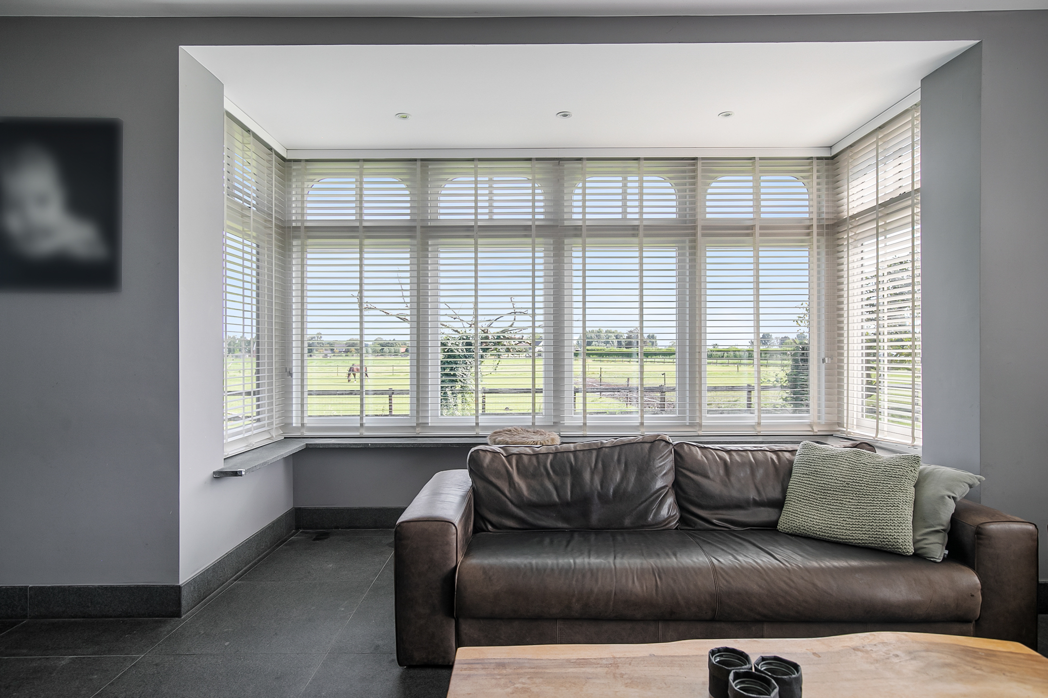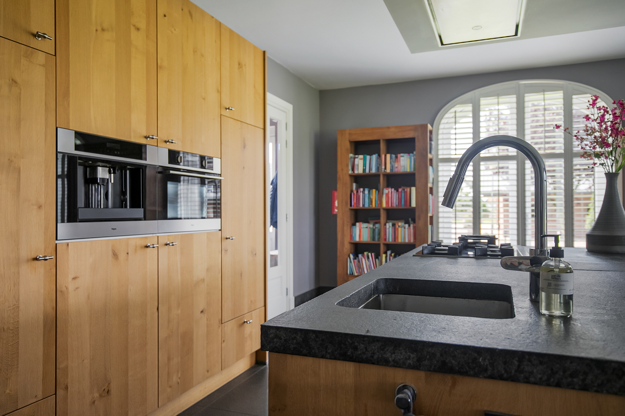 - De raampartijen in het achterhuis zijn voorzien van sfeervolle shutters.