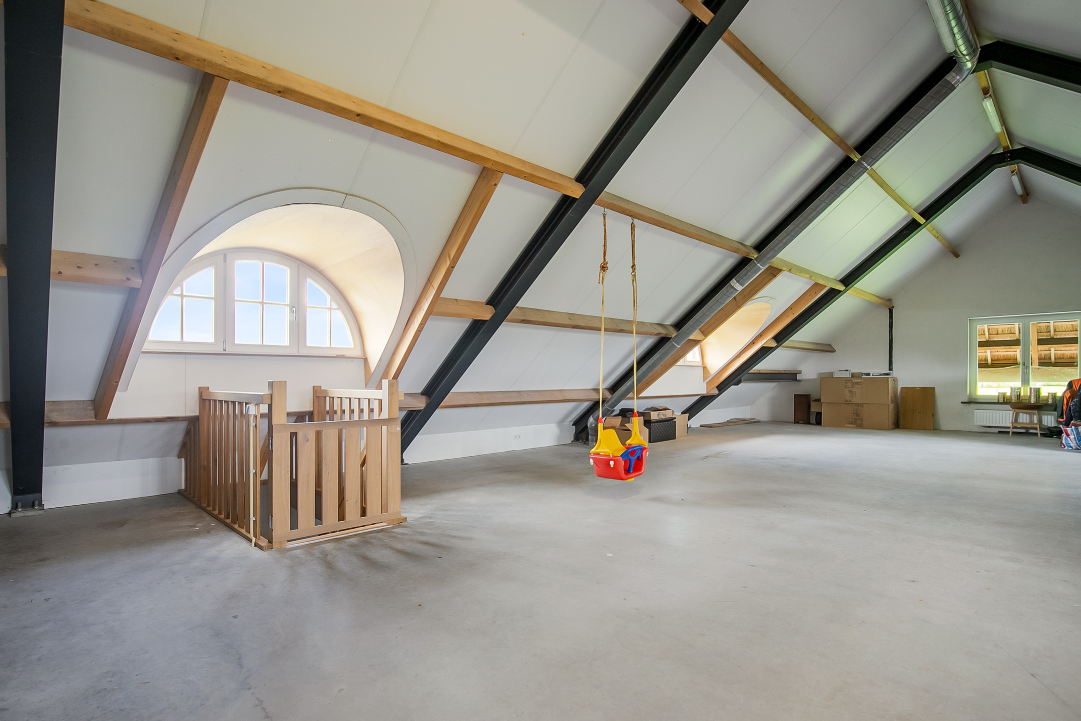 De zeer royale zolderruimte is op dit moment vooral in gebruik als opslagruimte, maar kan uiteraard ook worden gebruikt en ingericht voor diverse andere doeleinden. 4 fraaie halfronde dakkappelen zorgen voor natuurlijk lichtinval en ventilatie. In deze ruimte zijn de opstelling voor de CV-combiketel (Nefit), de unit voor de mechanische ventilatie en de unit voor de vloerverwaming gesitueerd. Een vaste trap zorgt voor toegang naar de hal van het achterhuis.