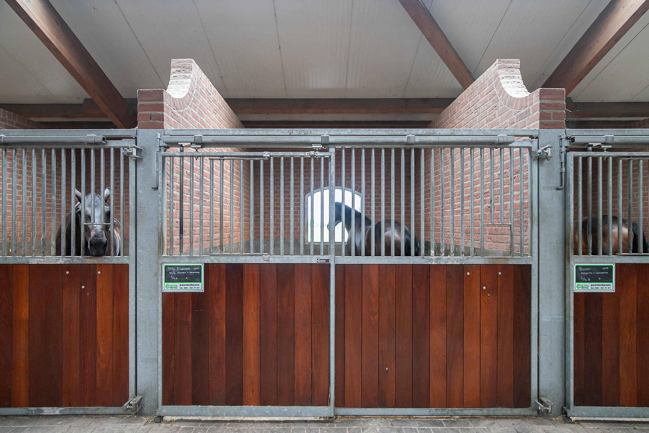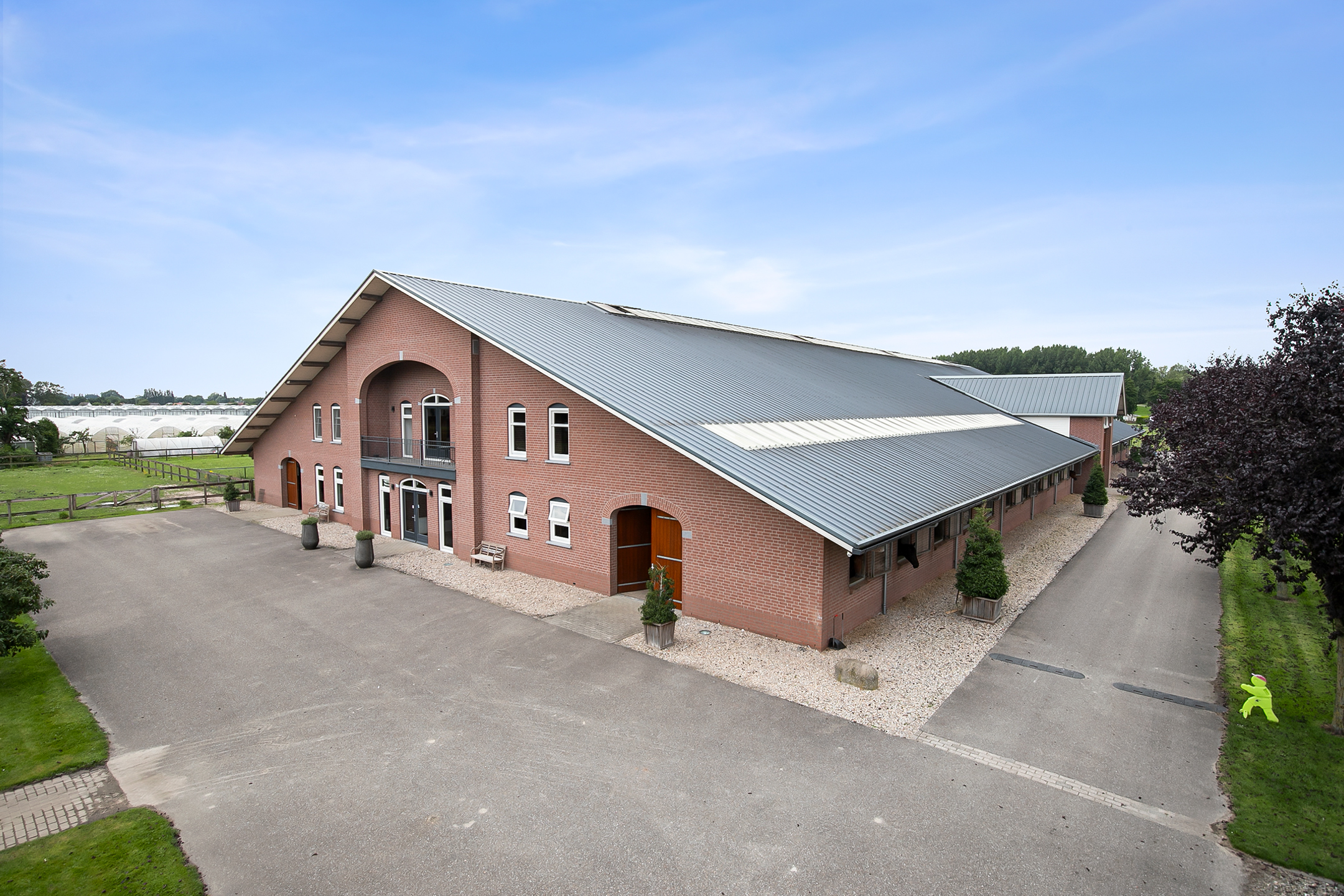 De hal aan de voorzijde van de rijhal is voorzien van een beklinkerde vloer en biedt toegang tot een berging, toiletruimtes, wasruimte en een winkelruimte. Een bordestrap biedt toegang tot de 1e verdieping. Hier is de ontvangstruimte en een appartement gesitueerd. De ontvangstruimte is voorzien van een tegelvloer, stucwerk wanden en een systeemplafond. Er is een keukenblok en een bar aanwezig. Openslaande deuren bieden toegang tot een balkon aan de voorzijde van de rijhal. Grote raampartijen bieden een fraai uitzicht op de binnenpiste en de stallen. Ook is er vanuit de ontvangstruimte toegang tot een balkon boven de binnenpiste.Het appartement is uitgerust met een woonkamer met open keuken, 2 slaapkamers en een ruime badkamer. Het appartement is voorzien van een tegelvloer. Het keukenblok beschikt over een spoelbak, inductiekookplaat, vaatwasser, koelkast en een combimagnetron. De badkamer is geheel betegeld en verder voorzien van een doucheruimte, wastafel met meubel en een zwevend toilet. Achter een praktische schuifwand is een wasruimte gesitueerd. De binnenpiste (ca. 21x61 mtr.) is voorzien van een professionele bodem (Ben Agterberg), een fraaie hardhouten bakrand. Gewelfde houten spanten zorgen voor extra sfeer. Een lichtstraat in de nok zorgt voor fraai natuurlijke lichtinval. Ook is er LED-verlichting aanwezig. De 39 paardenboxen zijn verdeeld over twee stallengangen. De boxen zijn voorzien van deels hardhouten / deels gegalvaniseerde voorwanden en metselwerk tussen- en achterwanden. De deuren van de boxen zijn draaibaar. De boxen zijn tevens uitgerust met een buitenluik. Iedere stallengang beschikt over eigen faciliteiten zoals wasplaatsen en een zadelkamer. Tussen de gangen zijn nog drie ruime loopstallen gesitueerd. De wasplaatsen zijn voorzien van een warm- en koud watervoorziening. Ook is er een plaats voor de hoefsmid en fysio aanwezig. Aan de achterzijde is nog een appartement gesitueerd. Middels een bordestrap aan de buitenzijde is er toegang. Hier is tevens een balkon gesitueerd. Het appartement beschikt over een ruime woonkamer met open keuken, 3 slaapkamers, een ruime badkamer, een bijkeuken, wasruimte en een toiletruimte.Aan de achterzijde van het perceel is een vrijstaande veldschuur gesitueerd. De schuur is opgetrokken uit metselwerk plinten met damwand gevels en het geisoleerde dak is met sandwichpanelen gedekt. Aan de voorzijde is de veldschuur voorzien van windbreekgaas. In de schuur is een voersilo aanwezig. Er zijn momenteel 14 paardenboxen en een longeercirkel gesitueerd, maar uiteraard is deze schuur geheel naar wens ook uitermate geschikt voor diverse andere doeleinden.