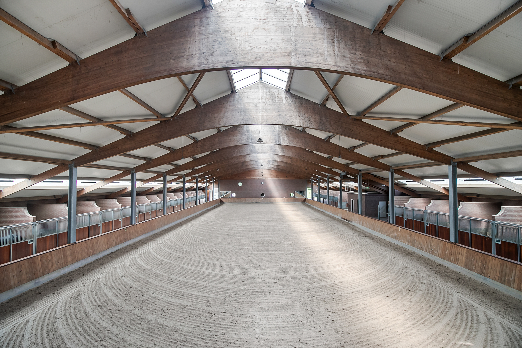 De rijhal is opgetrokken uit metselwerk gevels met spanten. Een lichtstraat in de nok en boven de paardenboxen zorgt voor veel natuurlijke lichtinval. Openslaande deuren in de voorgevel zorgen voor toegang.