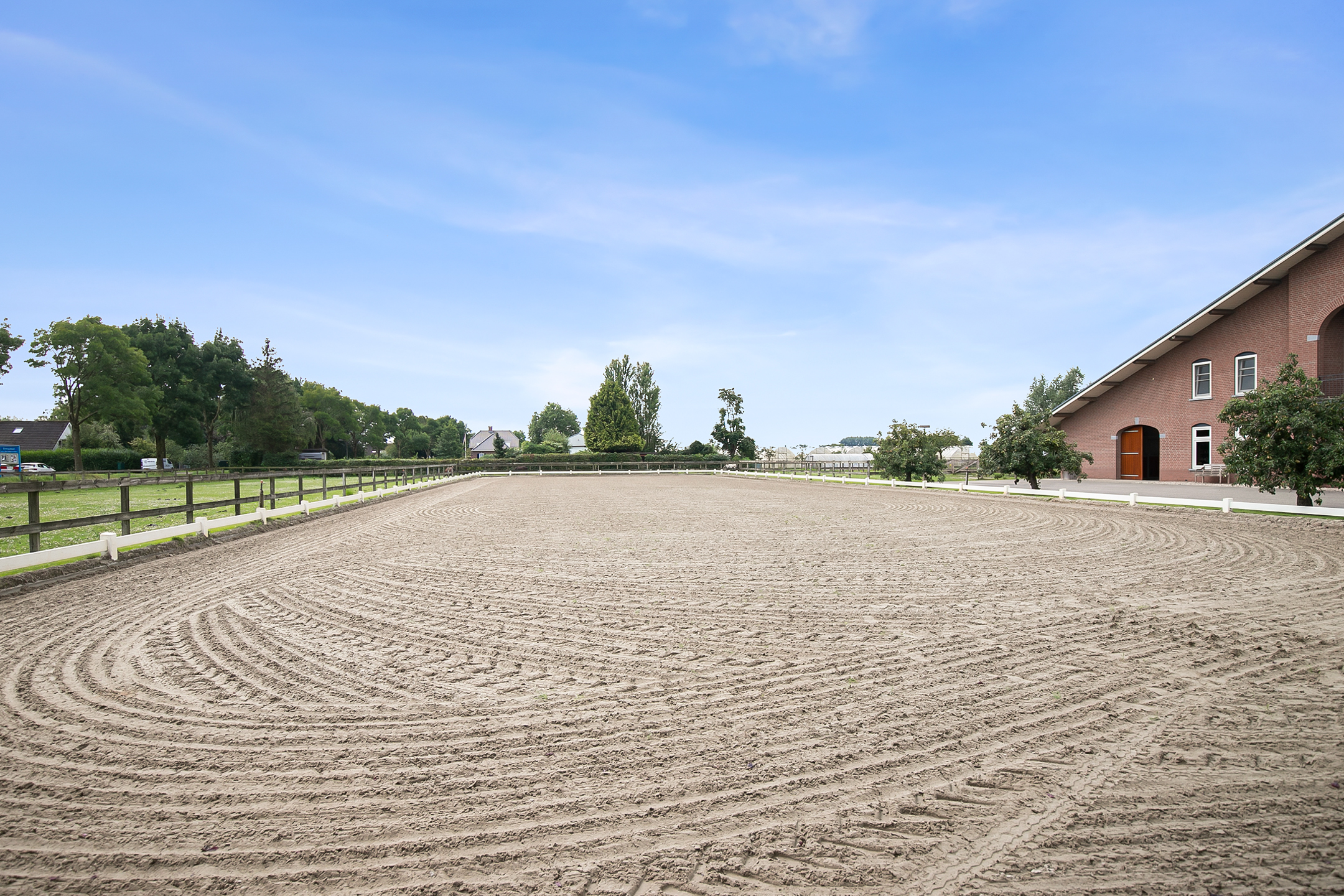 De naastgelegen longeercirkel is voorzien van een houten omheining. De bodem is voorzien van zand. Een coniferen haag zorgt voor een fraaie groene omheining.