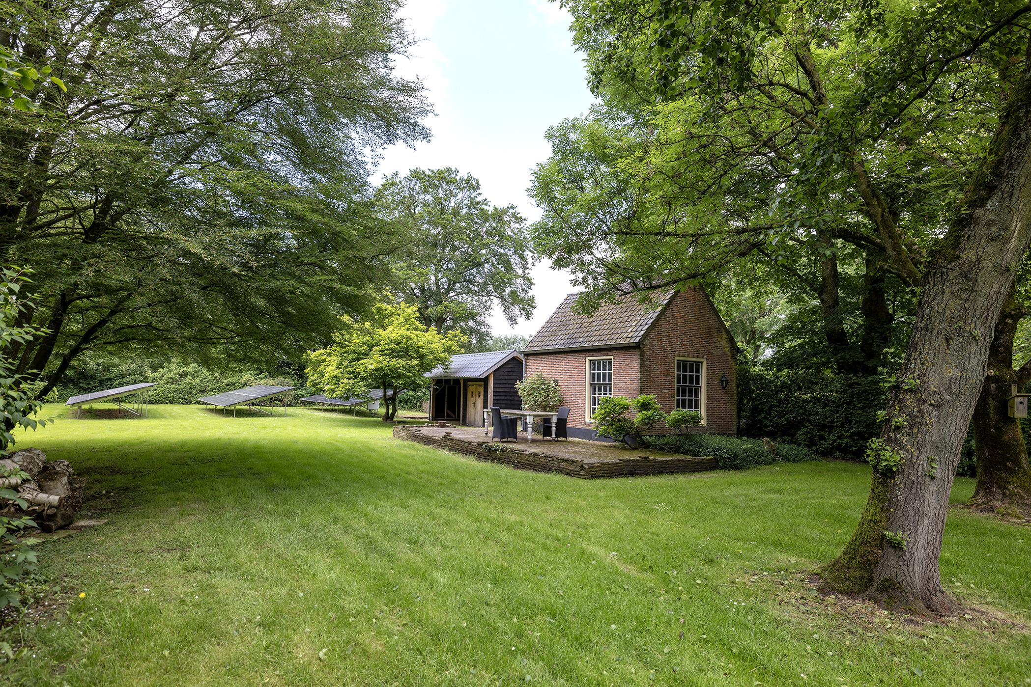 De hooiberg fungeert nu als overkapping voor fietsen, maar ook die ruimte is naar eigen smaak in te vullen. En de tuin? Die is niet alleen fraai aangelegd met mooie zichtlijnen, maar ligt ook perfect op de zon. Achterin vinden we de zonnepanelen en een houten schuur met overkapping – voor al uw tuinspullen en/of hobbyprojecten.