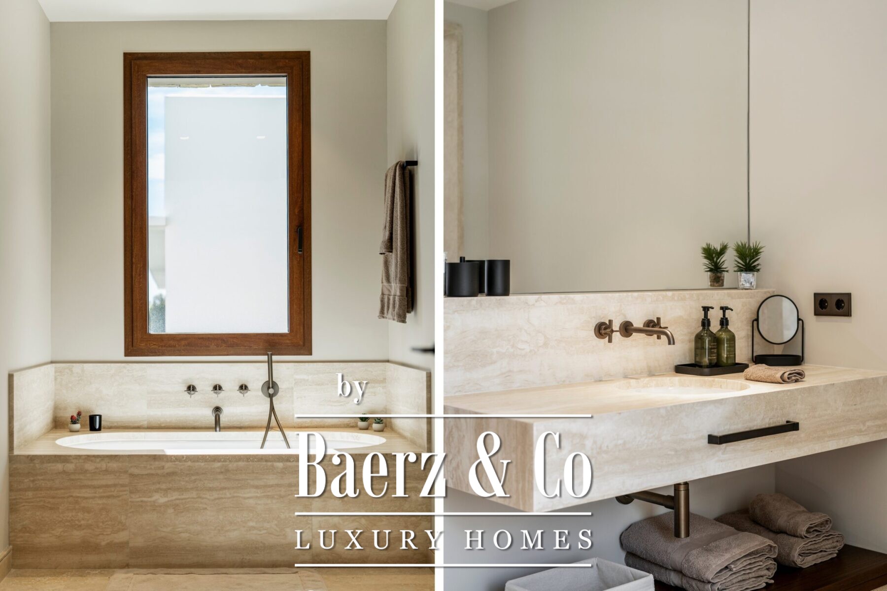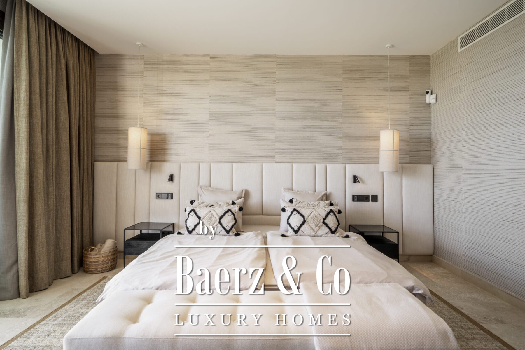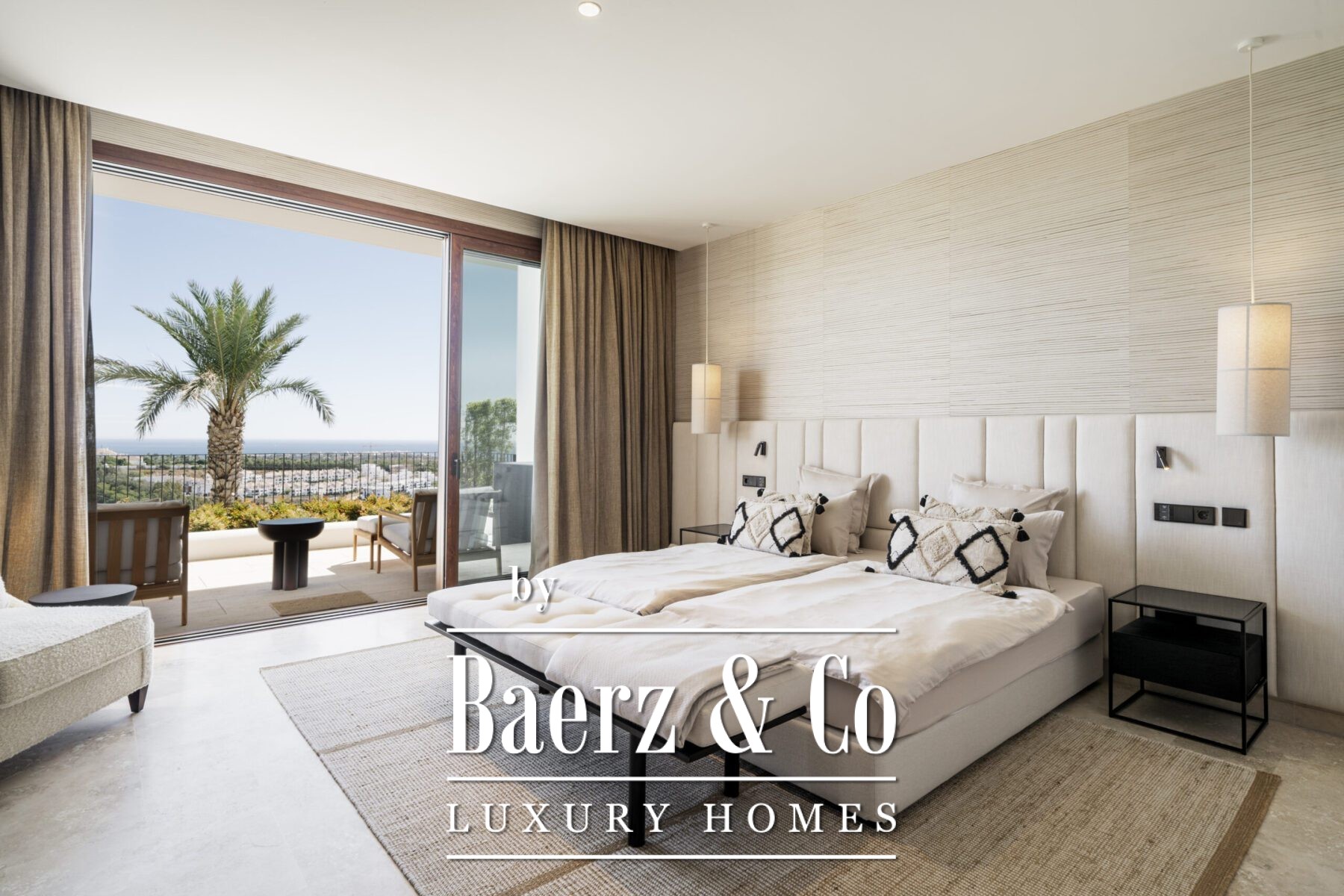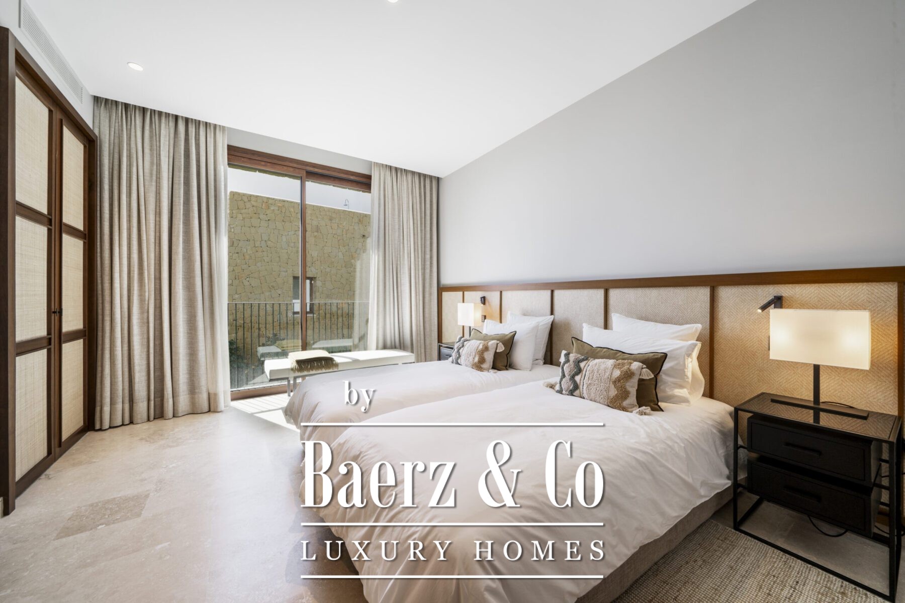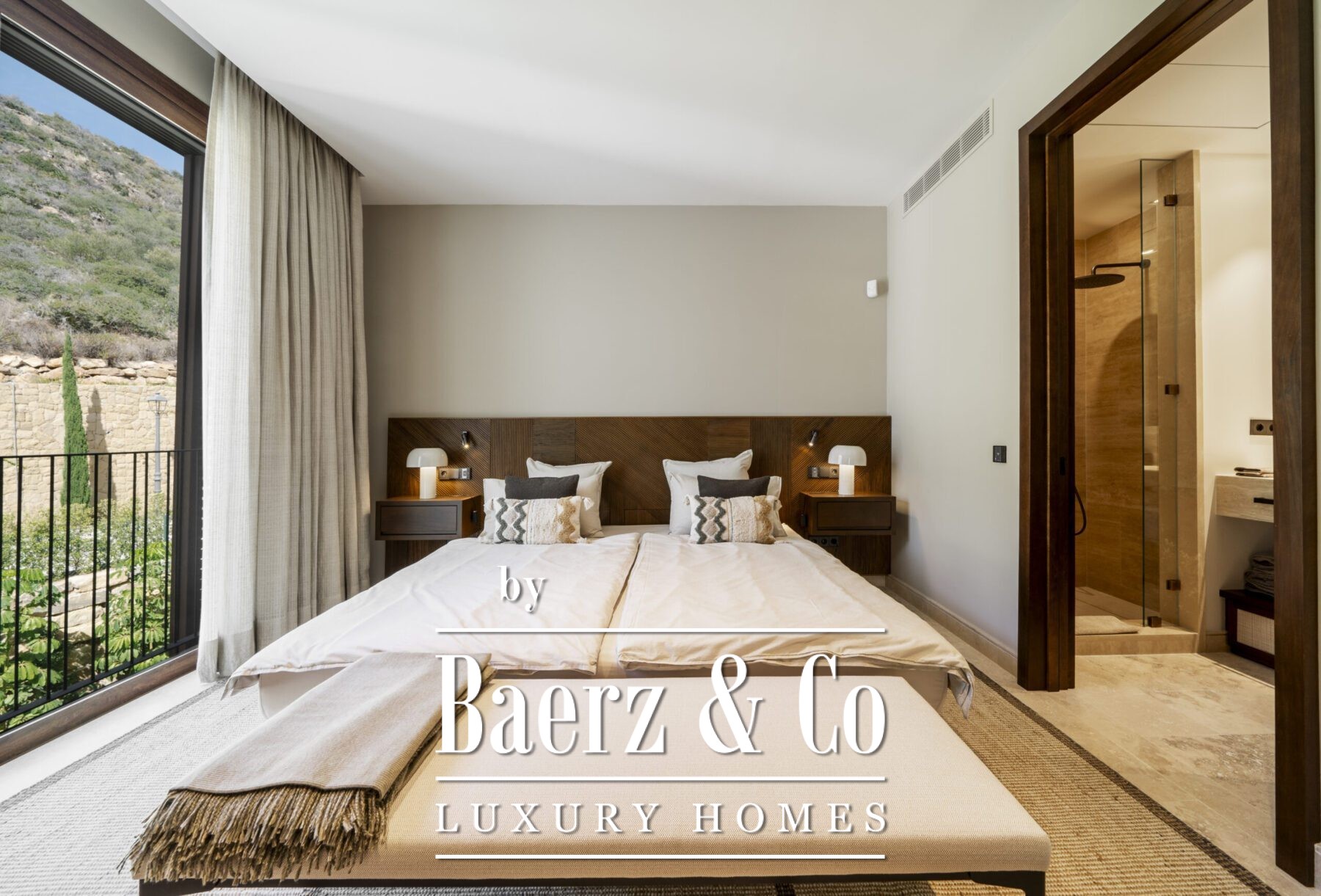 This luxury apartment includes three spacious en-suite bedrooms, each adorned with warm sand-toned Carrara marble bathrooms, complete with double sinks and showers. The master suite boasts a bespoke walk-in closet, a bathtub, and an immense window that opens directly onto the terrace. Characterful wooden finishes and high-quality materials throughout enhance the inviting atmosphere. The muted palette in sandy tones creates a warm aesthetic, harmonising beautifully with the natural surroundings.