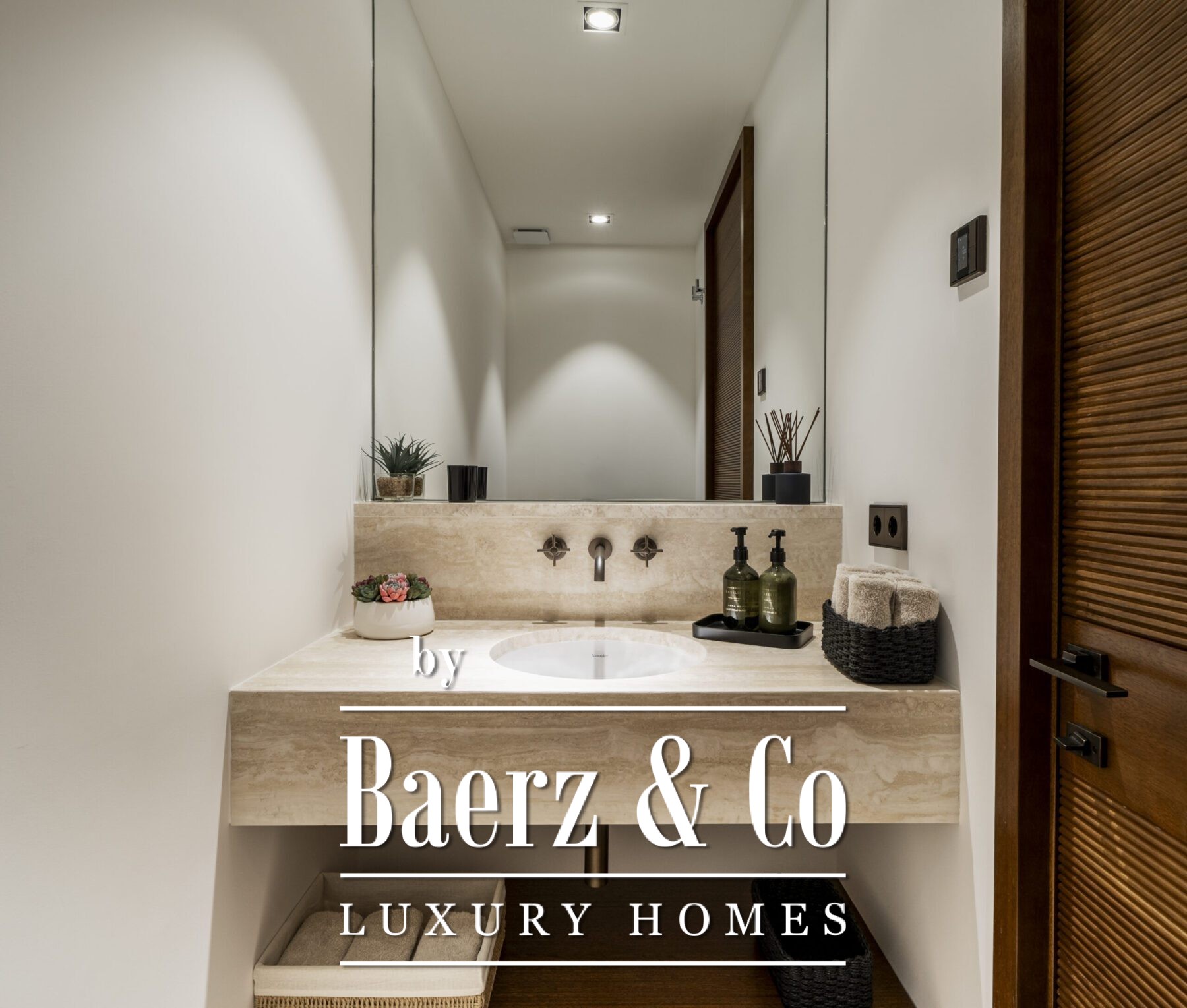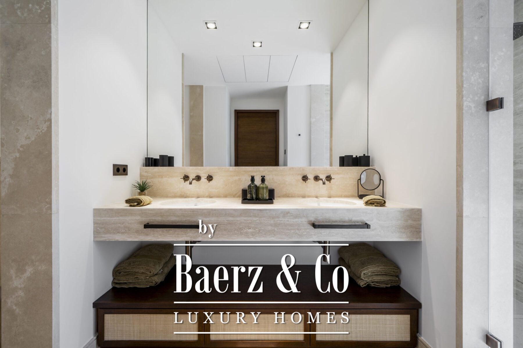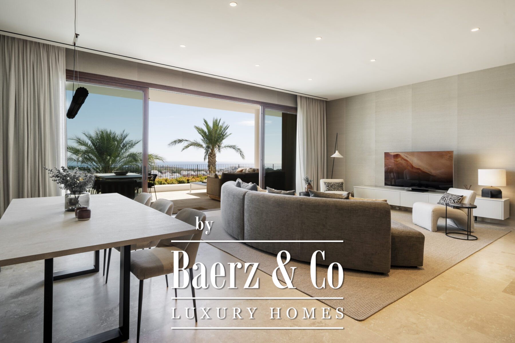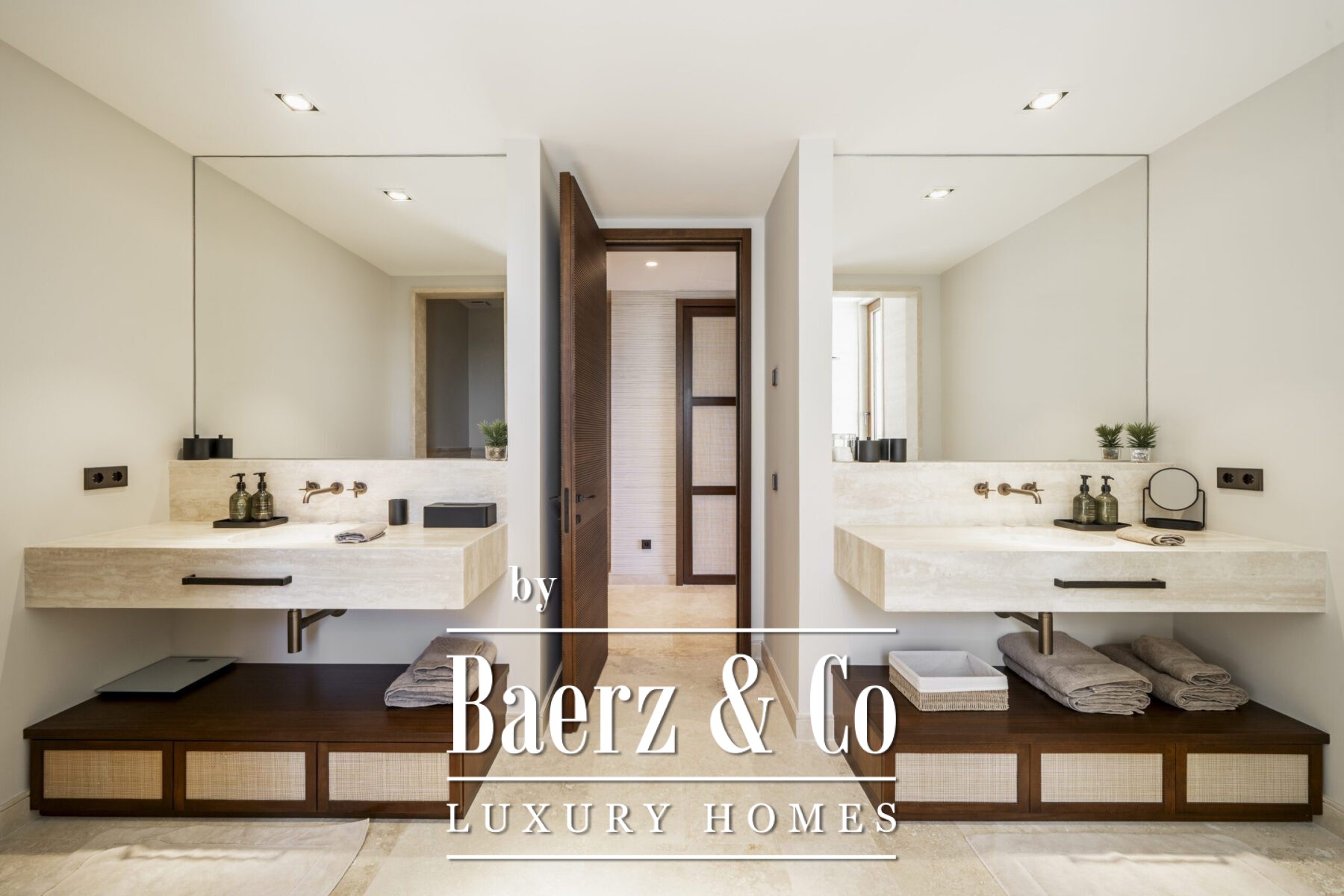 This luxury apartment includes three spacious en-suite bedrooms, each adorned with warm sand-toned Carrara marble bathrooms, complete with double sinks and showers. The master suite boasts a bespoke walk-in closet, a bathtub, and an immense window that opens directly onto the terrace. Characterful wooden finishes and high-quality materials throughout enhance the inviting atmosphere. The muted palette in sandy tones creates a warm aesthetic, harmonising beautifully with the natural surroundings.