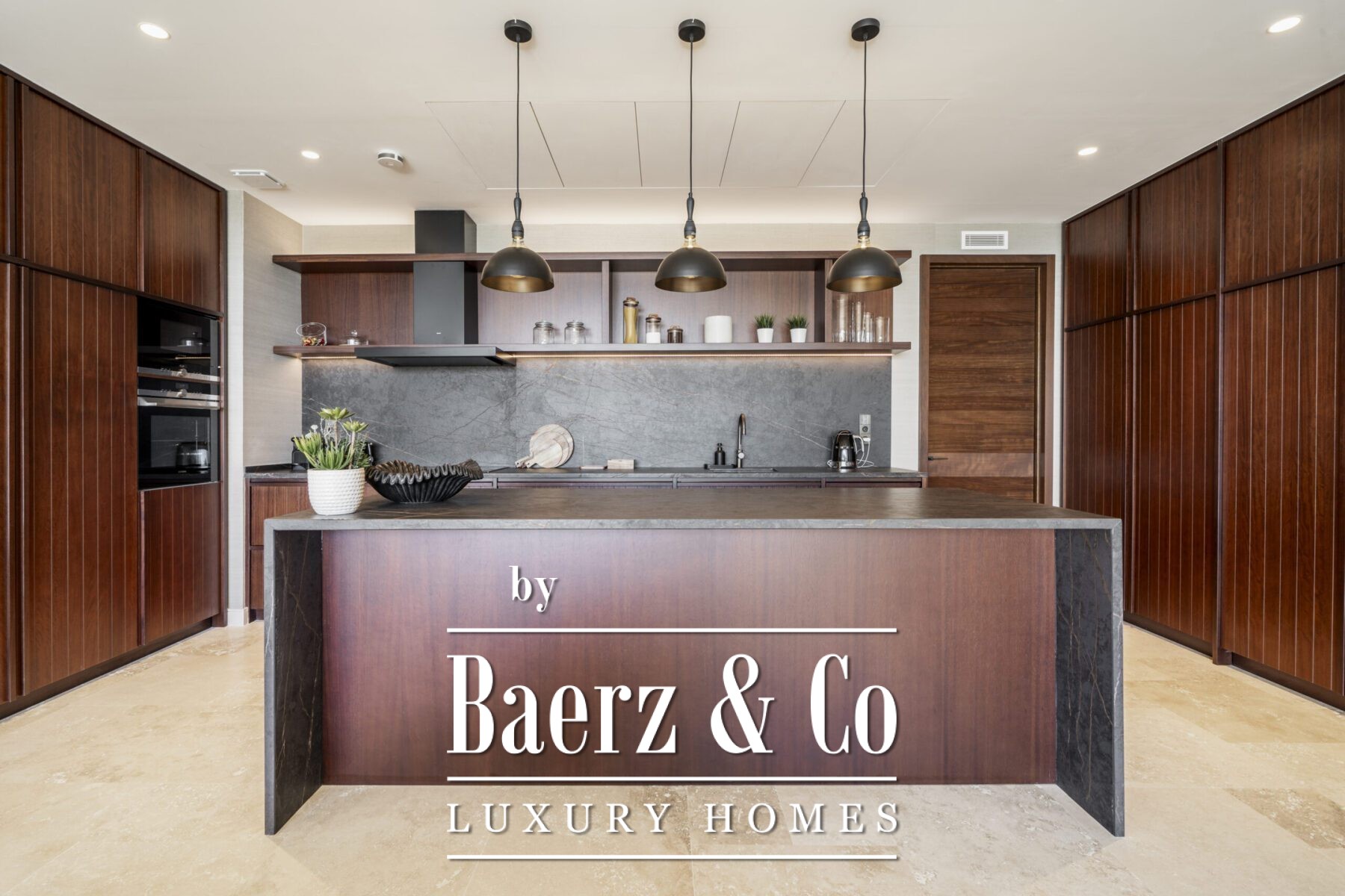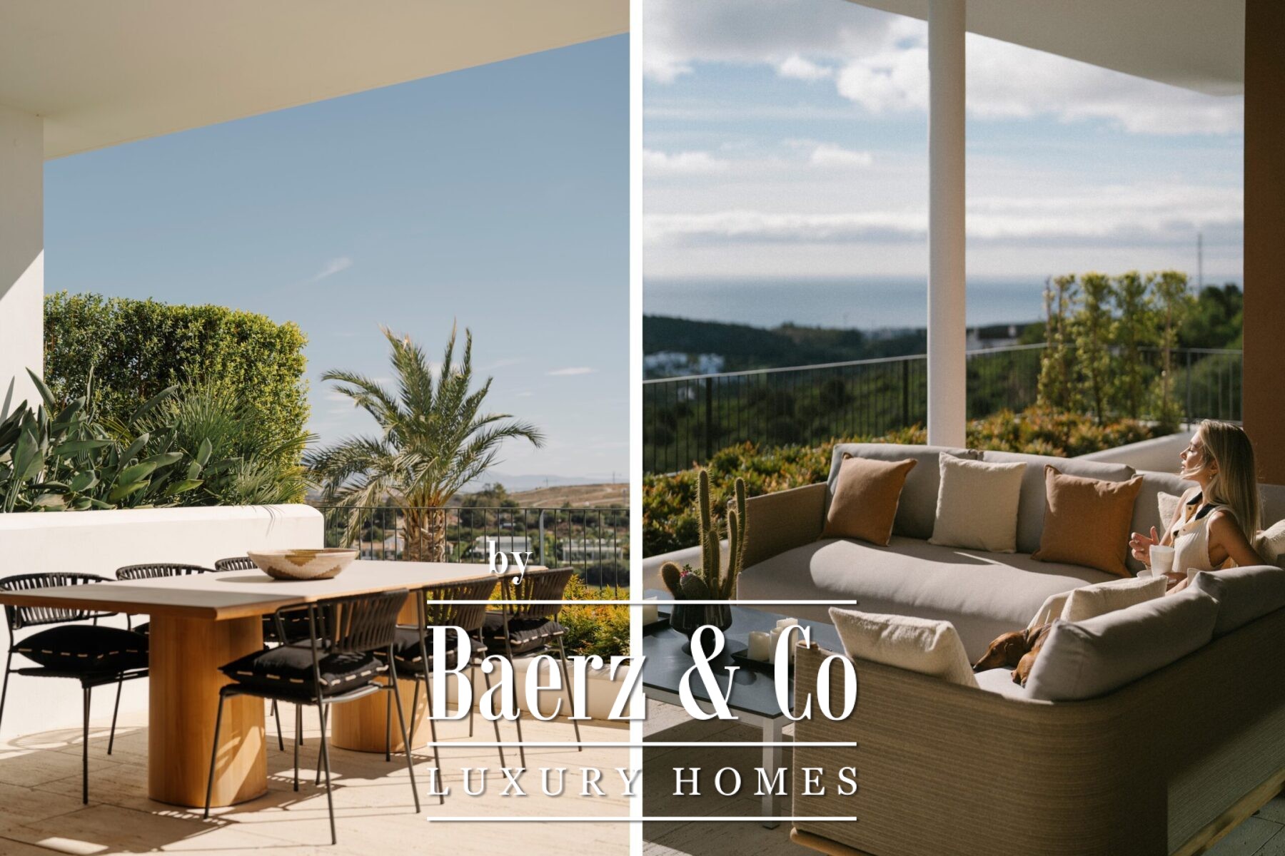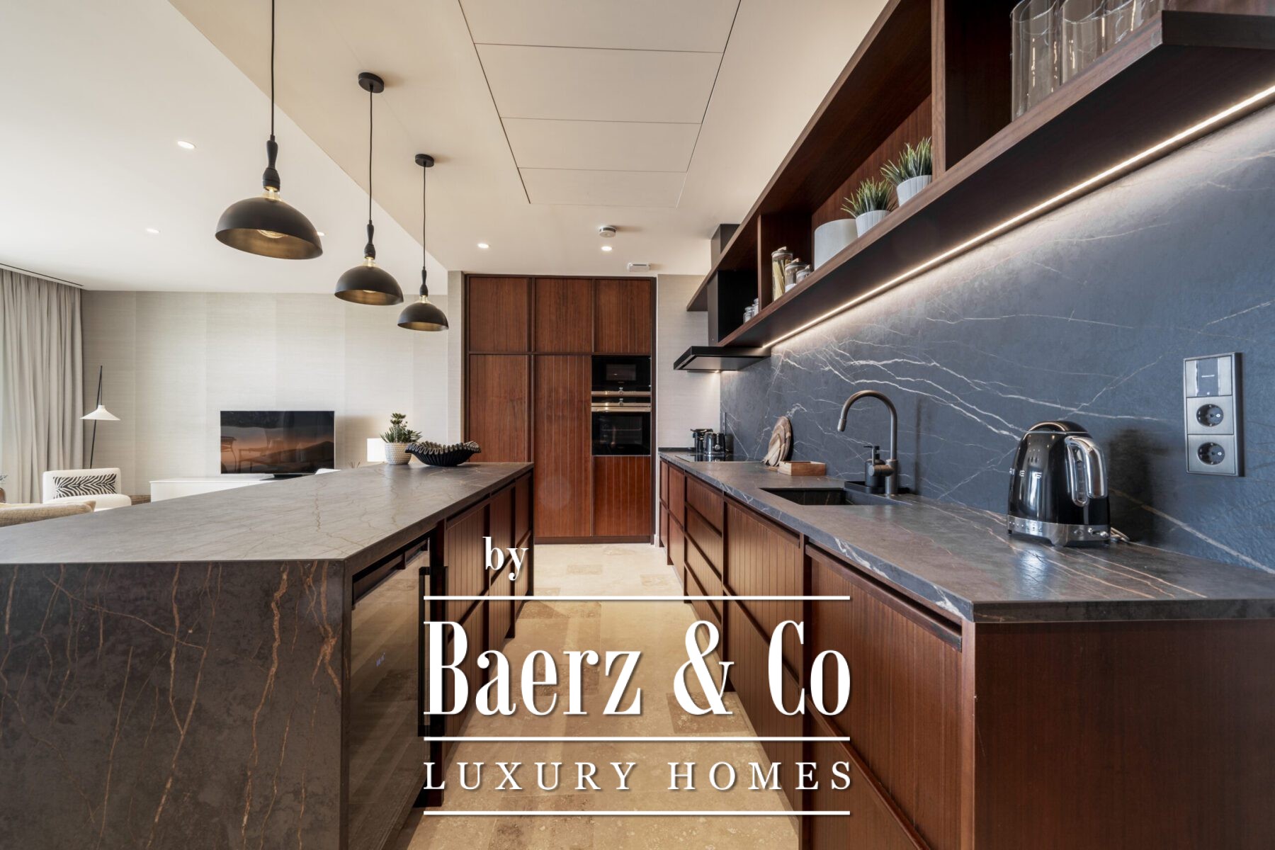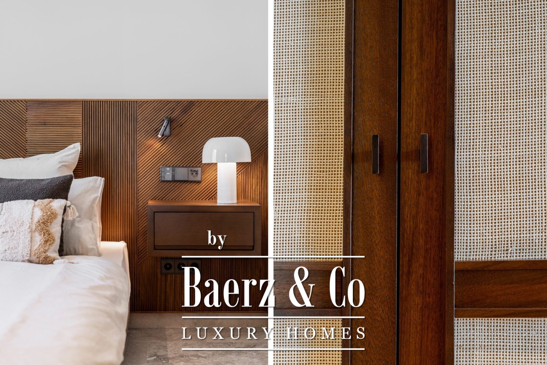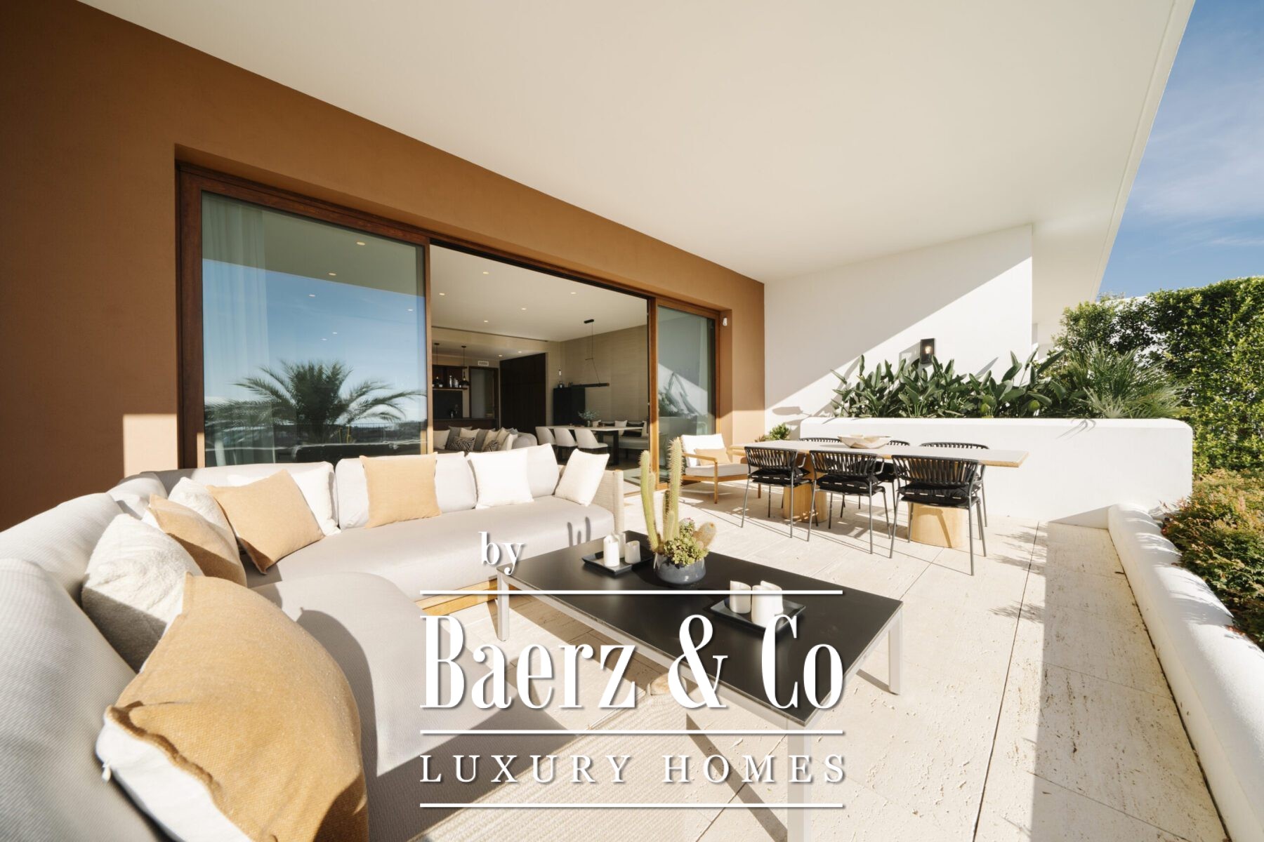 This luxury apartment includes three spacious en-suite bedrooms, each adorned with warm sand-toned Carrara marble bathrooms, complete with double sinks and showers. The master suite boasts a bespoke walk-in closet, a bathtub, and an immense window that opens directly onto the terrace. Characterful wooden finishes and high-quality materials throughout enhance the inviting atmosphere. The muted palette in sandy tones creates a warm aesthetic, harmonising beautifully with the natural surroundings.