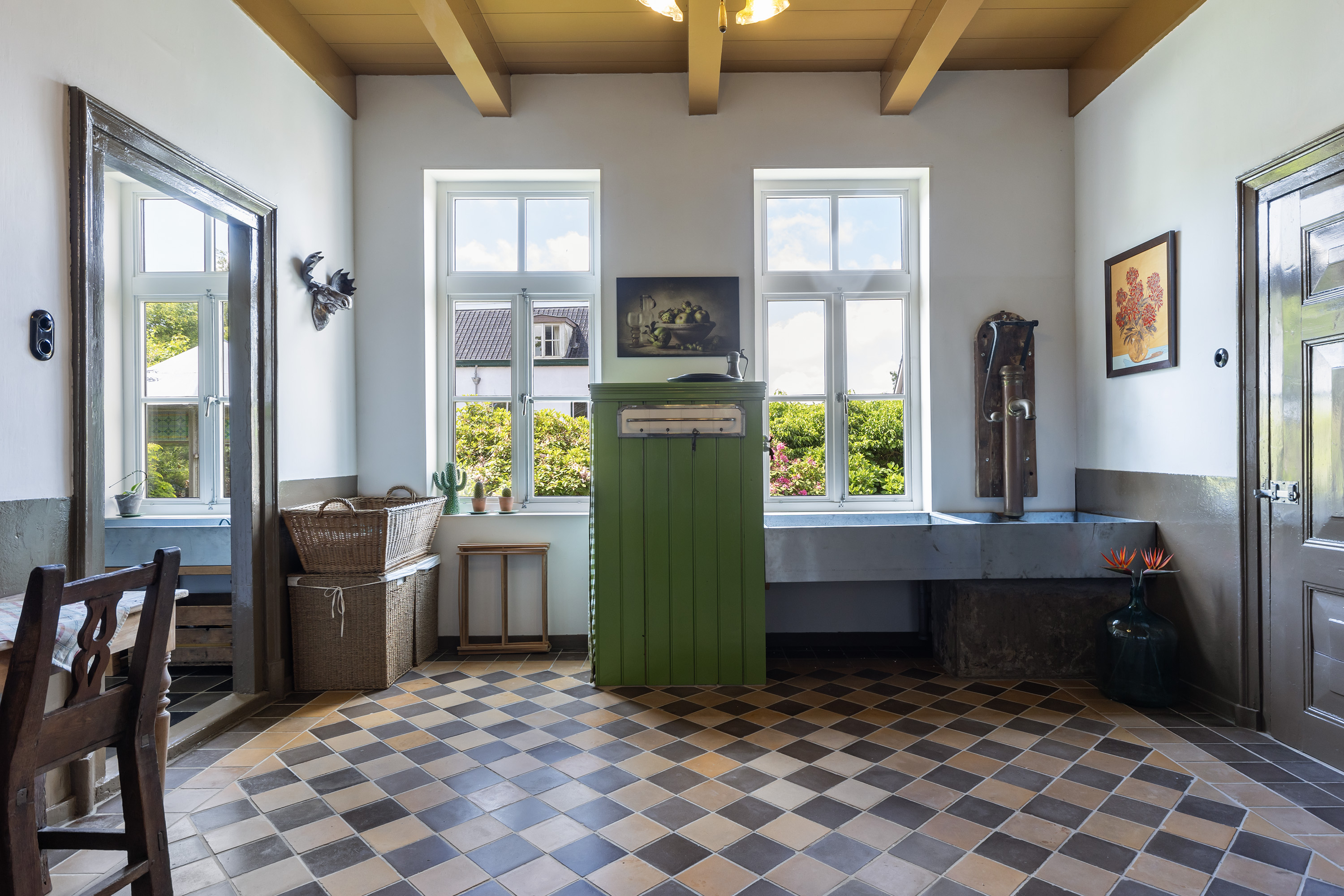 De badkamer op de begane grond is ingericht met toilet, wastafel, badkuip en een douchecabine. Via de keuken is de praktische bijkeuken bereikbaar, voorzien van originele tegelvloer, een pomp, wastrog en dubbele spoelbak, evenals de aansluitingen voor wasapparatuur en volop bergruimte.