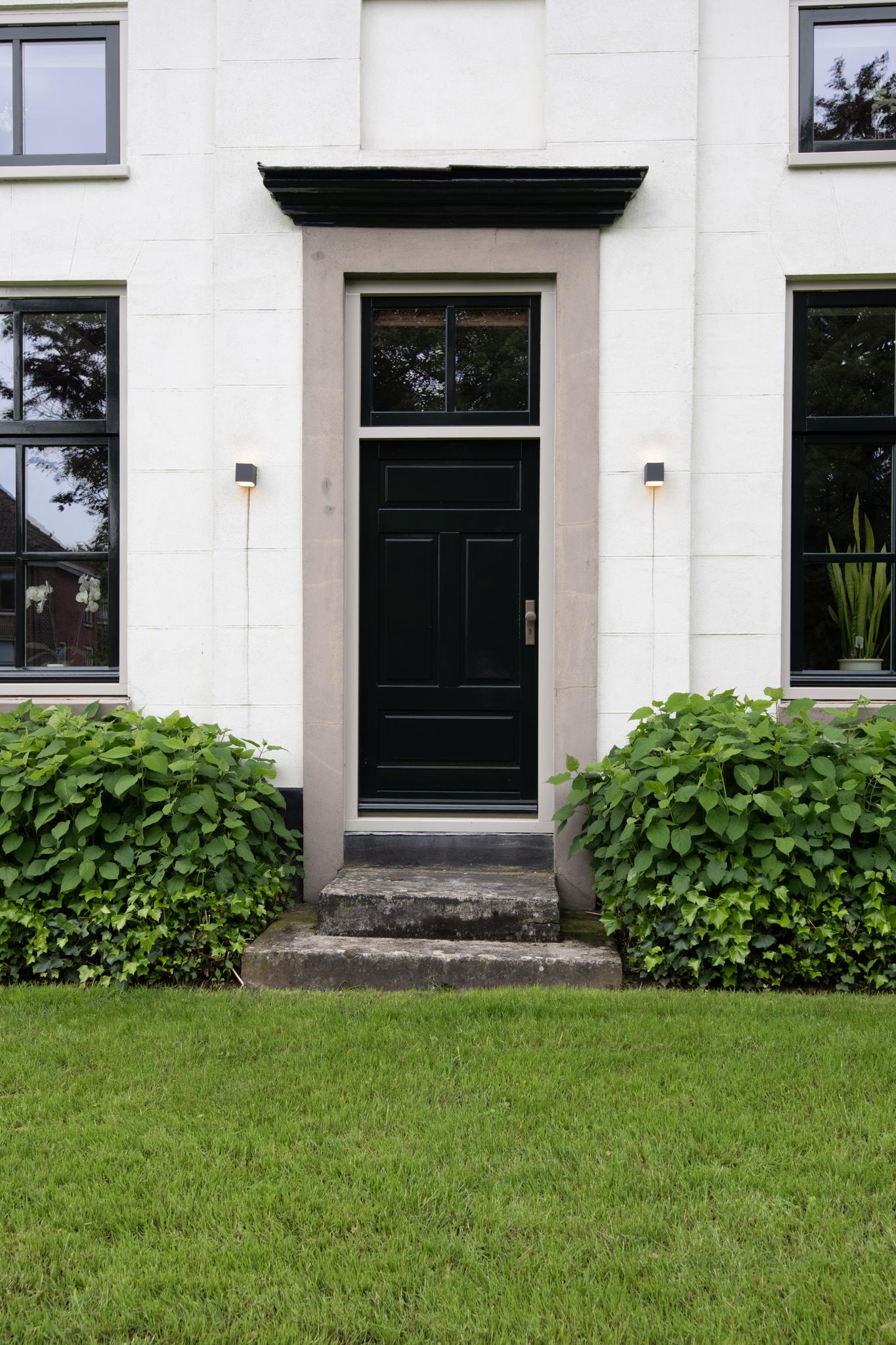 Aan een centrale gang die het achterhuis in tweeën deelt, zijn aan het einde twee openslaande deuren die uitkomen onder de Gelderse overstek. Het beschut gelegen terras is de favoriete plek om de dag in de ochtendzon te starten.