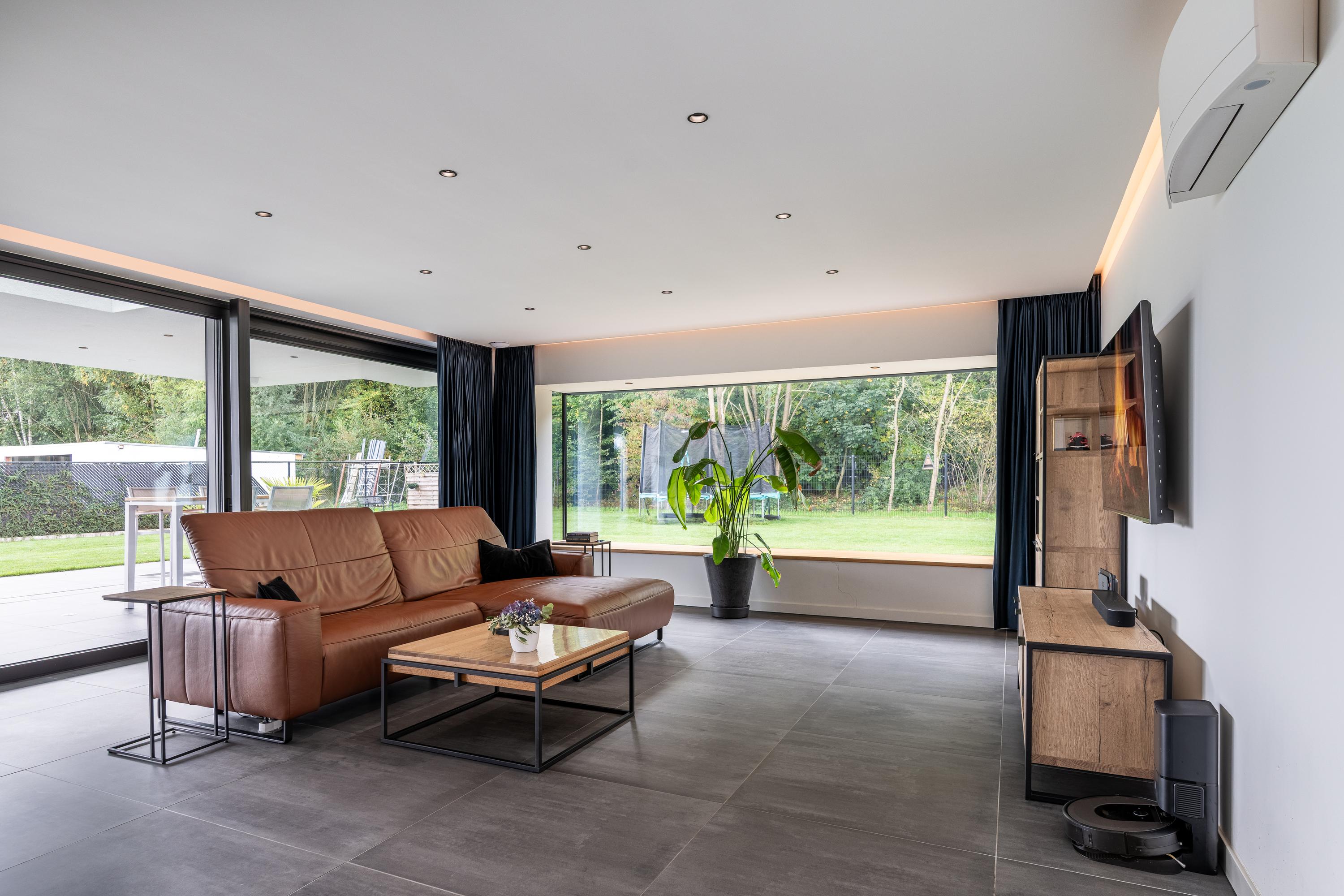 Een bijzonder detail is het grote bloemenraam, dat zorgt voor een speelse doorkijk naar de tuin en de bosrand. In combinatie met de grote schuifpui naar het overdekt terras ontstaat een ruimtelijk en open geheel, waarin binnen en buiten op harmonieuze wijze in elkaar overlopen. De woonkamer en keuken zijn beide voorzien van een airco unit.