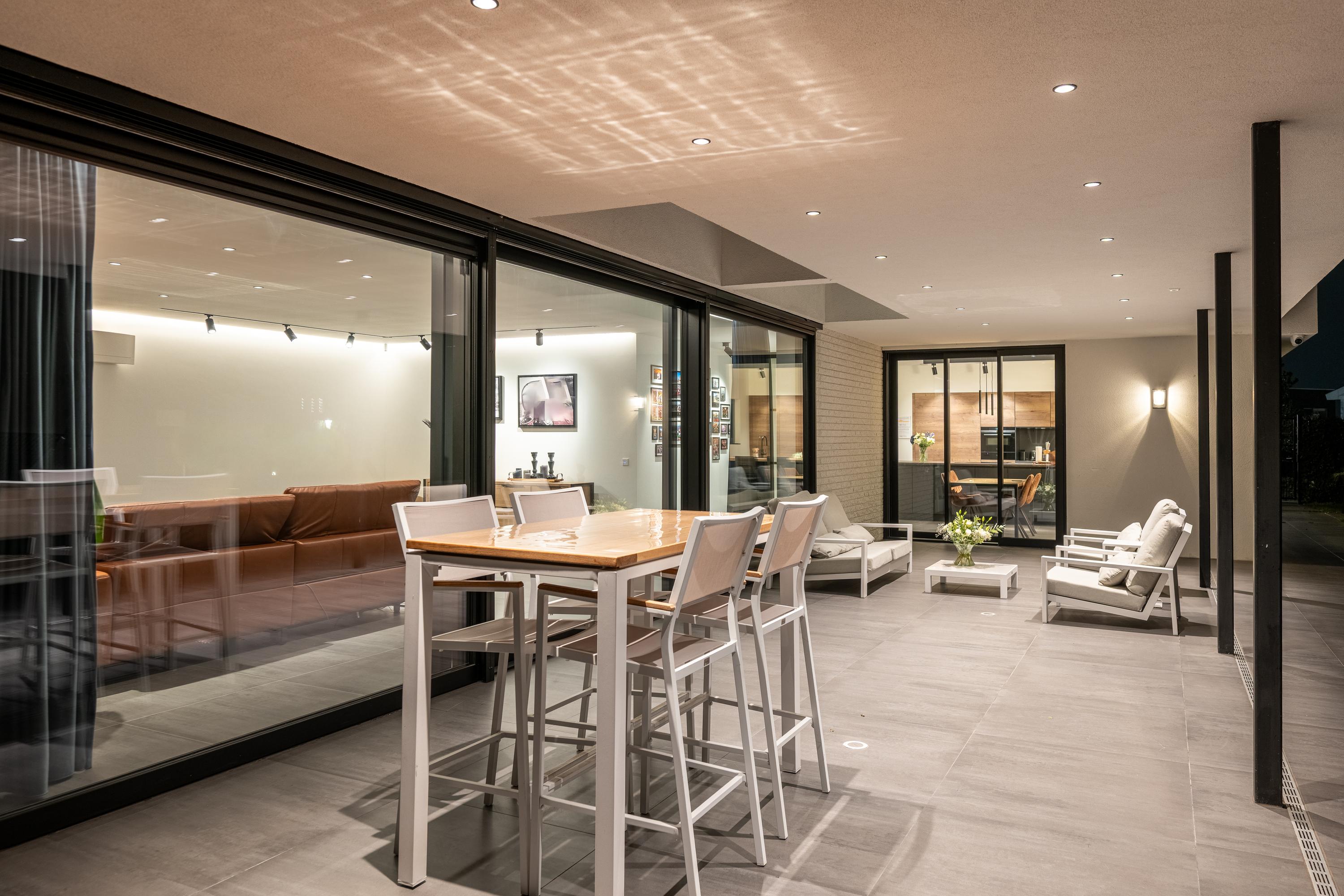 Dankzij de ruime overkapping geniet men hier van schaduw op zonnige dagen en comfortabele beschutting bij minder weer. De inbouwspots in het plafond zorgen 's avonds voor een warme, uitnodigende sfeer.