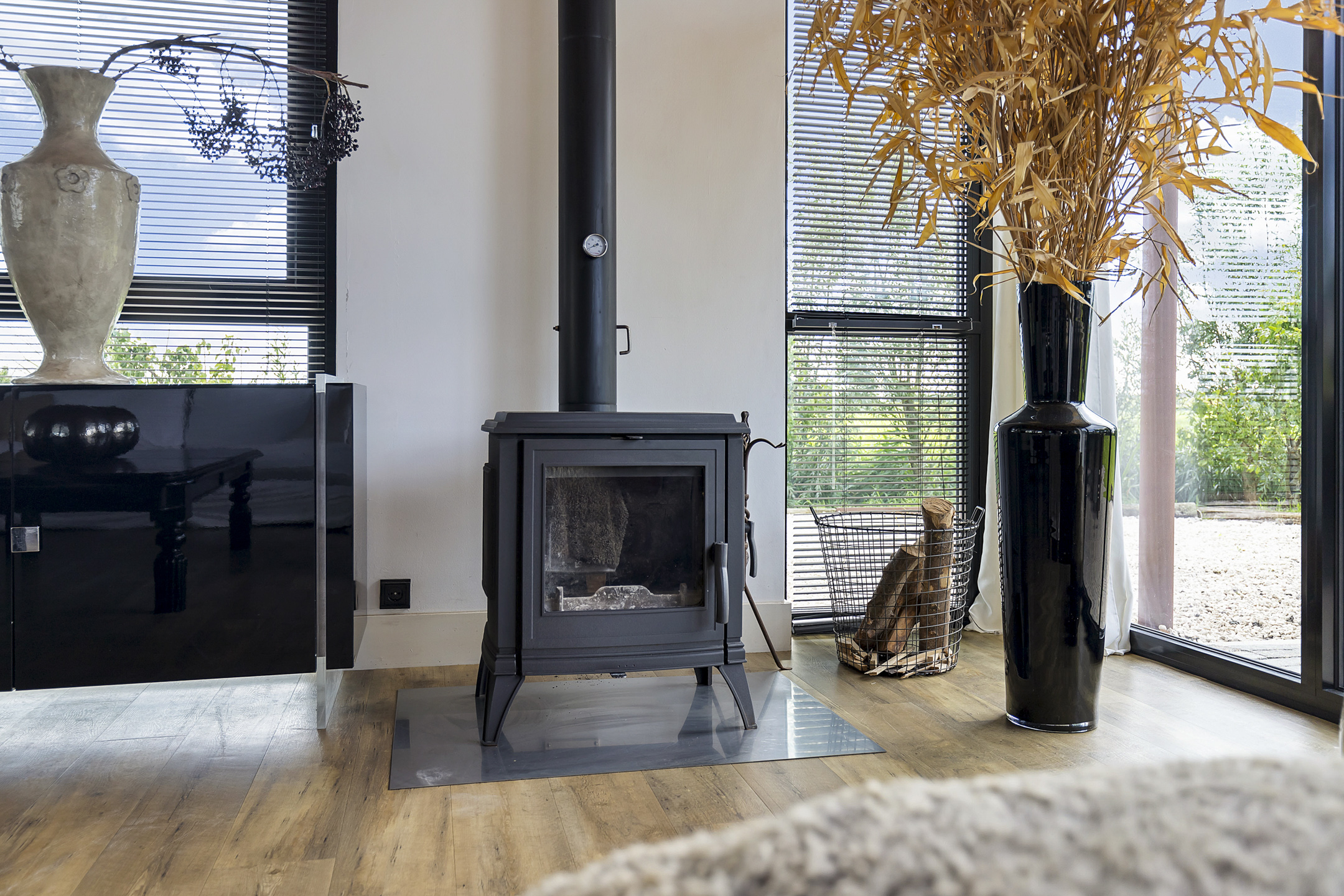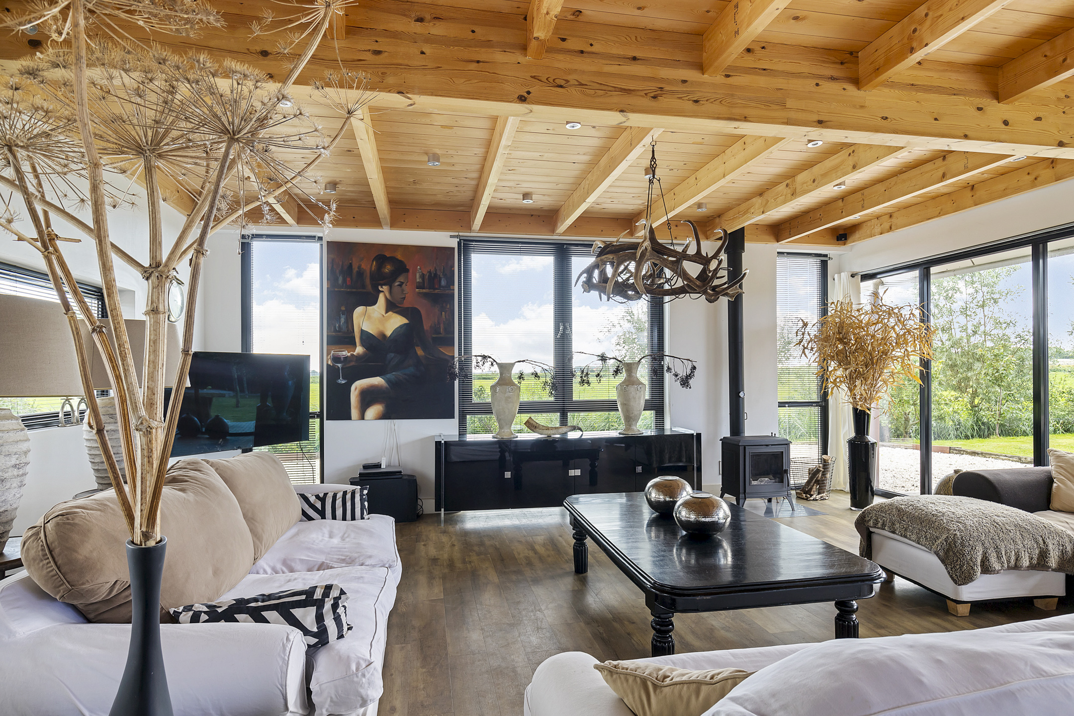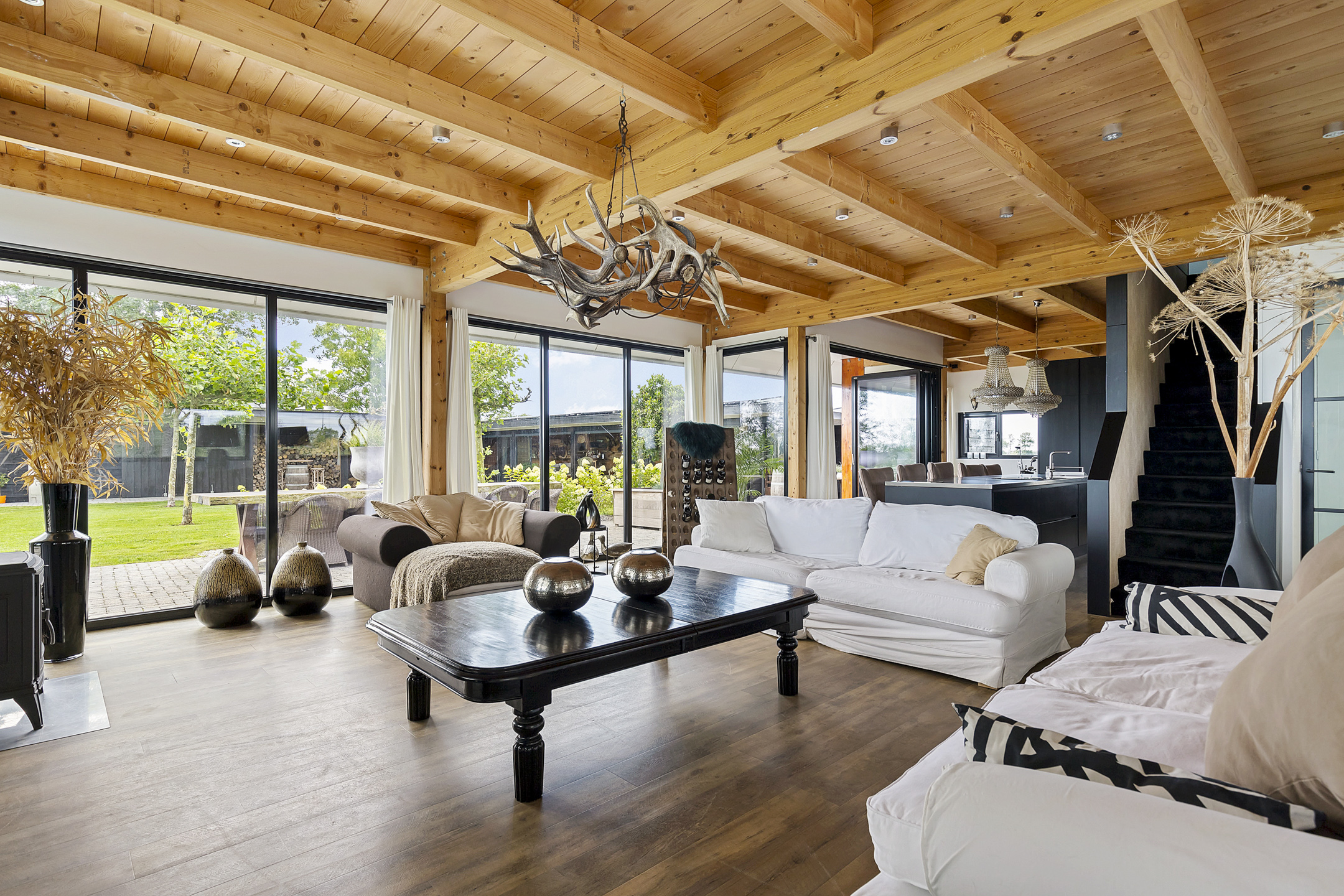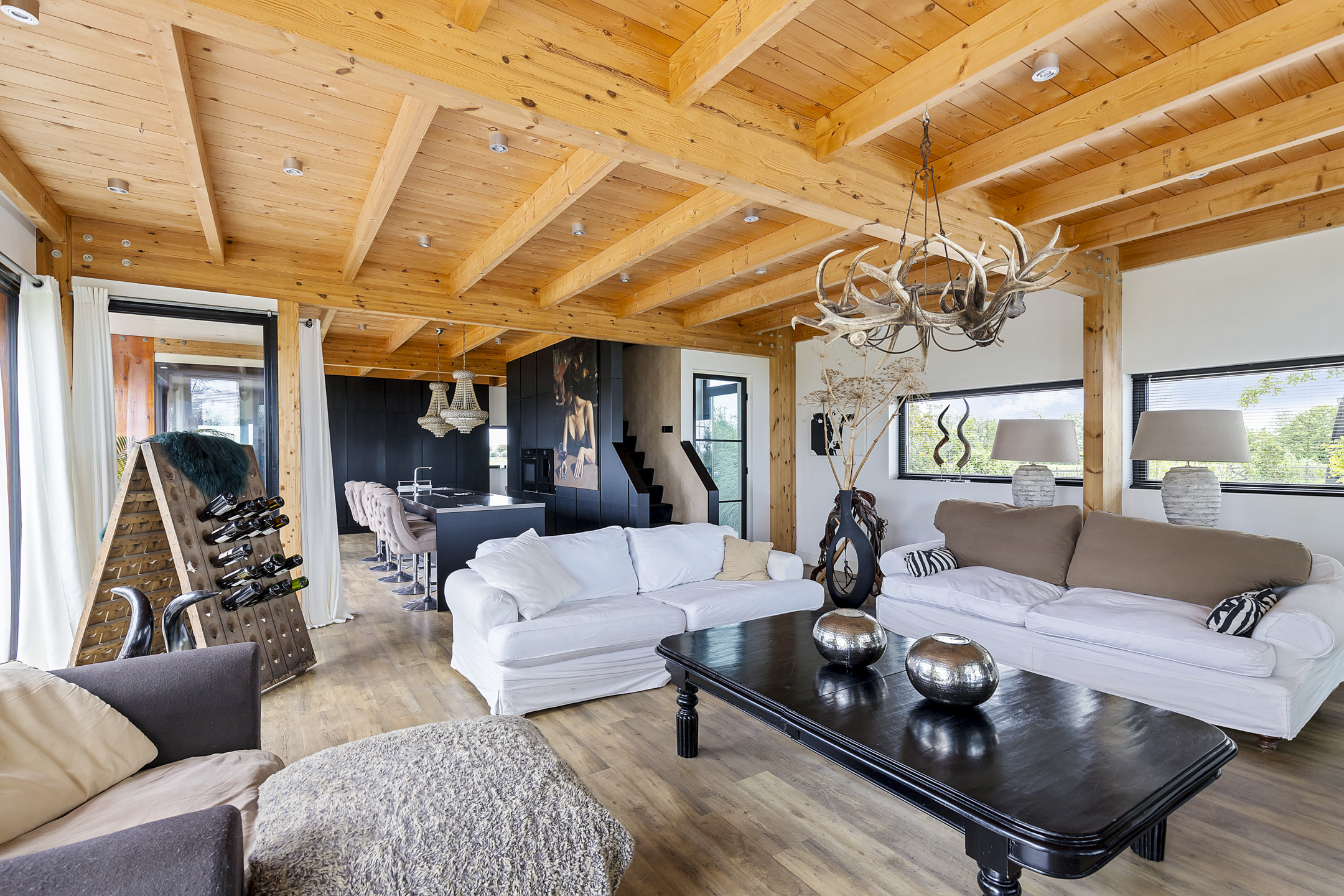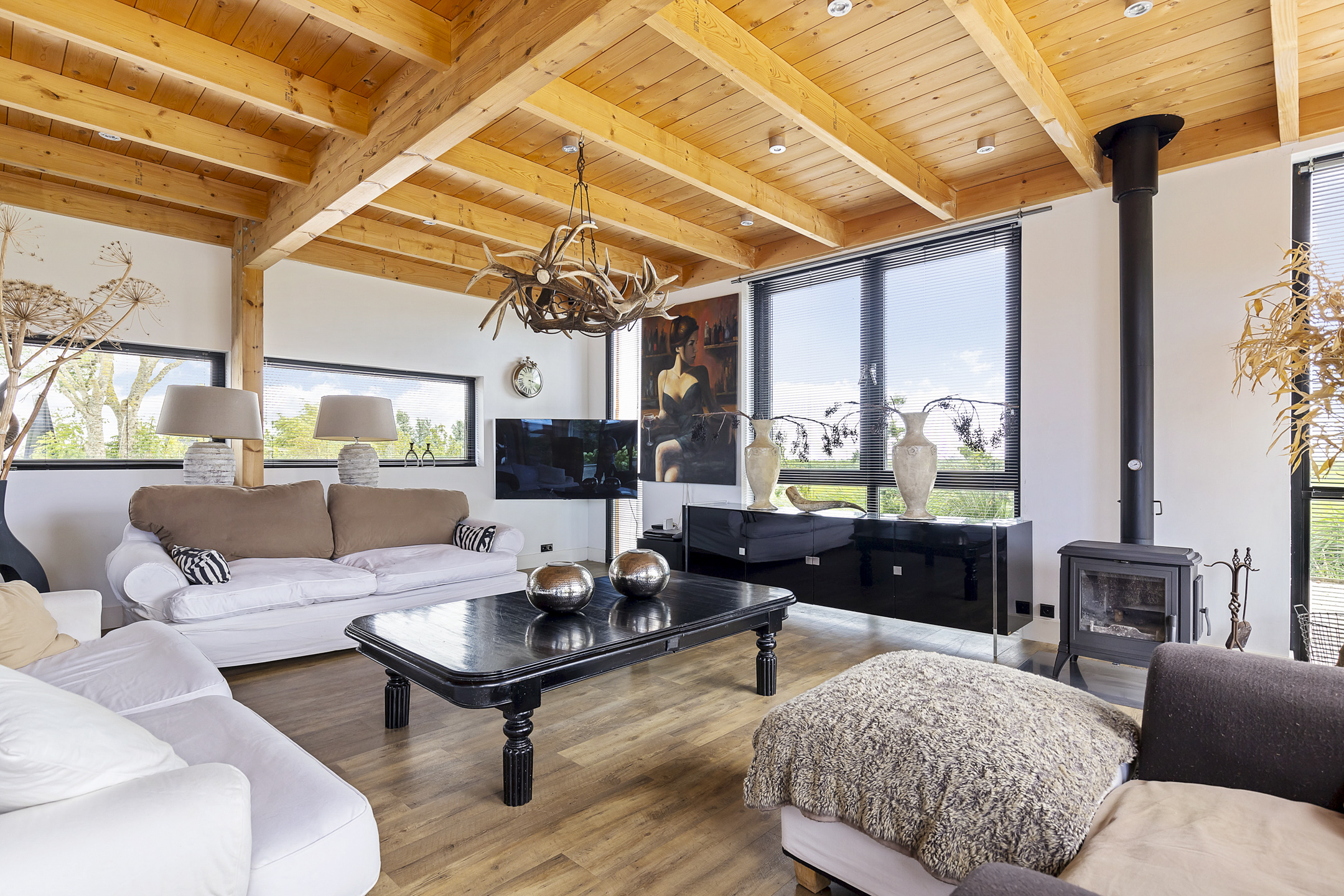 De woonkamer is gelegen aan de zonnige Zuidwest kant van de woning. Wanneer je deze lichte ruimte binnen komt voel je je direct thuis. Dat komt door de sfeervolle hoge houten plafonds met prachtige zware balken, de gezellige loungehoek bij de houtkachel en de kamerhoge raampartijen die vanuit elke hoek eindeloos zicht bieden op de natuur; de stijlvolle tuin, de fruitbomen, de dieren in de weide, het wild rond de woning en de immer veranderende Friese luchten. Verkeer is hier niet!