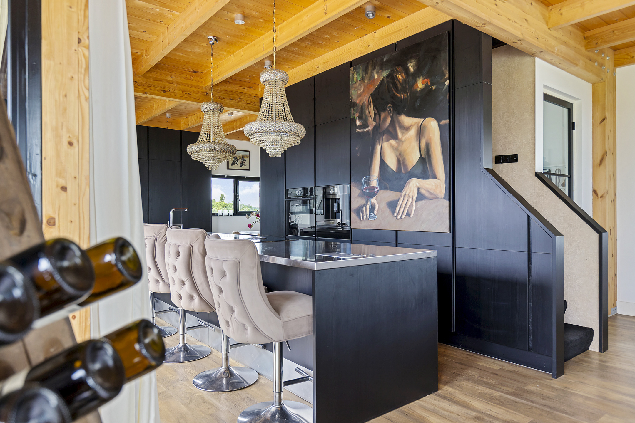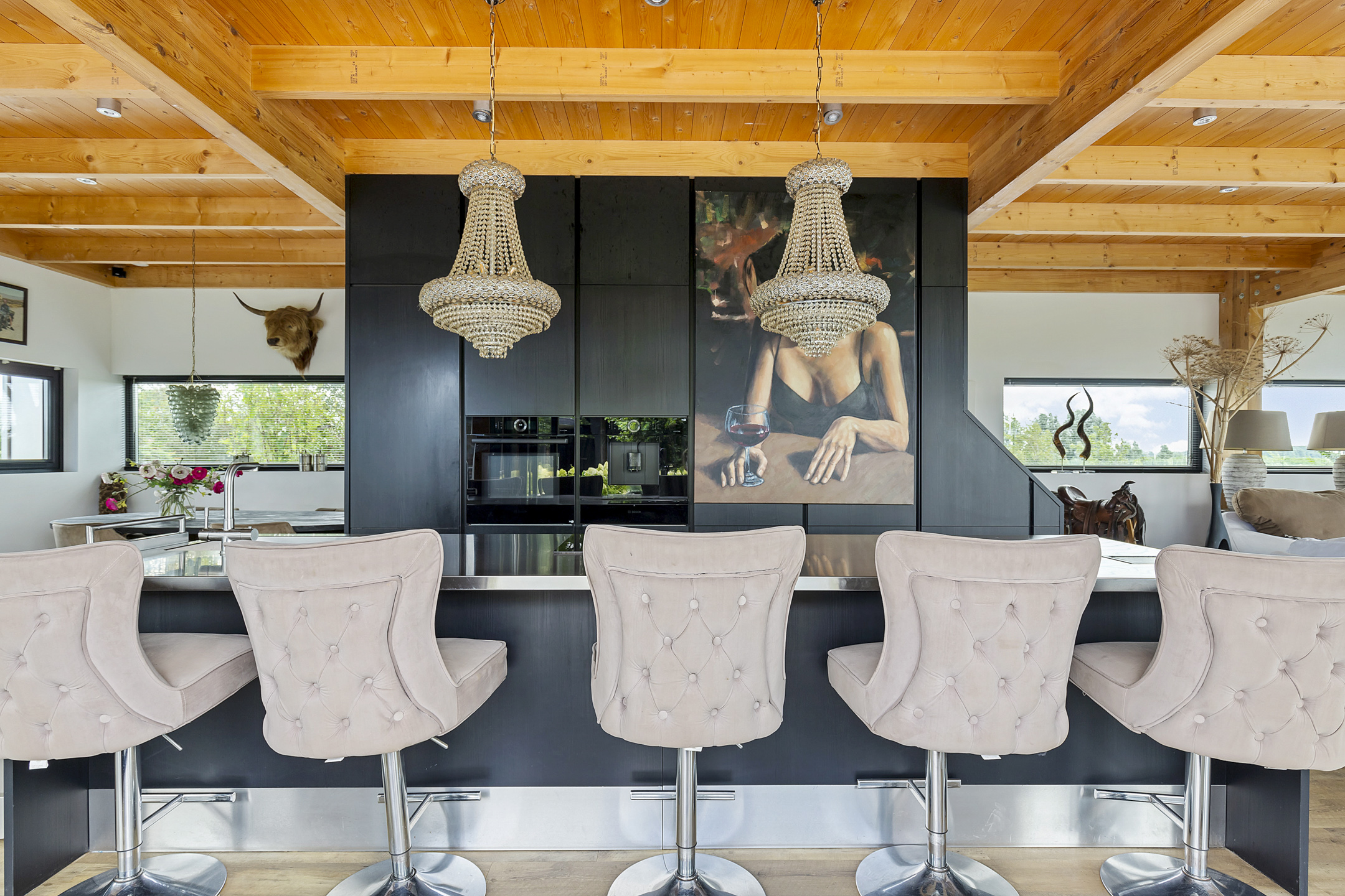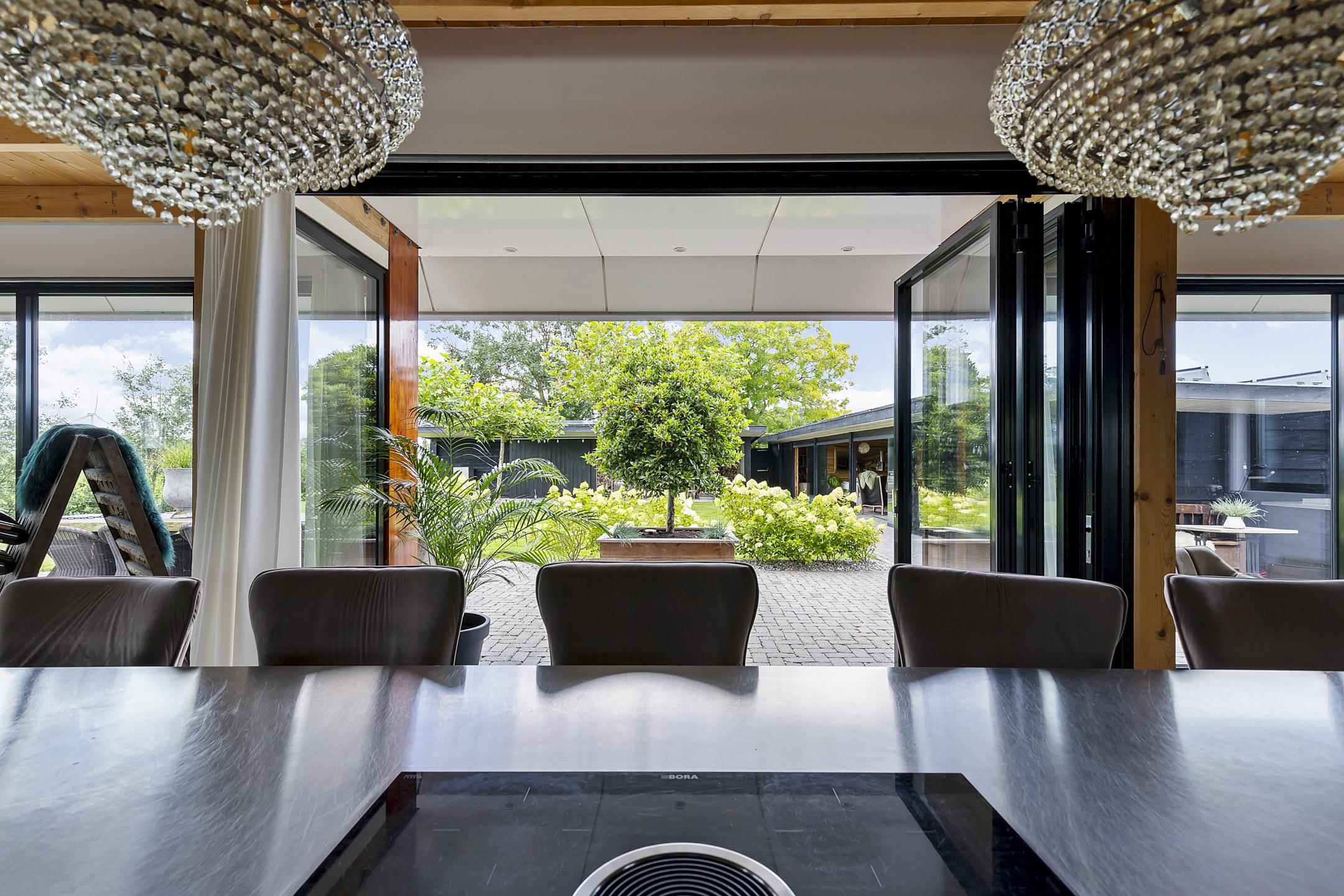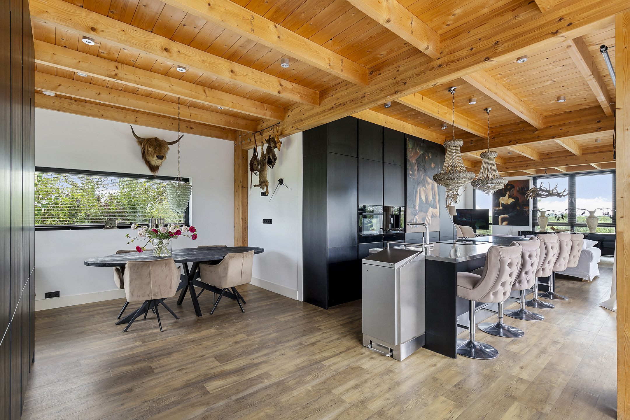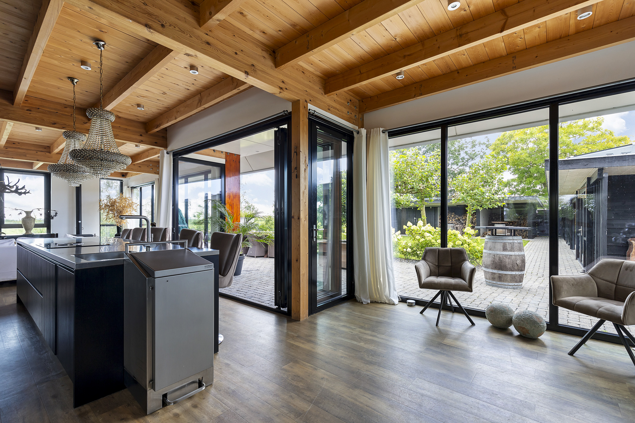 De open leefkeuken is een feest an-sich.. een plek waar tijdens het koken veel wordt geborreld. De open glazen harmonica schuifdeuren aan het inpandig terras staan nagenoeg altijd open dankzij de luwe ligging door de in carré opgestelde bijgebouwen. Zo wordt de tuin volledig bij de binnen leefruimte betrokken. De keuken heeft een met stoer RVS kook-/spoeleiland en is voorzien van alle luxe; een grote inductie kookplaat met geïntegreerde afzuiging, een extra grote spoelbak met kokend waterkraan, en de strakke zwarte kamerhoge kastenwand heeft een geïntegreerde koffiemachine en combi-oven. De bijkeuken, voorzien van de witgoedaansluiting, is smaakvol verborgen in de uitbouw achter een kastenwand in dezelfde stijl als de keuken.