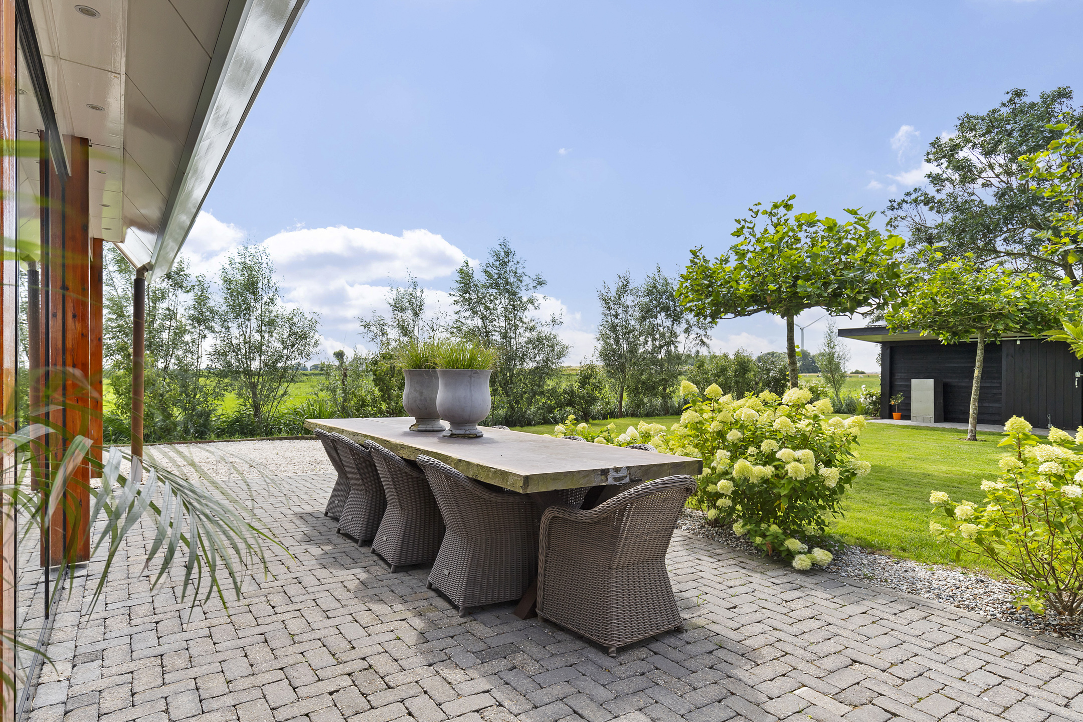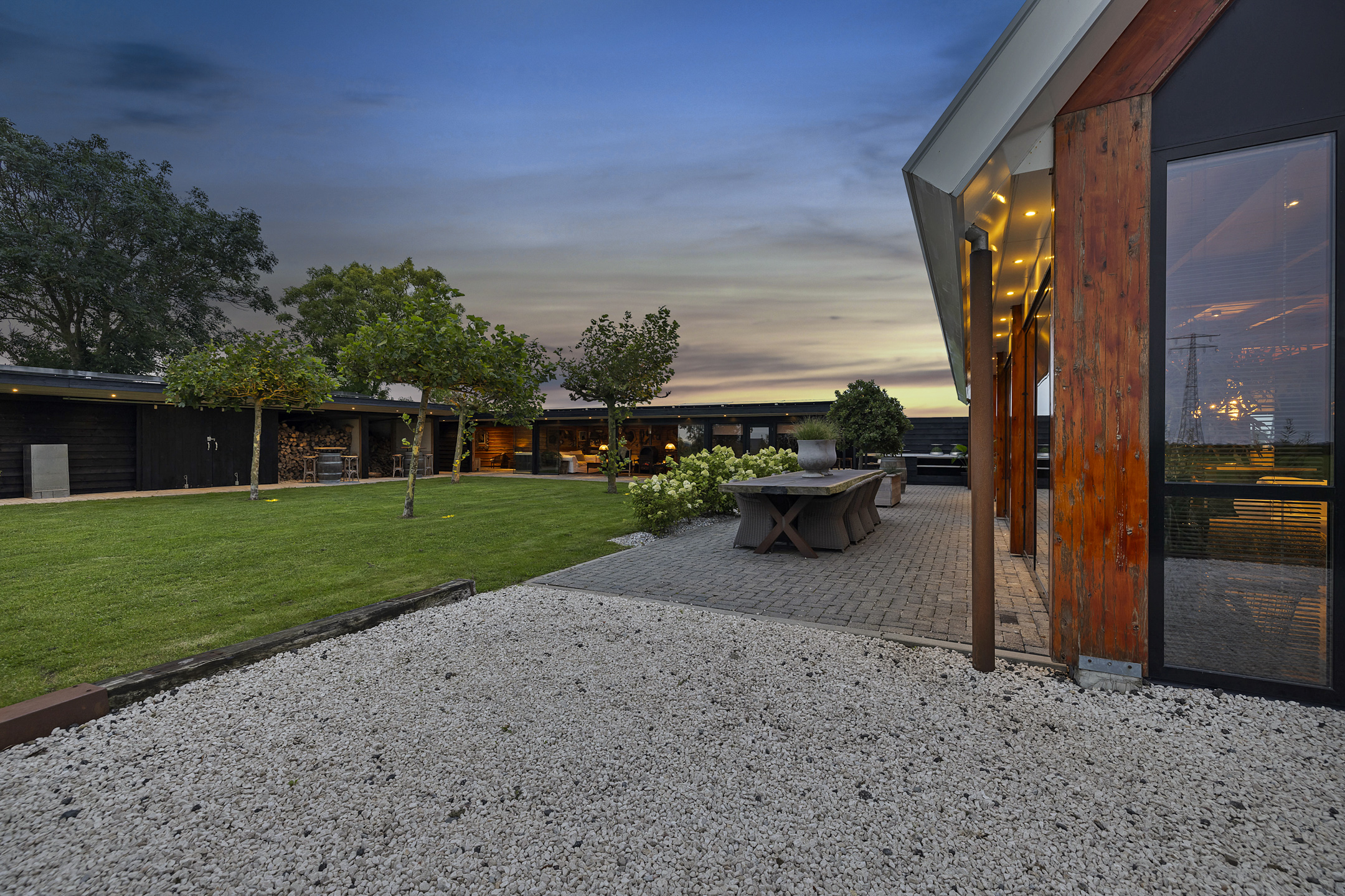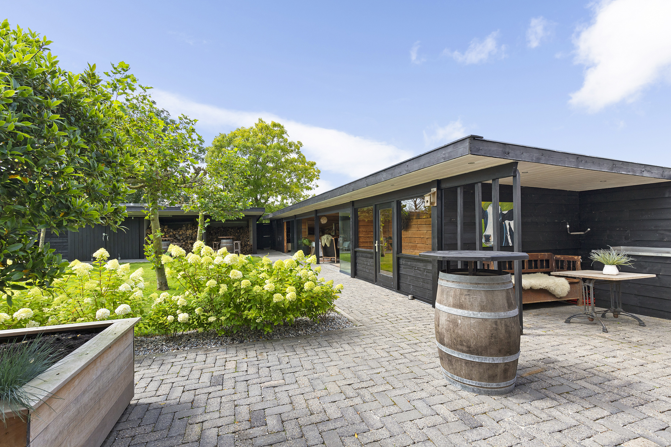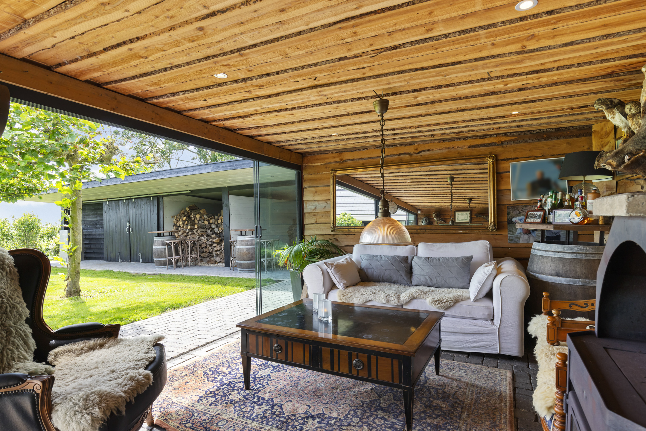 De met de woning in carré opgestelde bijgebouwen geven de tuin een besloten intieme sfeer. In het stijlvol houten geïsoleerde tuinhuis met 3 glazen schuifpuien en brede overkapping zijn een ware jachthut en wellnessruimte gesitueerd. De buitenkeuken verbindt het geheel met het woonhuis. Indien gewenst is dit op eenvoudige wijze inpandig te maken.