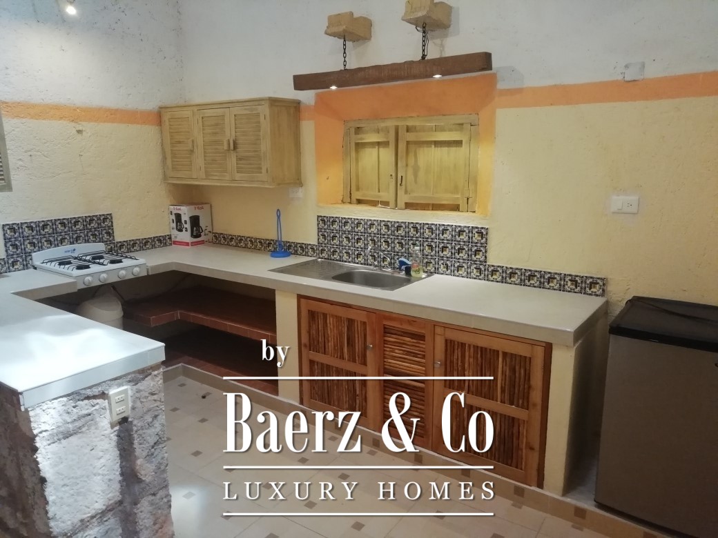 There is another fully equipped one bedroom house with nice living area, full kitchen, and huge bath that can be used for long-term rentals. The palm thatched palapa covers the lounge and bar that sits next to the huge, beautiful pool. The lush, natural, tropical garden is full of exotic fruit trees and beautiful plants. There are also six horse stables that can be easily converted to more rooms, a gallery, a spa, or whatever your imagination can dream up. A 13.6 KW solar system was recently added to cover the electricity for a large part of the property.