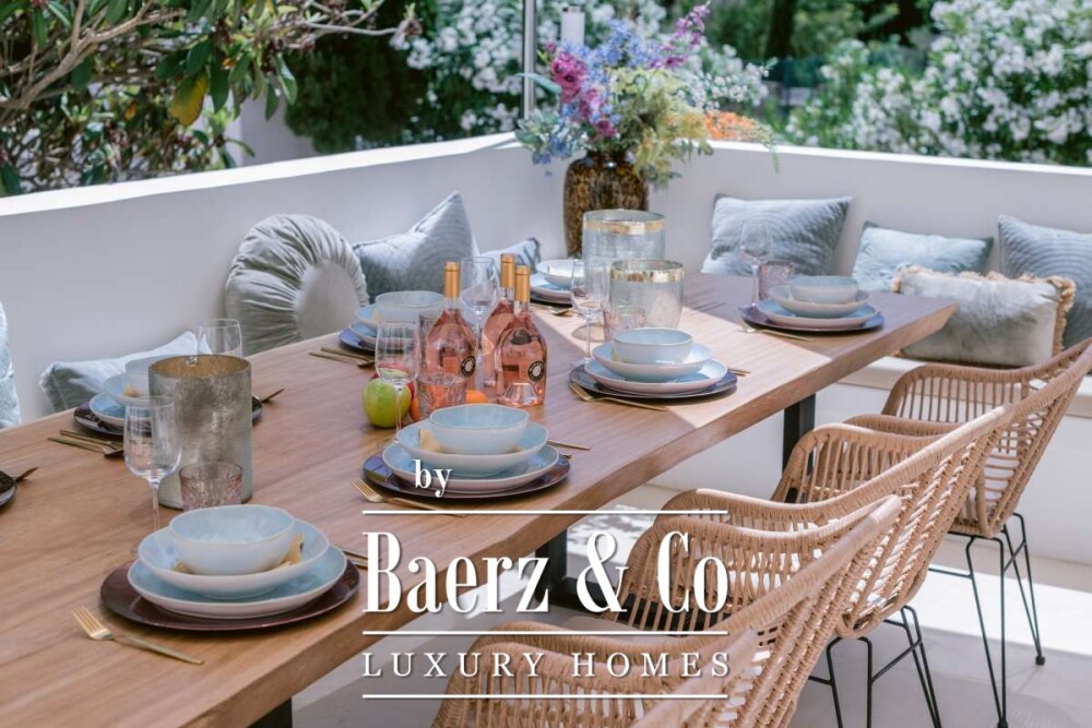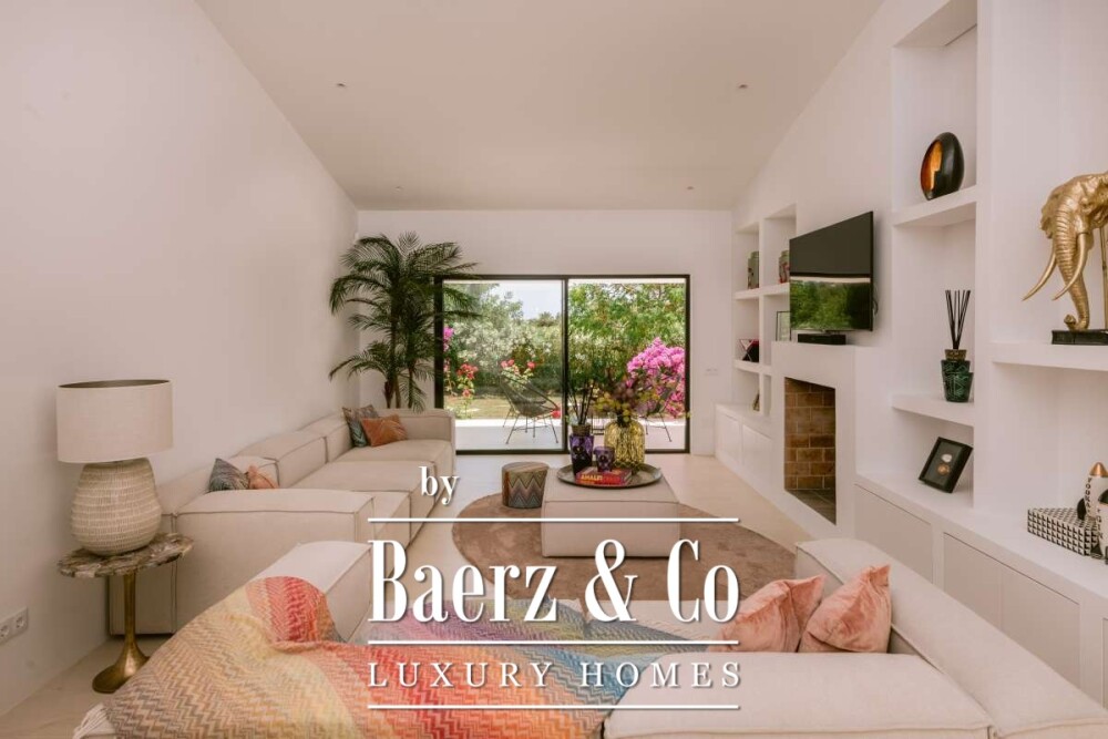 De omgevingOp ongeveer vier kilometer afstand van Ibiza-stad, ligt het idyllische dorp Jesús. In de omgeving liggen de stranden Talamanca en S’Estanyol, in de volksmond ook wel Cala Bonita genoemd. Het centraal gelegen dorp beschikt over allerlei voorzieningen, diverse horeca en een sportschool. De villa Onlangs is deze villa volledig gerenoveerd, waardoor u het object direct kunt betreden. De residentie is verspreid over één etage en heeft een bepaalde sereniteit over zich, dit komt door de minimalistische inrichting, het gebruik van veel wit en natuurlijk lichtinval. De imposante deur van hout valt direct op en deze steekt stijlvol af tegen de kraakwitte muren. Via de hal komt u uit bij de ruime woonkamer met karakteristieke vakken in de muur en haard. Er is een grote, open keuken met een royaal kookeiland, een wijnkoelkast en hoogwaardige inbouwapparatuur van Bosch en Gaggenau. Er zijn vijf slaapkamers en vier badkamers. Drie suites beschikken over een badkamer en-suite. Eén van de slaapkamers bevindt zich in een appartement met een eigen entree, keuken en badkamer. Een ideale plek voor een nanny of als gastenverblijf. Ook is er een riante kelder en een ondergrondse garage waar met gemak drie tot vier auto’s kunnen parkeren. De buitenruimtesDe villa biedt een schitterend zicht op Dalt Vila vanaf het royale dakterras, dit panoramische zicht is spectaculair. Hier staat tevens een jacuzzi en in de tuin vindt u een groot zwembad dat door zonne-energie is verwarmd. Er is een buitendouche, barbecue en er zijn verschillende terrassen. De tuin biedt een prachtig aanbod aan vegetatie, met veel fruitbomen zoals een citroen- en sinaasappelboom. Het plot is volledig omheind en beveiligd met een toegangspoort.
