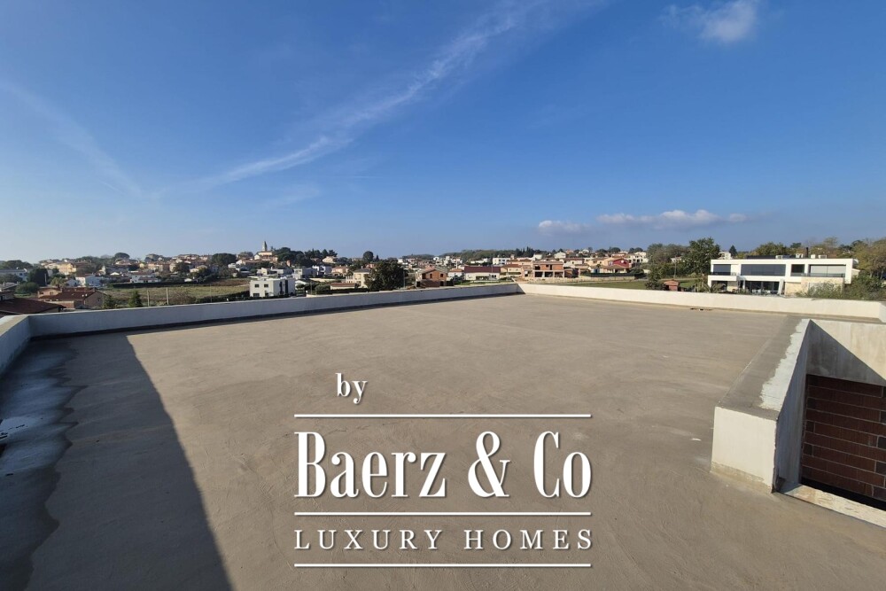 Op de tweede verdieping bevinden zich vier slaapkamers met eigen badkamers, ieder met toegang tot terrassen die het omliggende landschap omlijsten. De master suite beschikt over een privékleedkamer en een serene verbinding met buiten. Via een buitentrap bereikt u het dakterras, waar een jacuzzi, zonneweide en loungeterras een weids uitzicht over de Adriatische Zee bieden.
