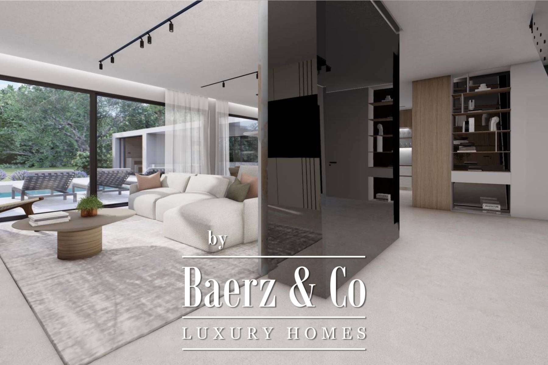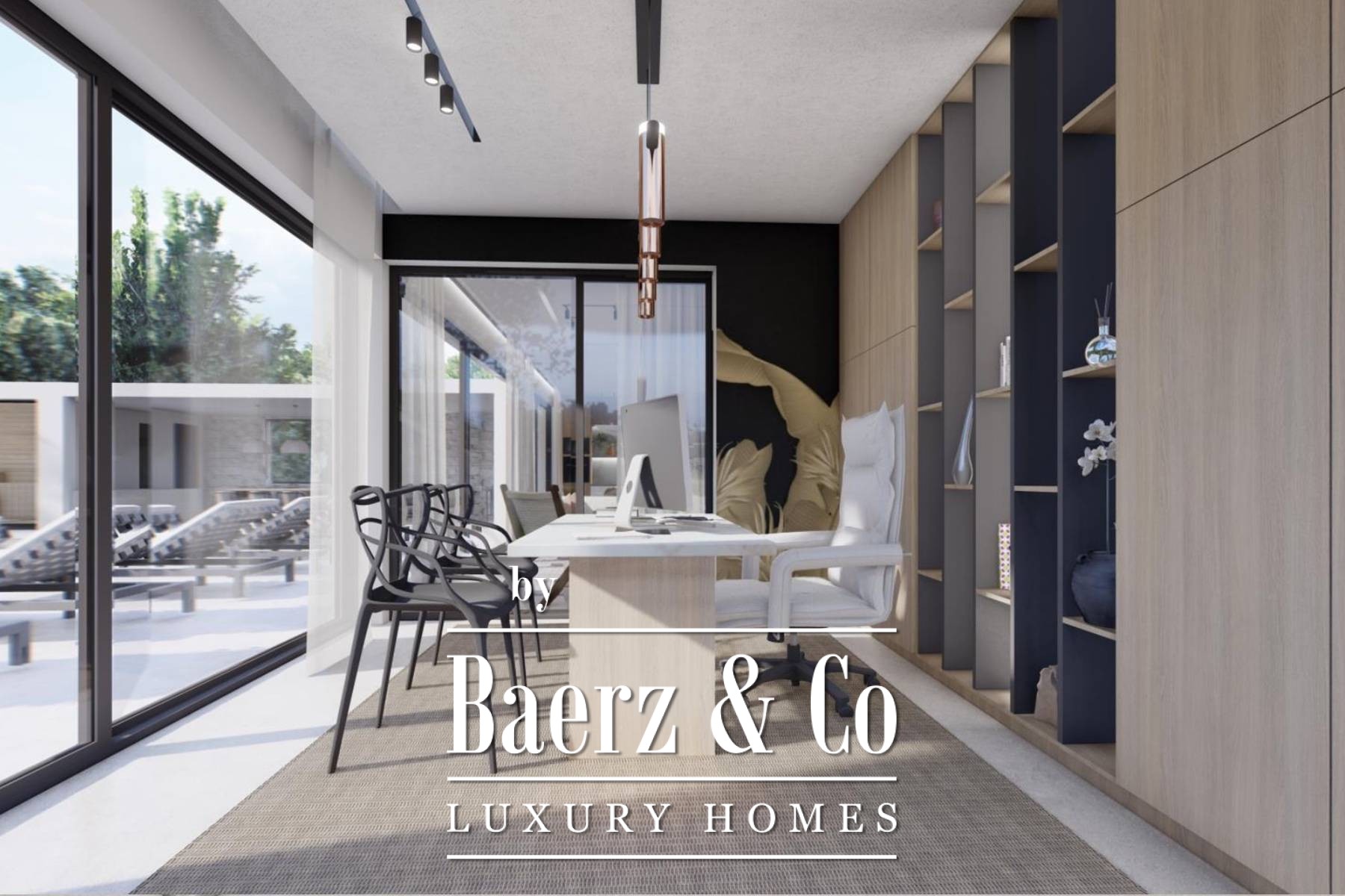 Het architectonische verhaal ontvouwt zich op de eerste verdieping met een doordachte entree, gastvoorzieningen en een open keuken met kookeiland, eet- en leefruimtes. Schuifpuien verbinden het interieur met het overdekte terras, het verwarmde zwembad, de buitenkeuken, de sauna en het zonneterras. Een privé-slaapkamer en een werkkamer completeren de zorgvuldig ingedeelde ruimte.